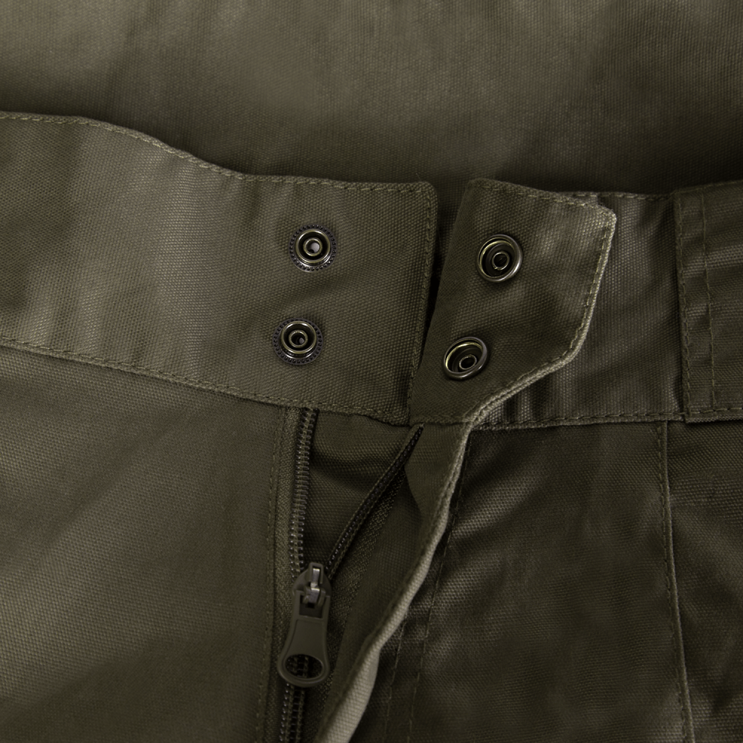 Штани мають високий пояс і анатомічні виточки в ділянці колін і сідла, забезпечуючи зносостійкість і свободу руху. Крім того, вони оснащені чотирма кишенями: двома спереду і двома на стегнах. Застібка штанів здійснюється за допомогою блискавки і двох заклепок, а низ можна регулювати за допомогою липучок. Капюшон забезпечений козирком і регульованими об'ємом і глибиною.