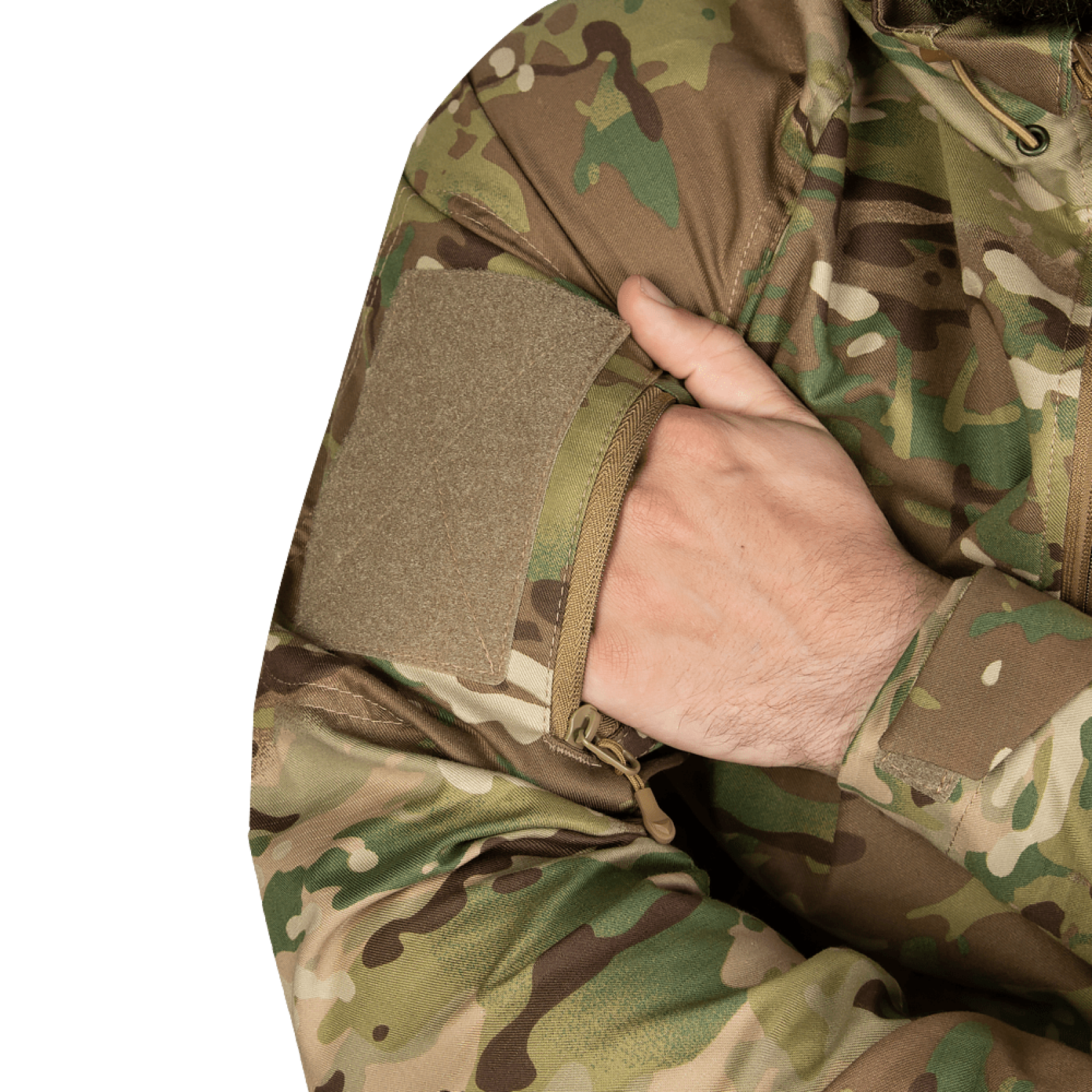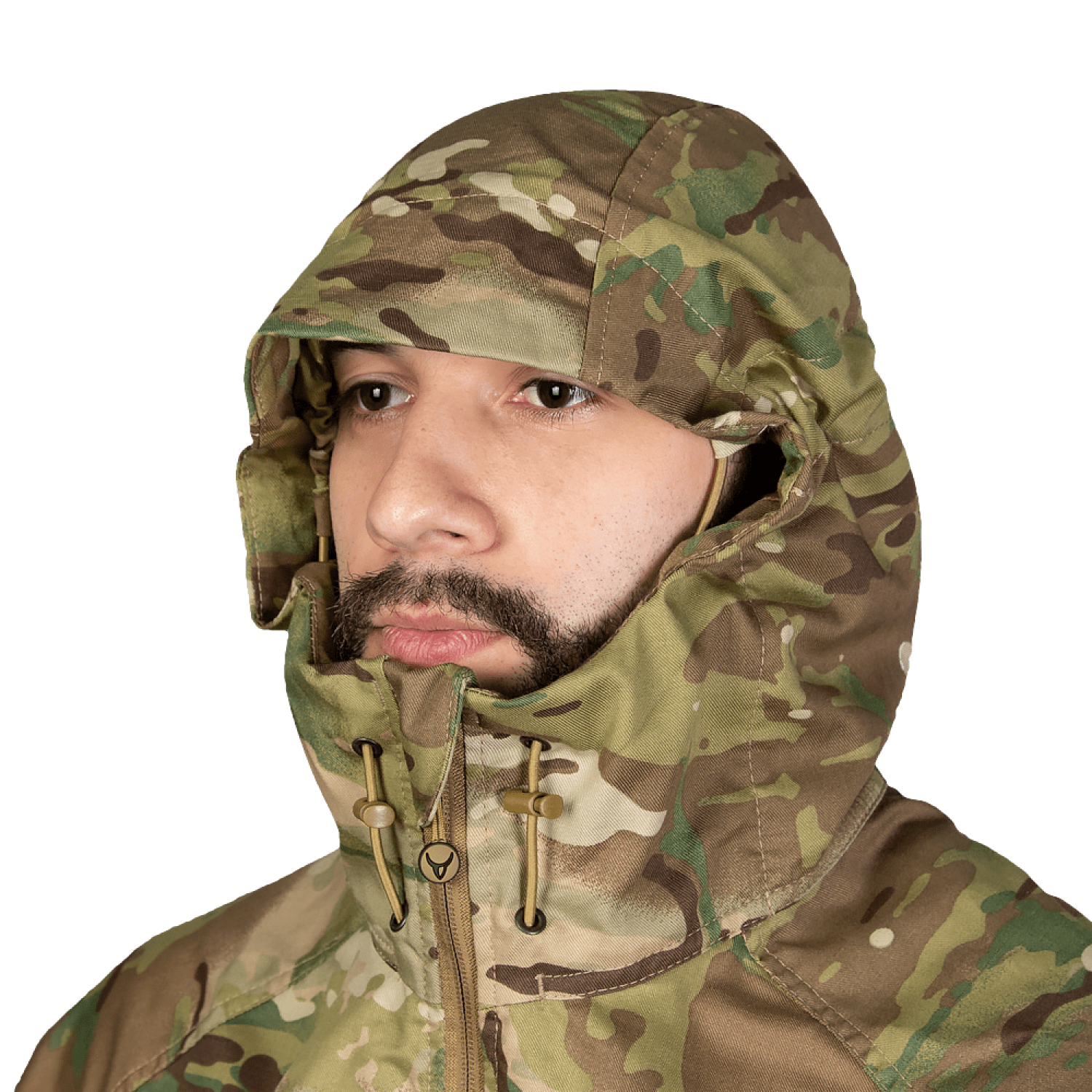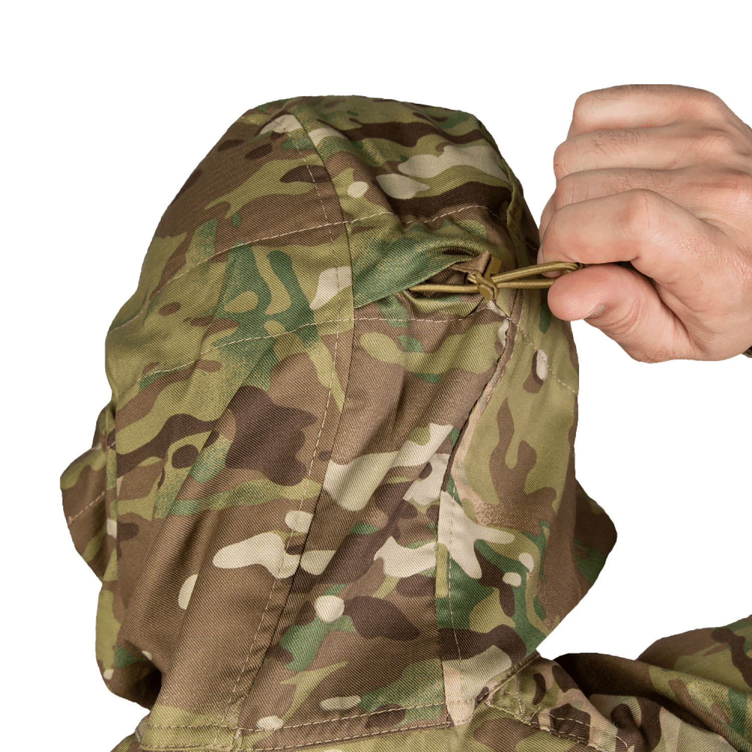 Куртка з капюшоном обладнана двома просторими кишенями спереду та двома на рукавах, які закриваються на липучки для патчів або шевронів. Усі блискавки оснащені зручними пулерами, забезпечуючи легкість використання в рукавичках. Захищений високий комір запобігає натиранню підборіддя. Для регулювання фіксації по низу куртки передбачені спеціальні утяжки з пластиковими фіксаторами. Обсяг рукавів можна легко регулювати за допомогою липучок. Капюшон із козирком також має затяжки для регулювання об'єму та глибини.