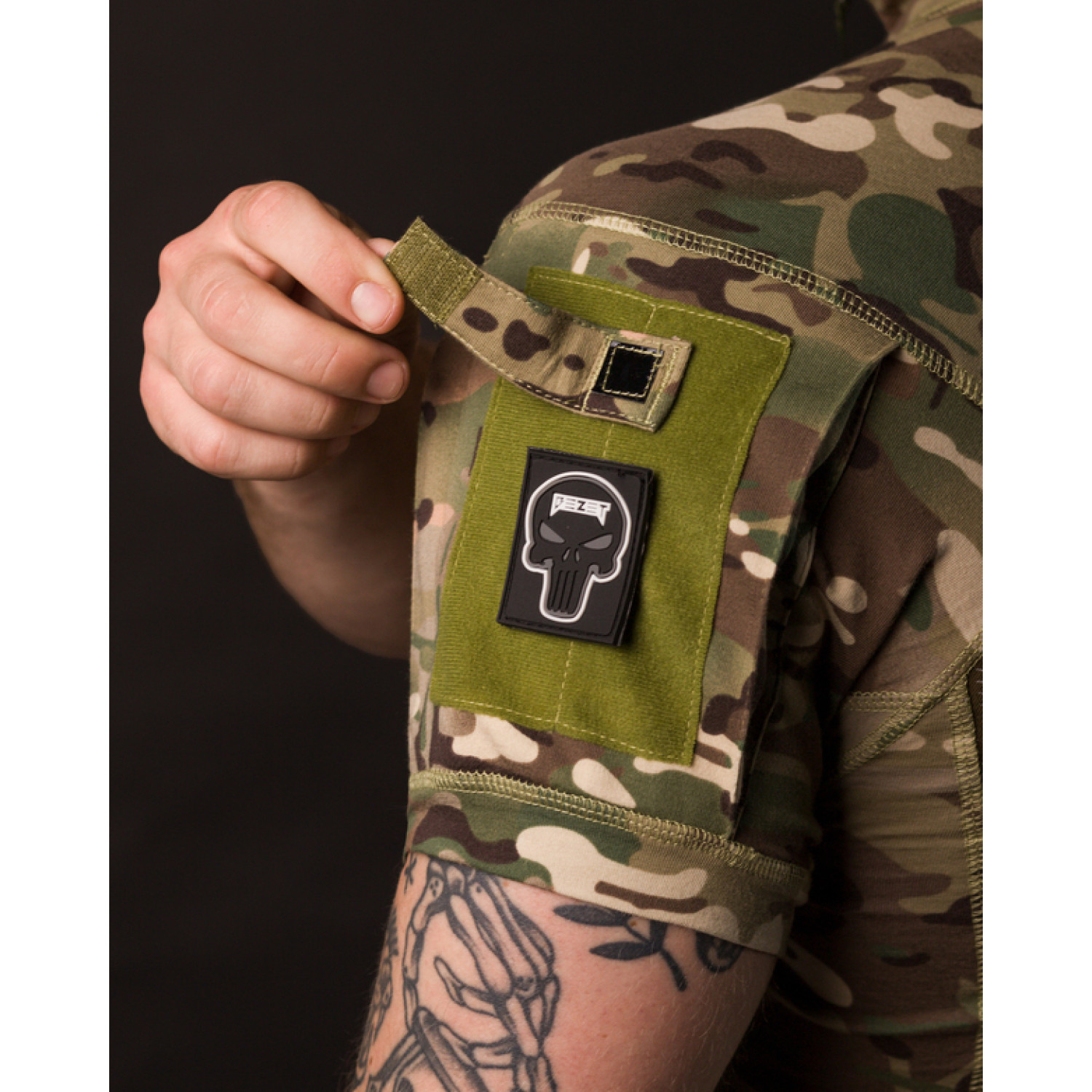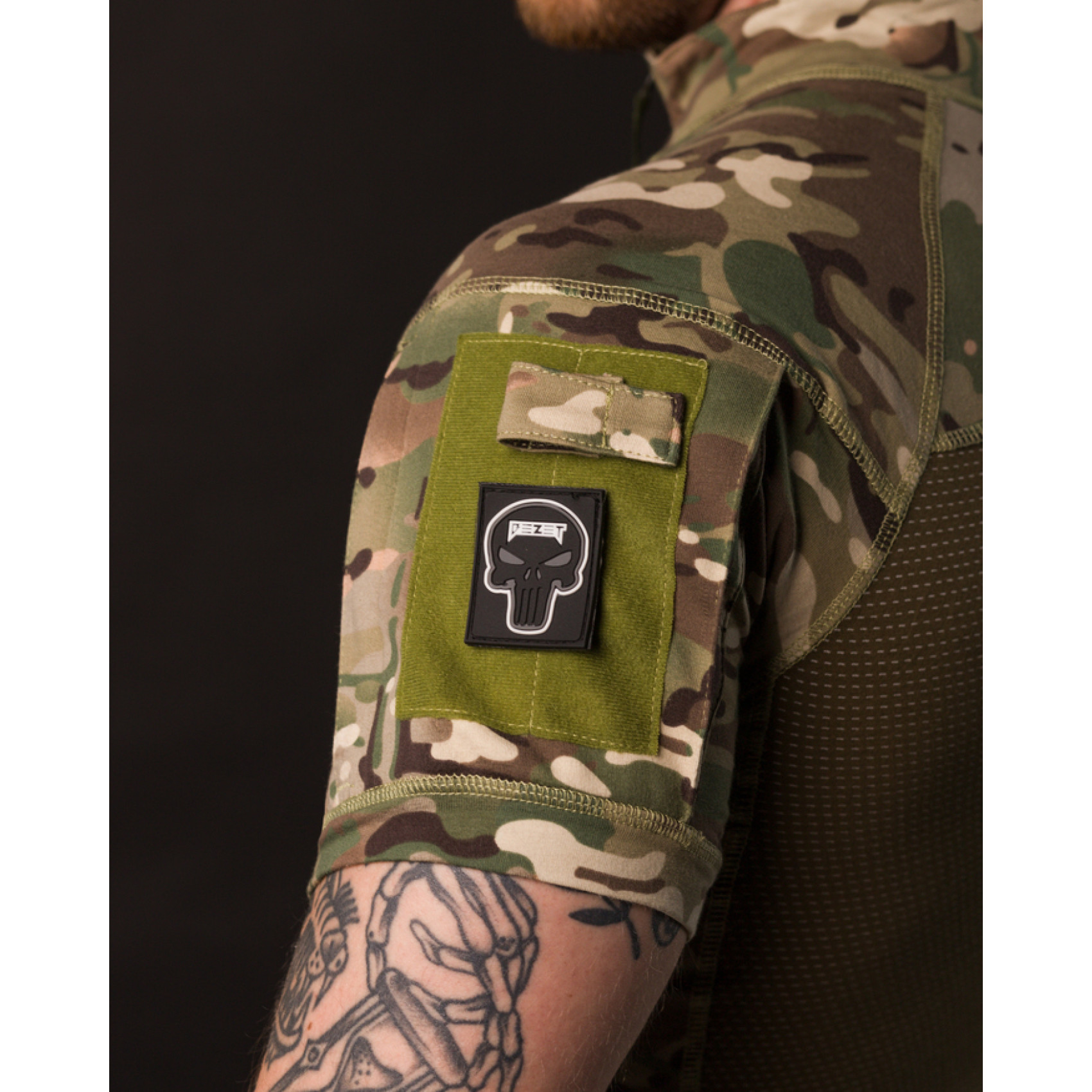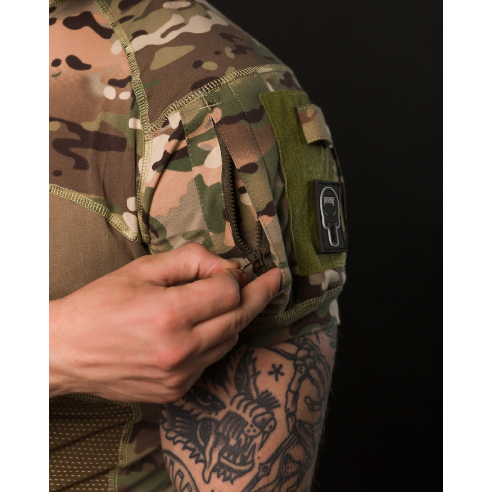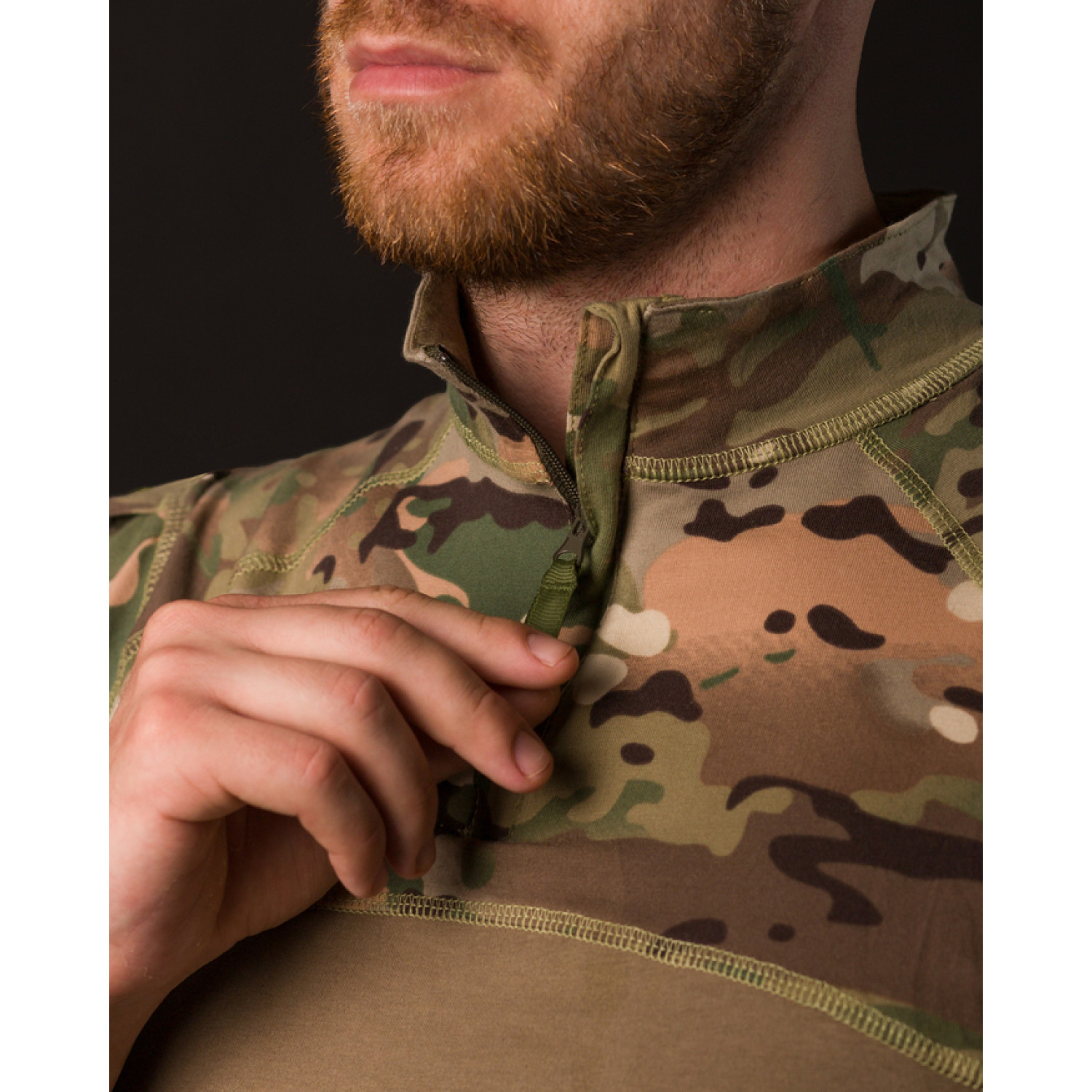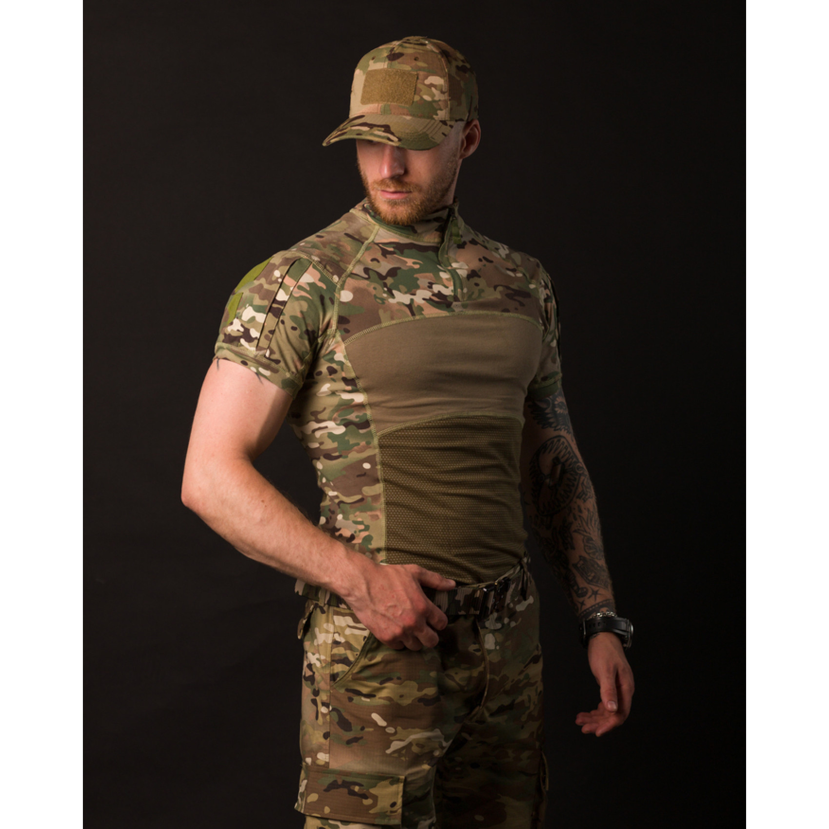 Футболка тактична чоловіча Bezet Fight Мультикам, це короткорукавна модель з коміром-стійкою, виготовлена з поєднання декількох текстур тактичних матеріалів.