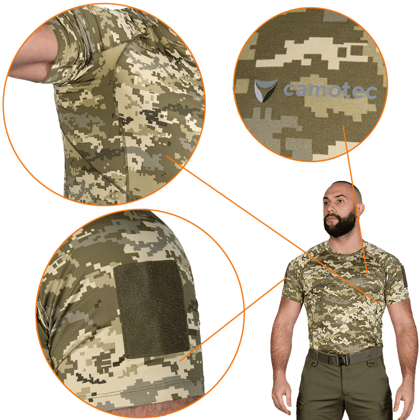 Футболка Camotec Thorax Patrol Піксель, яка ідеально вписується в концепцію пошарового одягання як перший базовий шар, завдяки своїм вологовідвідним властивостям. Її можна використовувати окремо як стильну формену футболку, завдяки липучкам на рукавах.