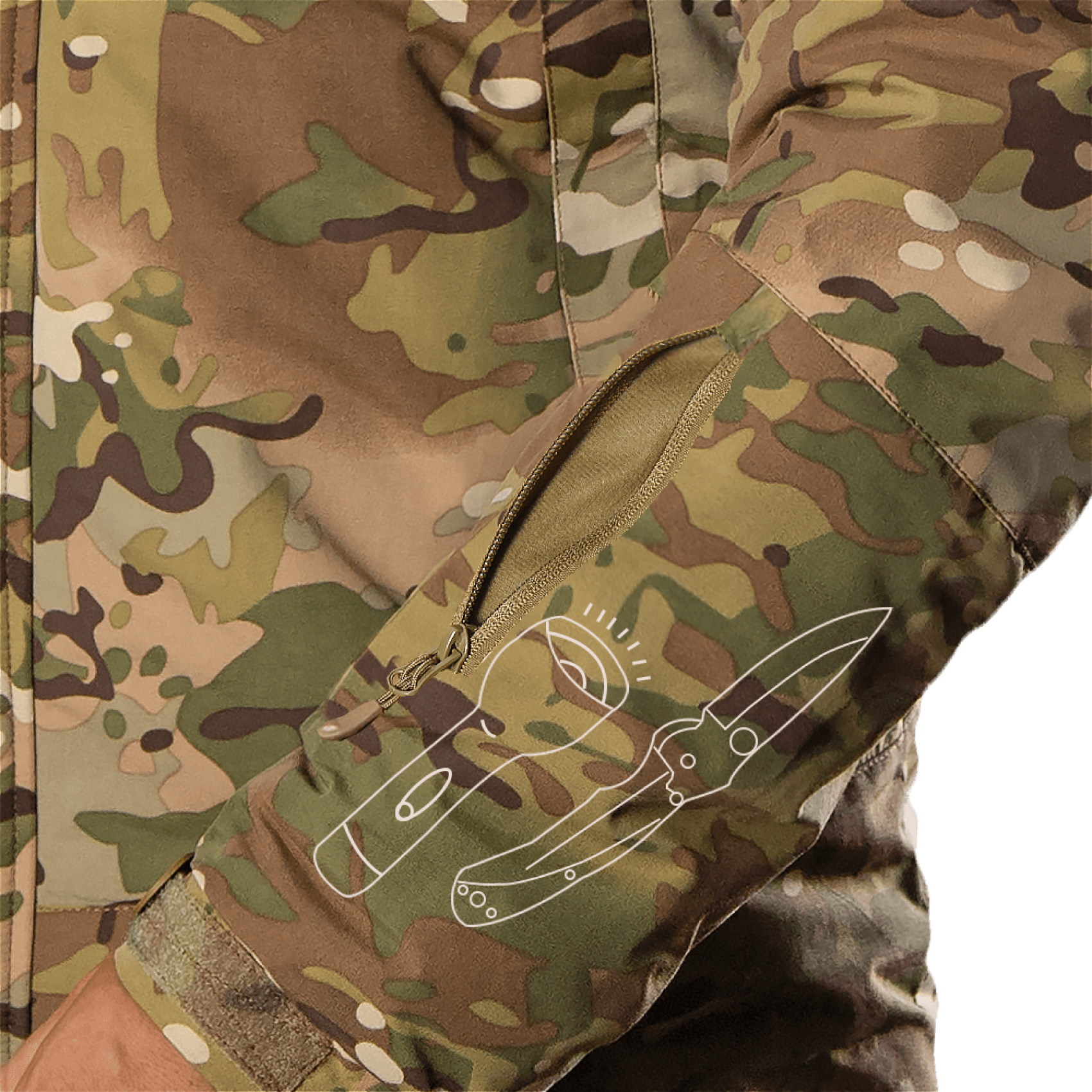 - Куртка оснащена безліччю кишень для зберігання необхідних речей: дві класичні кишені спереду, по одній кишені на рукавах під липучками, дві нагрудні кишені та три внутрішні кишені. Додаткова невелика кишеня на рукаві біля манжету підходить для дрібниць.