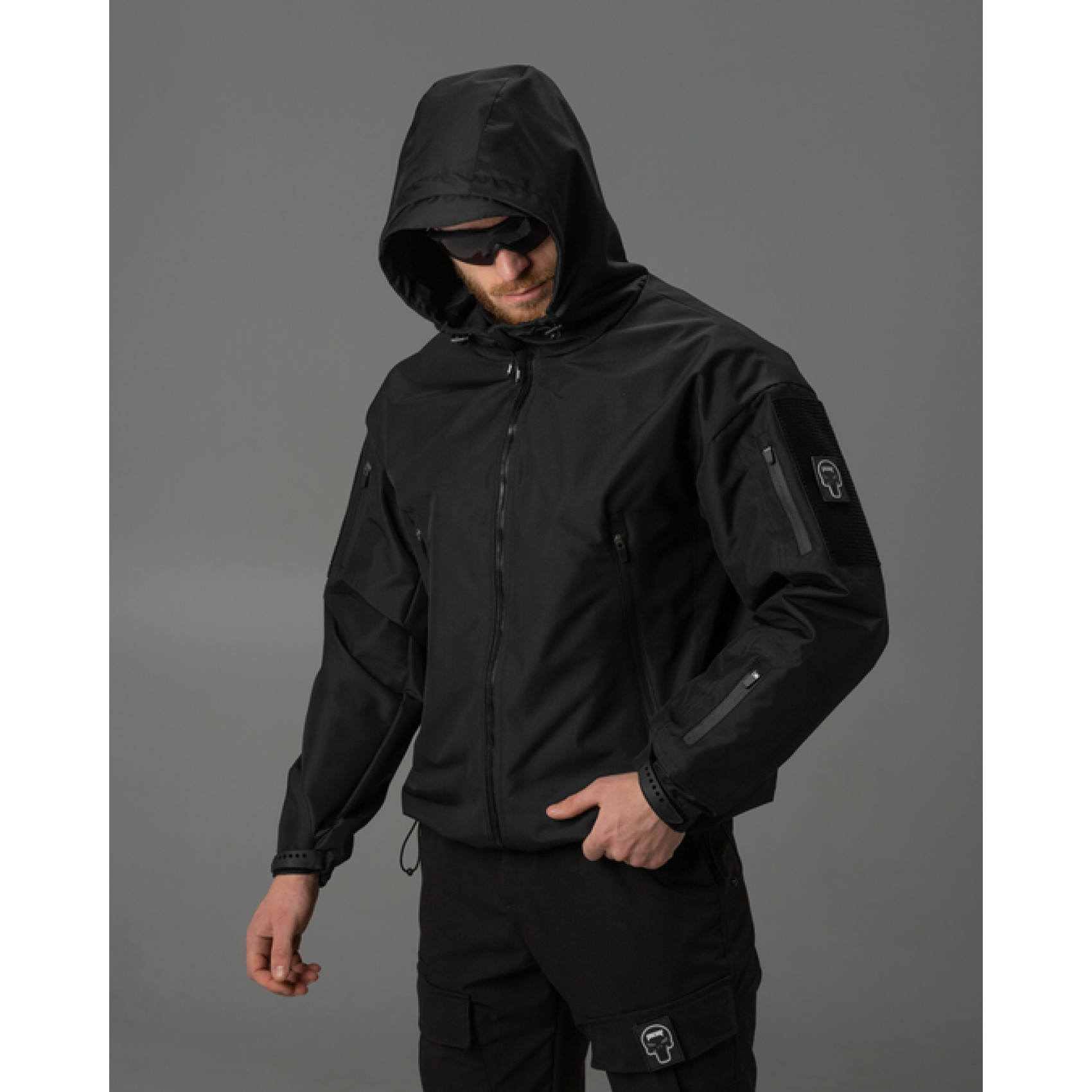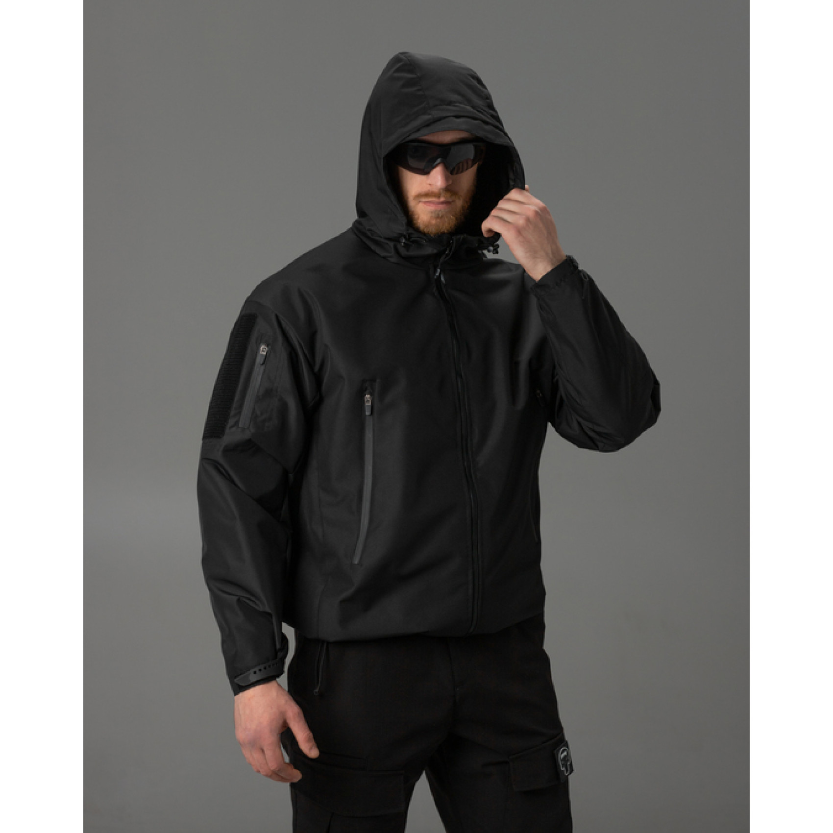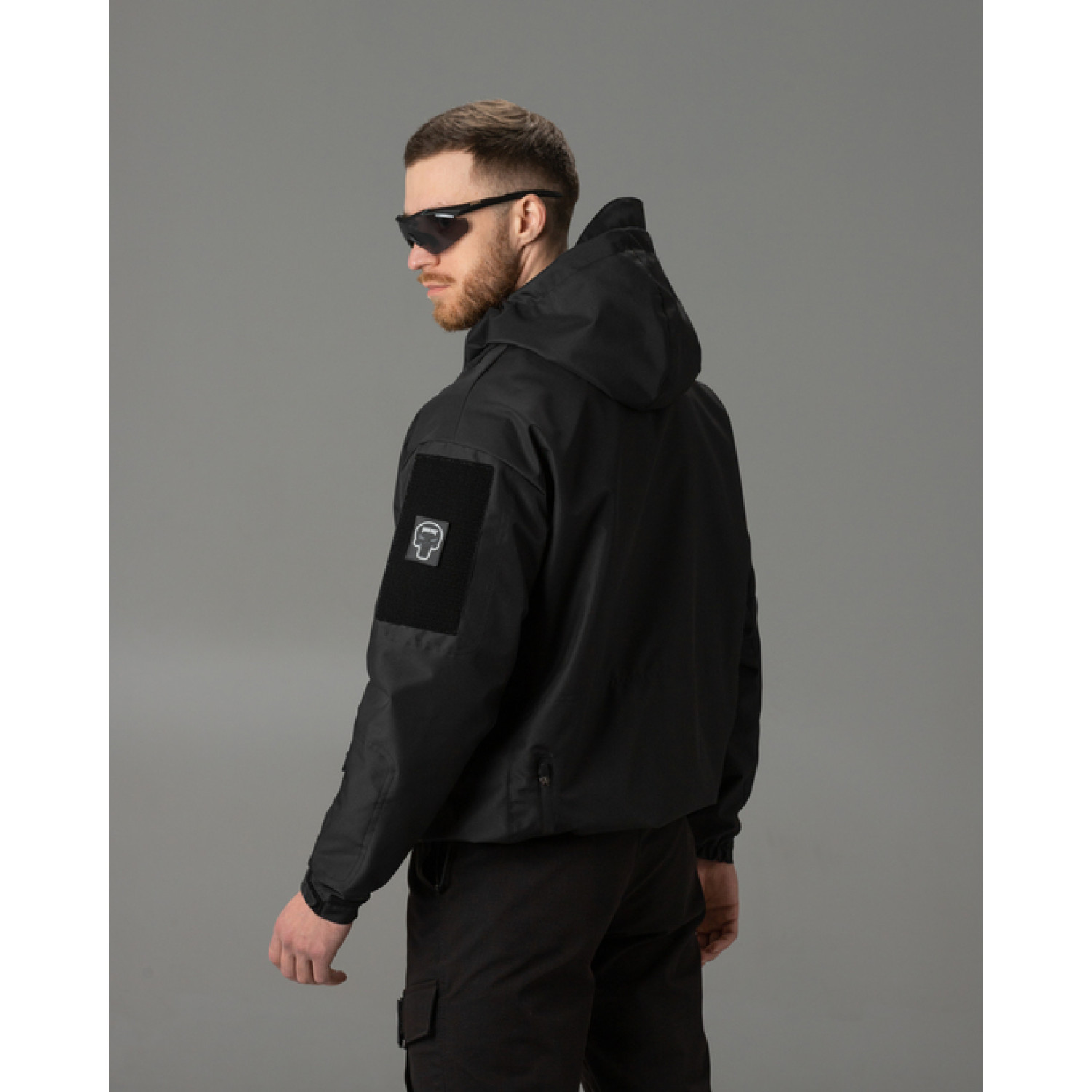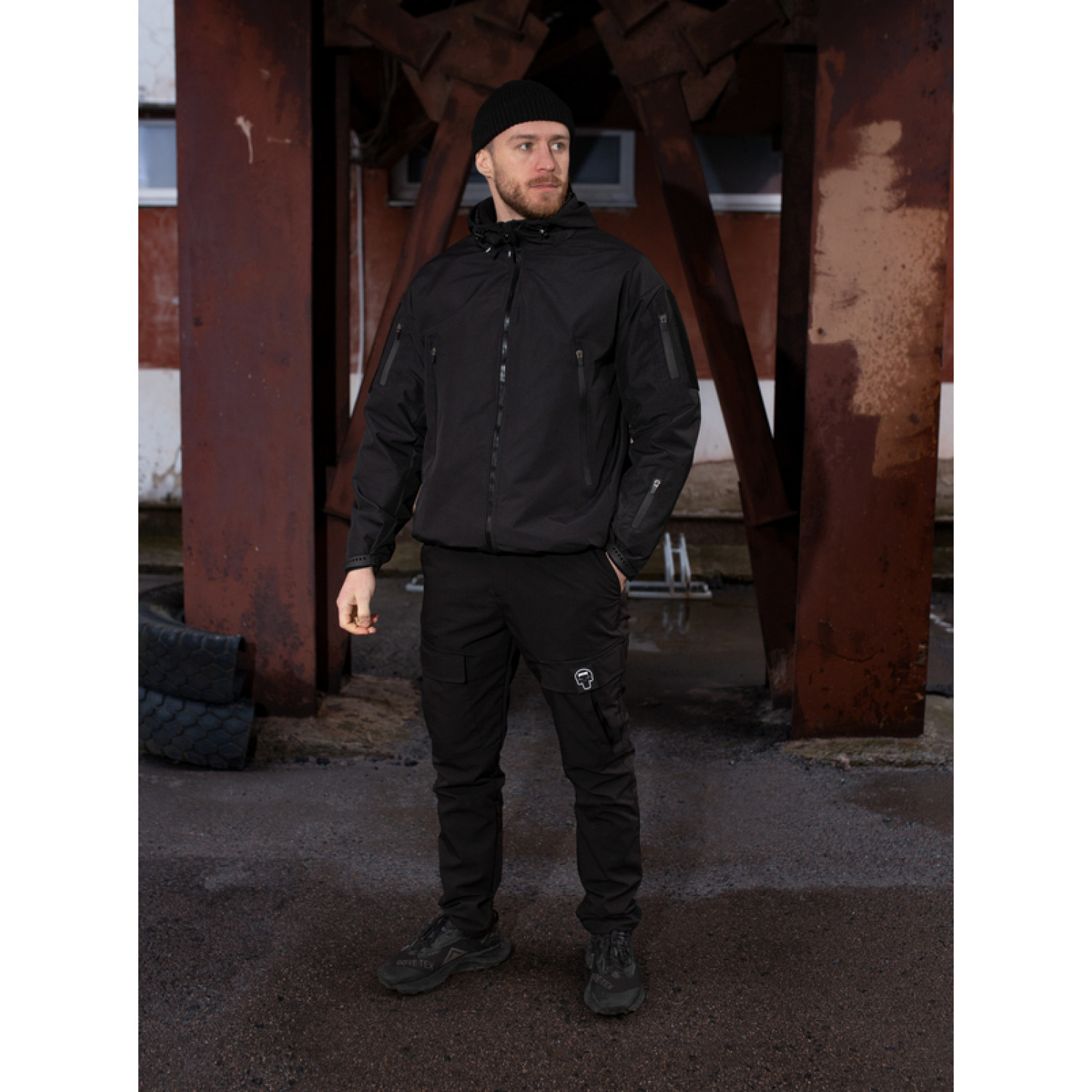 Куртка вітровка Bezet Stalker Чорний з капюшоном виконана з плащової тканини Rip Storm. Верхній шар матеріалу являє собою матовий рип-стоп, тоді як внутрішній бік має високотехнологічну щільну мембрану (8000 х 8000), що забезпечує надійний захист від вологи та вітру, яка ідеально підходить для використання в умовах високої вологості та сильного вітру, не пропускаючи воду всередину.