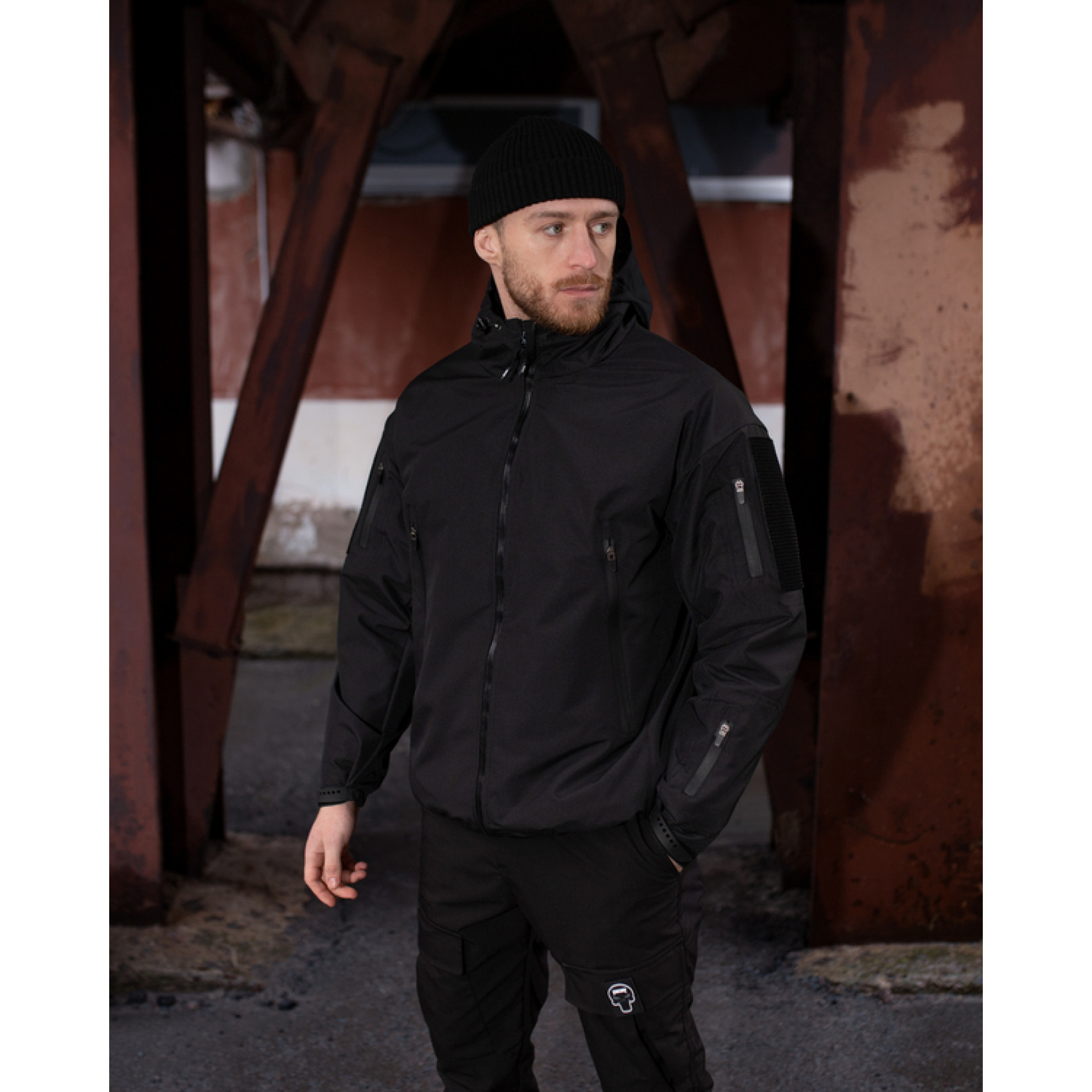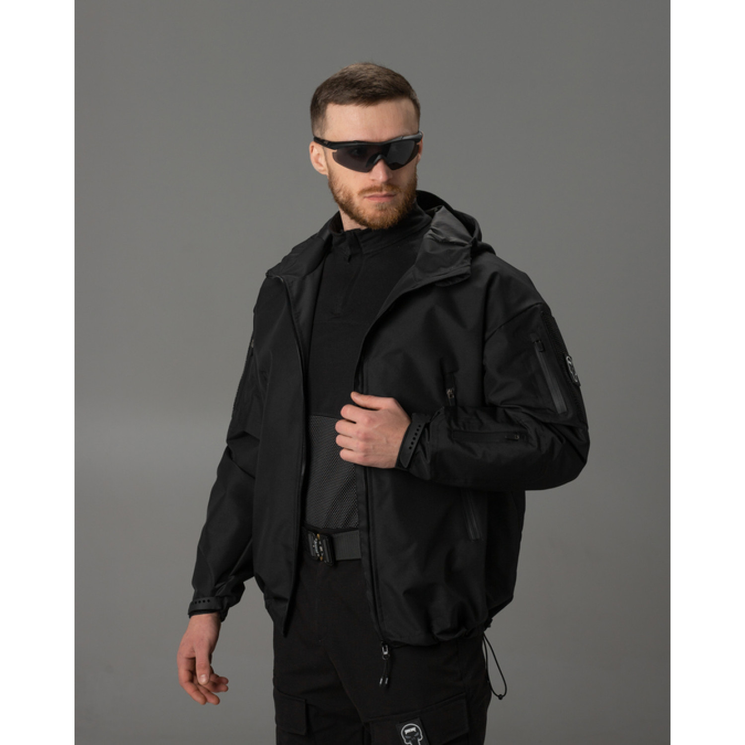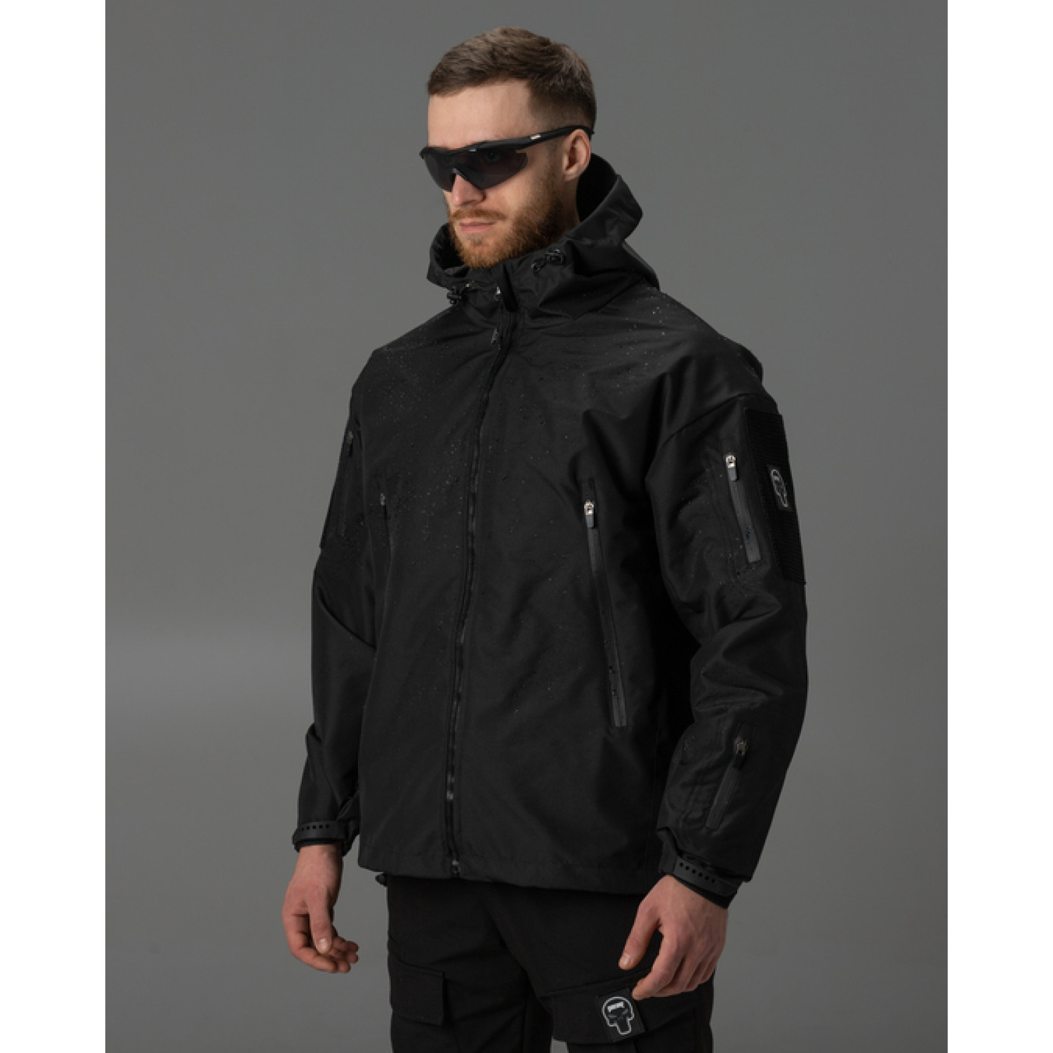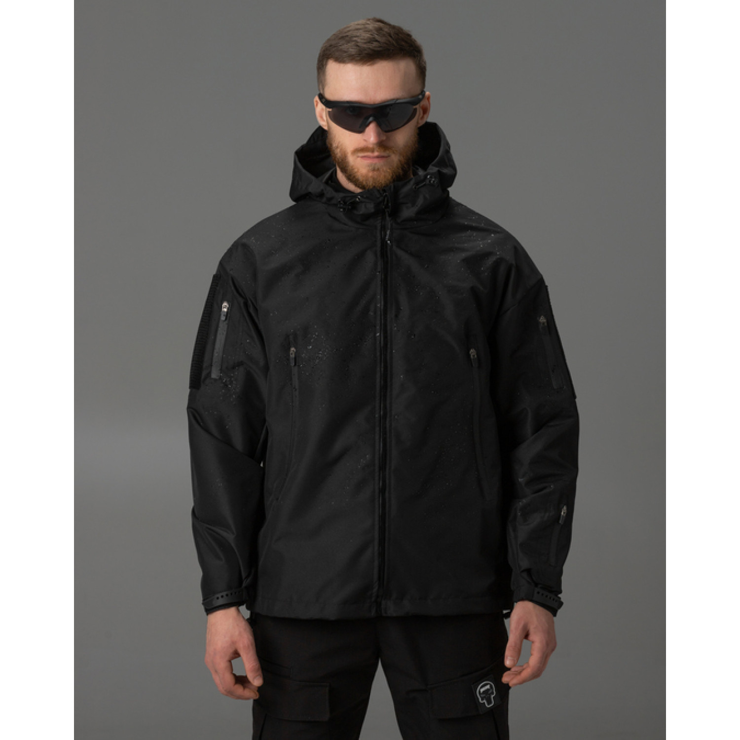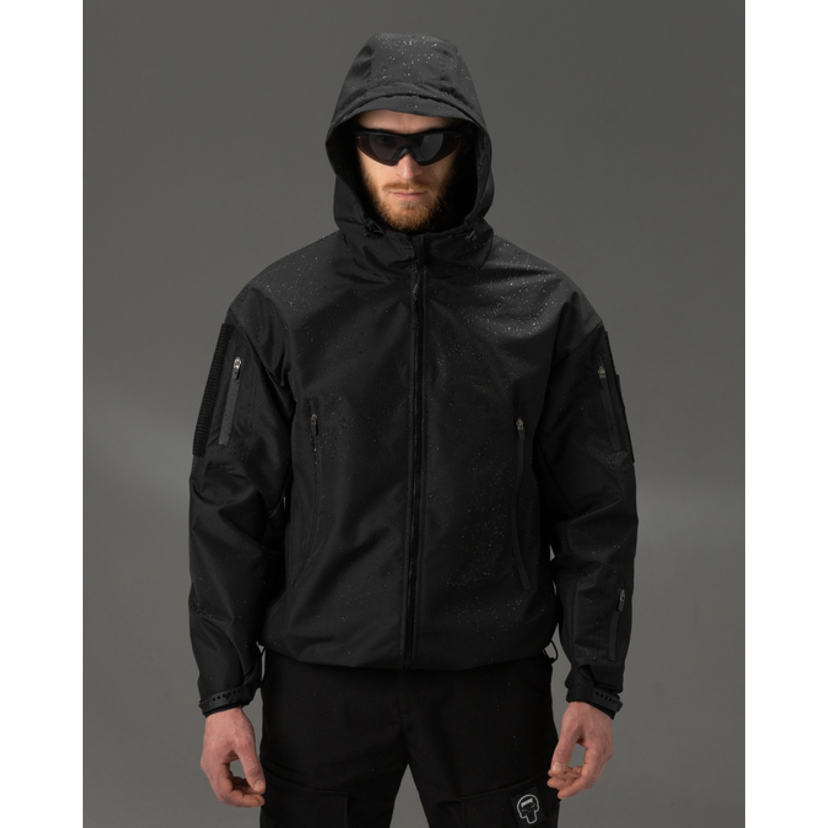 Куртка вітровка Bezet Stalker Чорний з капюшоном виконана з плащової тканини Rip Storm. Верхній шар матеріалу являє собою матовий рип-стоп, тоді як внутрішній бік має високотехнологічну щільну мембрану (8000 х 8000), що забезпечує надійний захист від вологи та вітру, яка ідеально підходить для використання в умовах високої вологості та сильного вітру, не пропускаючи воду всередину.