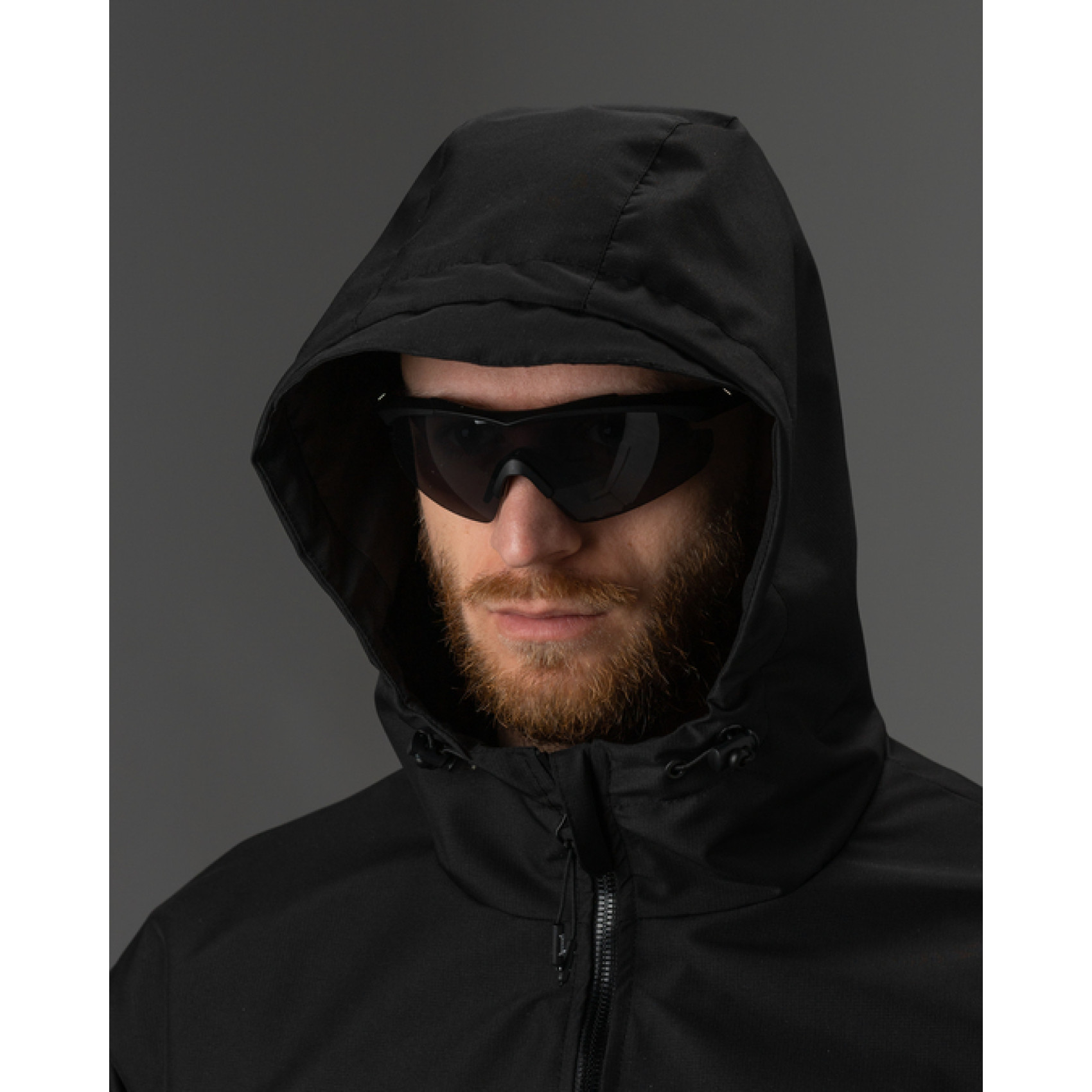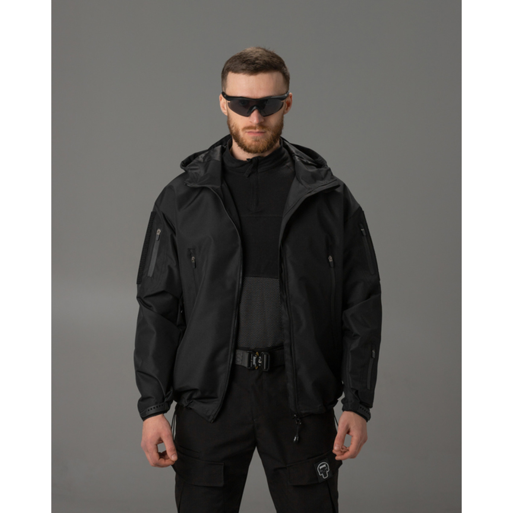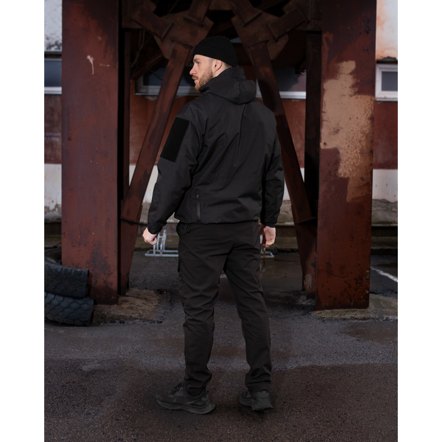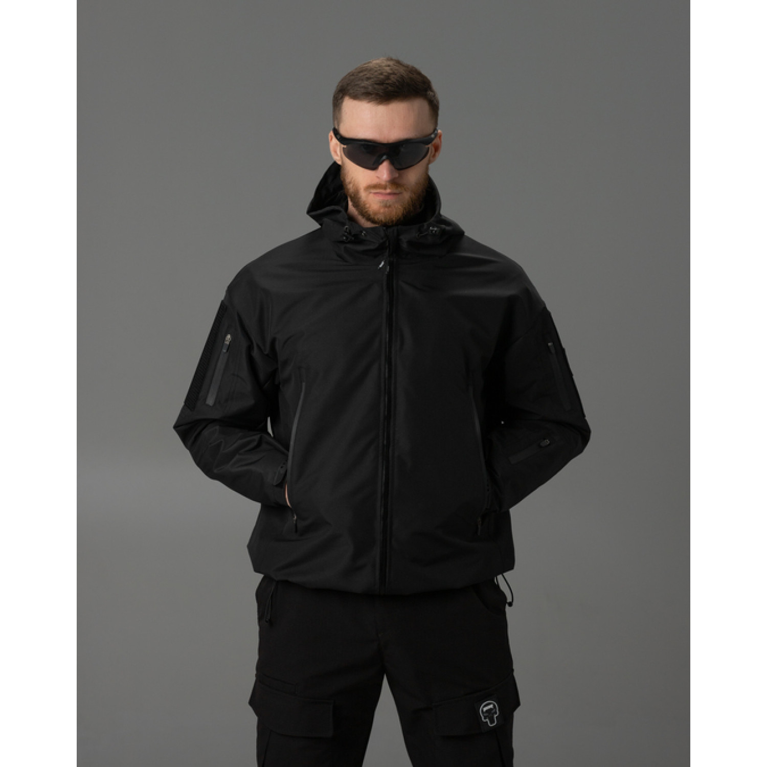 Куртка вітровка Bezet Stalker Чорний з капюшоном виконана з плащової тканини Rip Storm. Верхній шар матеріалу являє собою матовий рип-стоп, тоді як внутрішній бік має високотехнологічну щільну мембрану (8000 х 8000), що забезпечує надійний захист від вологи та вітру, яка ідеально підходить для використання в умовах високої вологості та сильного вітру, не пропускаючи воду всередину.