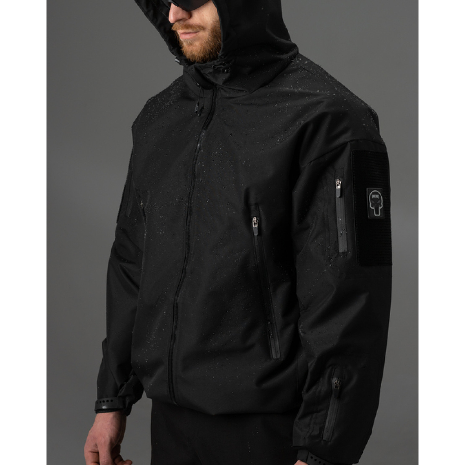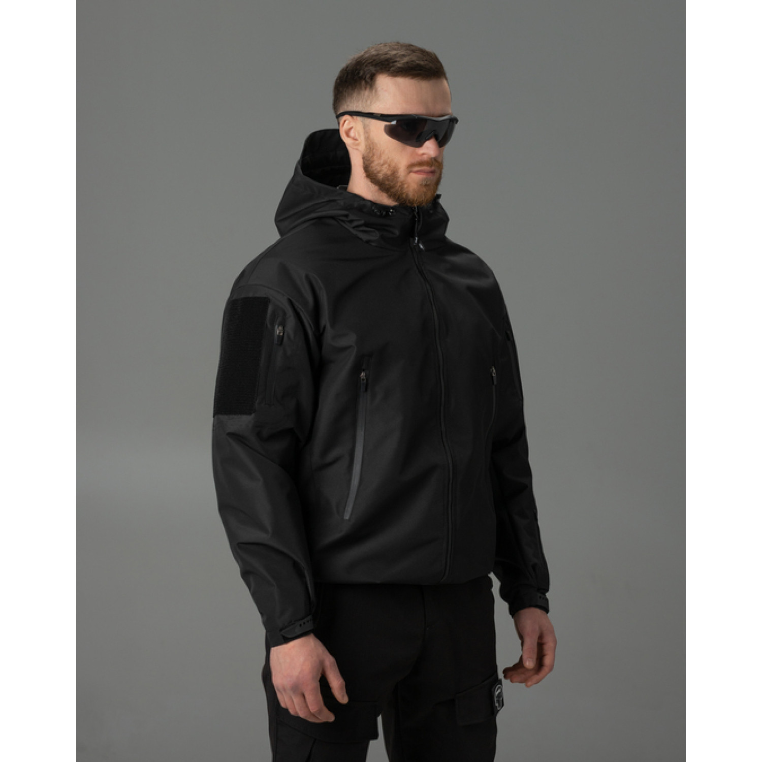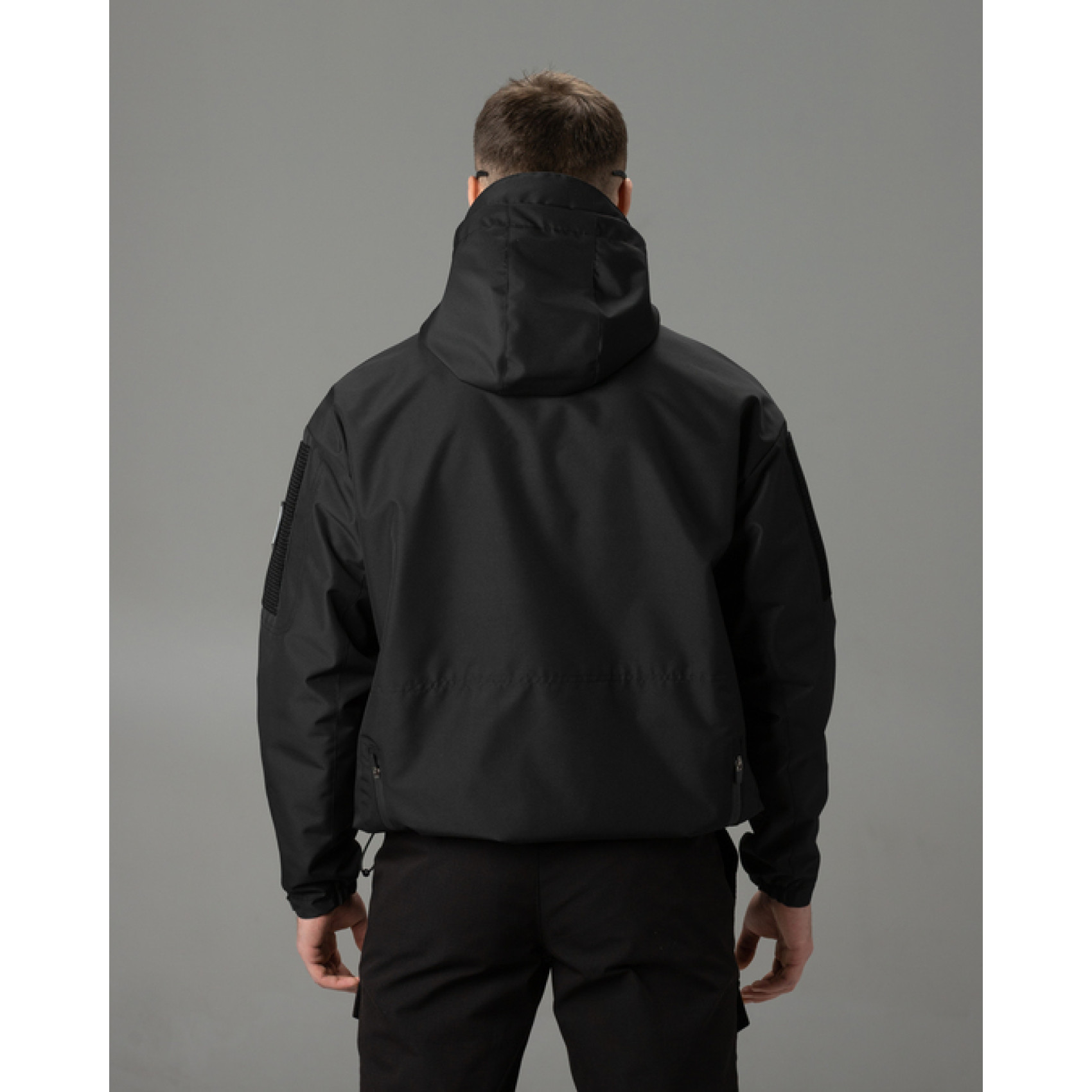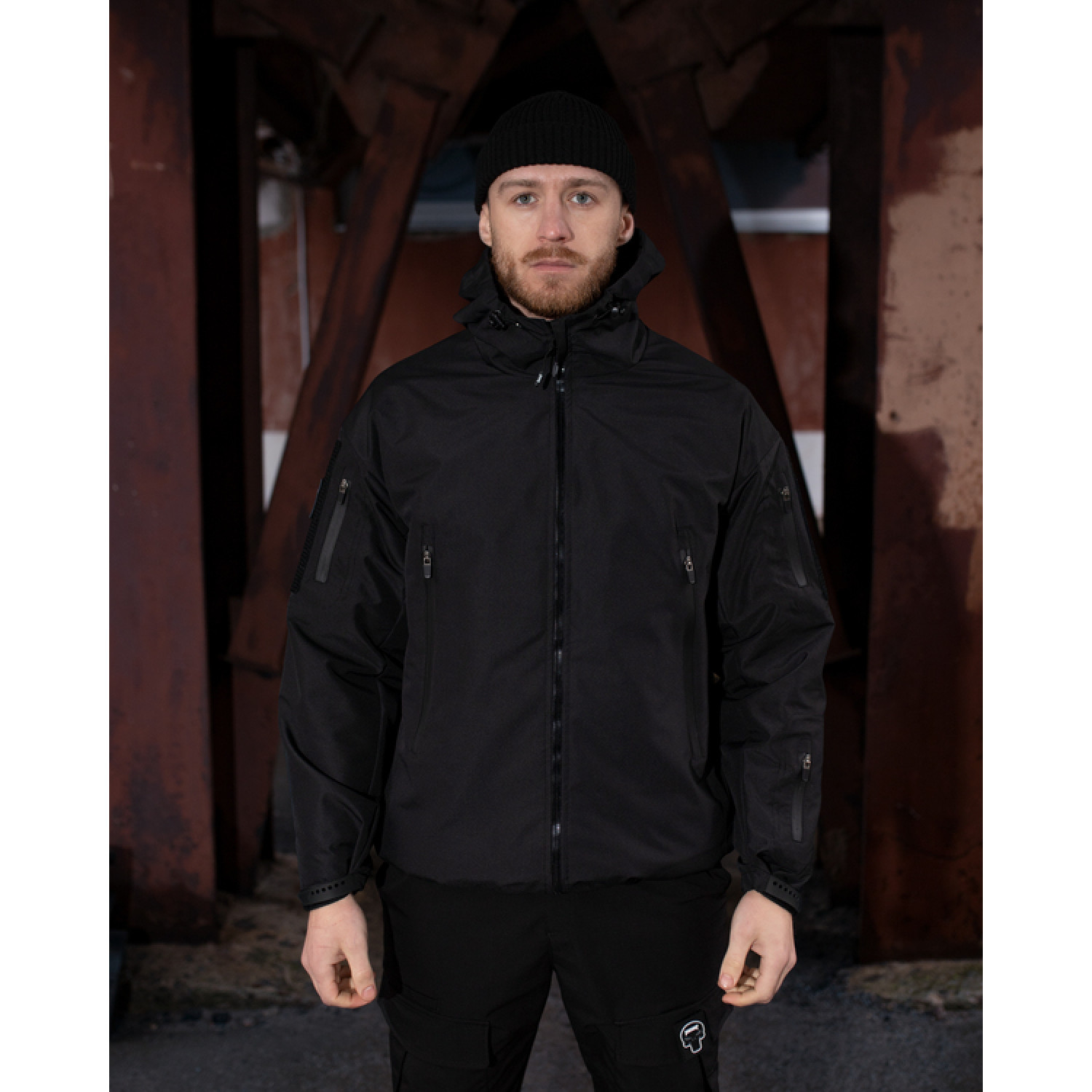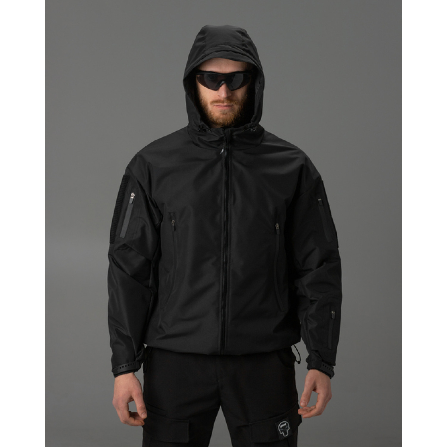 Куртка вітровка Bezet Stalker Чорний з капюшоном виконана з плащової тканини Rip Storm. Верхній шар матеріалу являє собою матовий рип-стоп, тоді як внутрішній бік має високотехнологічну щільну мембрану (8000 х 8000), що забезпечує надійний захист від вологи та вітру, яка ідеально підходить для використання в умовах високої вологості та сильного вітру, не пропускаючи воду всередину.