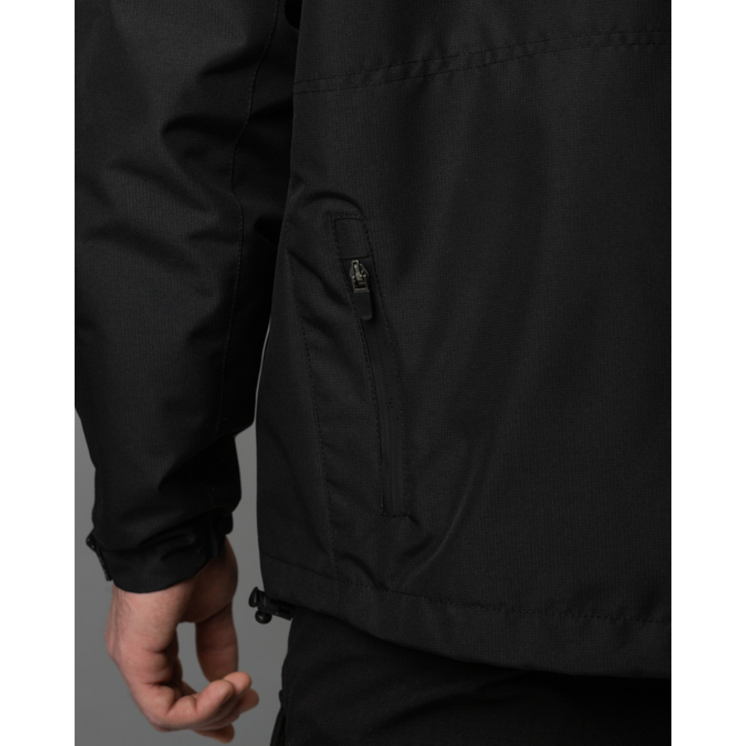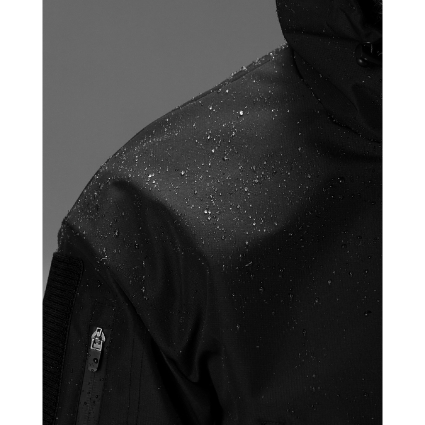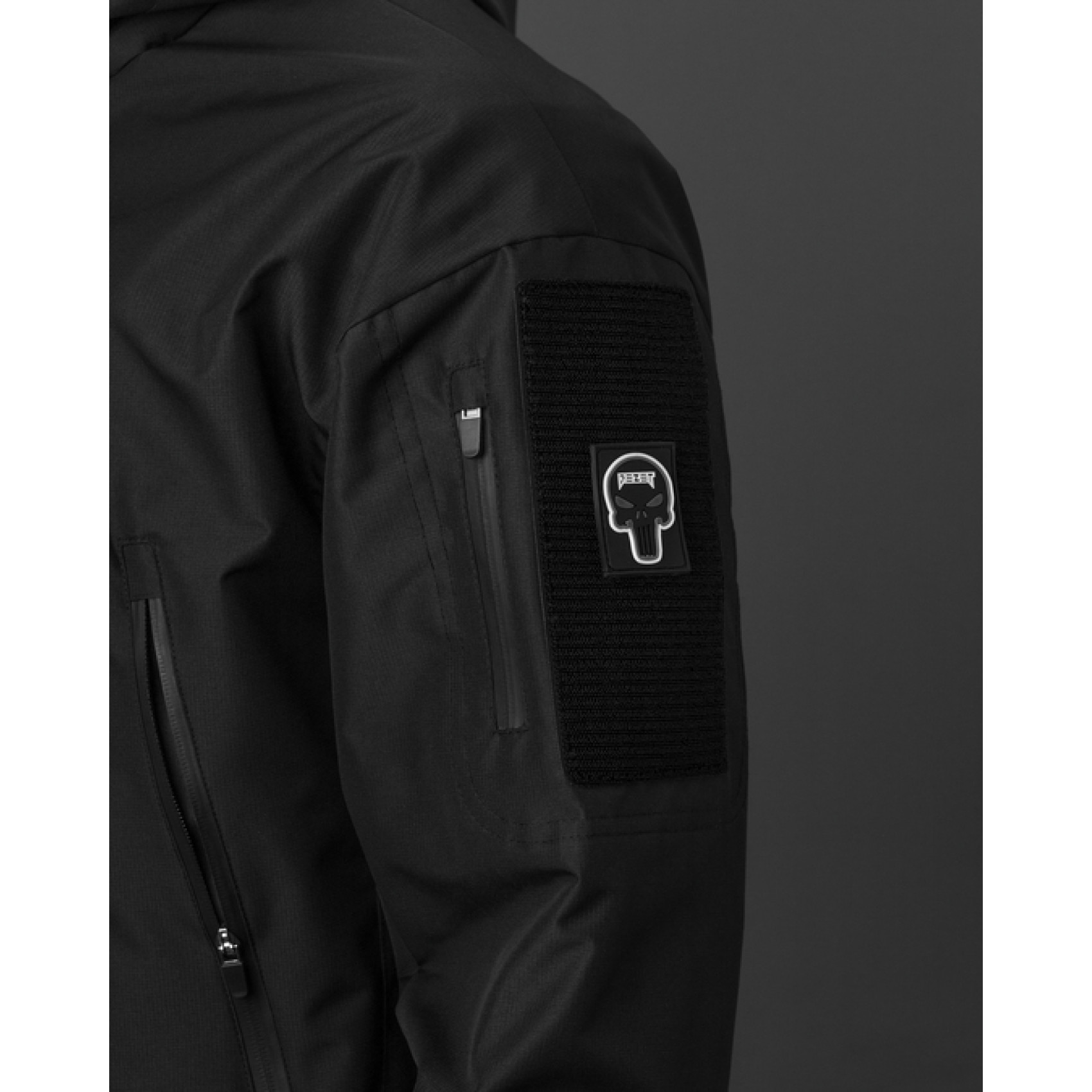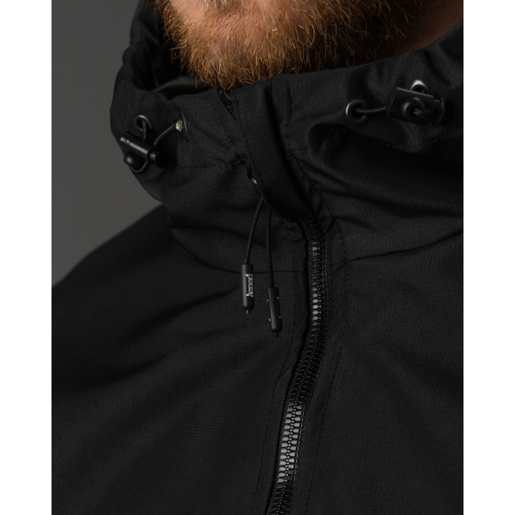Куртка вітровка Bezet Stalker Чорний з капюшоном виконана з плащової тканини Rip Storm. Верхній шар матеріалу являє собою матовий рип-стоп, тоді як внутрішній бік має високотехнологічну щільну мембрану (8000 х 8000), що забезпечує надійний захист від вологи та вітру, яка ідеально підходить для використання в умовах високої вологості та сильного вітру, не пропускаючи воду всередину.