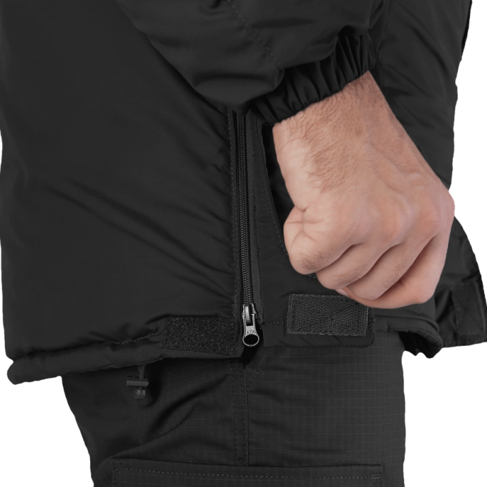 В куртці, по боках, є система швидкого доступу до поясної зони та зброї, яка застібається на блискавку. По низу присутня утяжка із фіксатором для регулювання посадки куртки (регулювання тільки задньої частини по низу куртки).