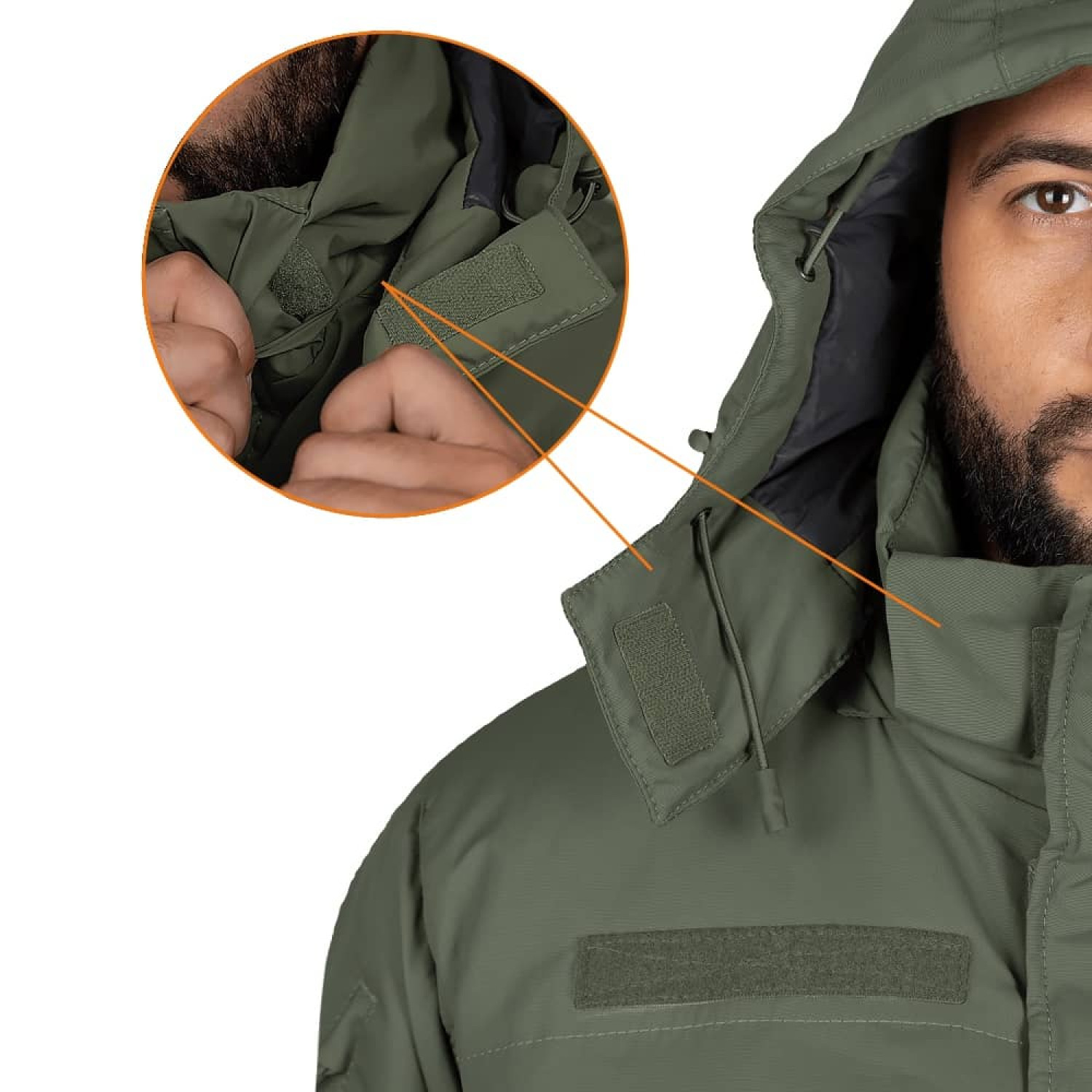 Patrol System 3.0 оснащена утепленим каптуром, що знімається. Він фіксується на блискавку і застібається на липучки, які можна сховати у спеціальних відділеннях в комірі. Зручний ергономічний дизайн дозволяє регулювати глибину, об’єм та ширину каптура, а піддашок надає додатковий захист під час снігу та дощу.