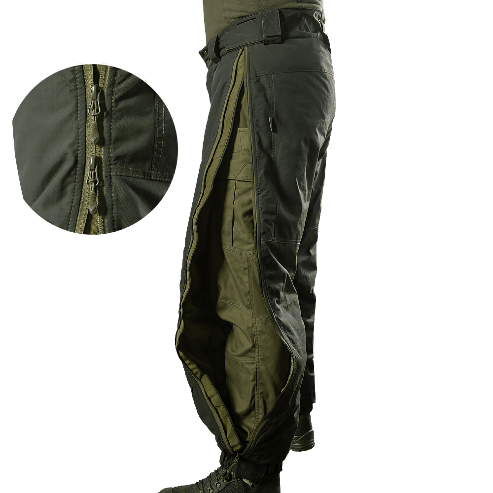 - Тому, однією з особливостей наших штанів є система швидкого зняття та одягання штанів завдяки боковим змійкам по всій довжині, які дозволяють швидко вдягнути або зняти штани, а також швидко отримати доступ до внутрішніх кишень. Також вони оснащені пулерами, які дозволяють працювати з ними навіть в рукавичках.