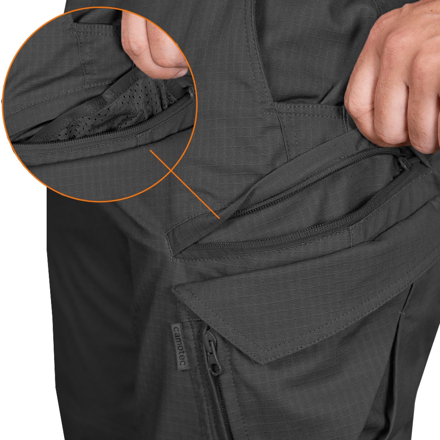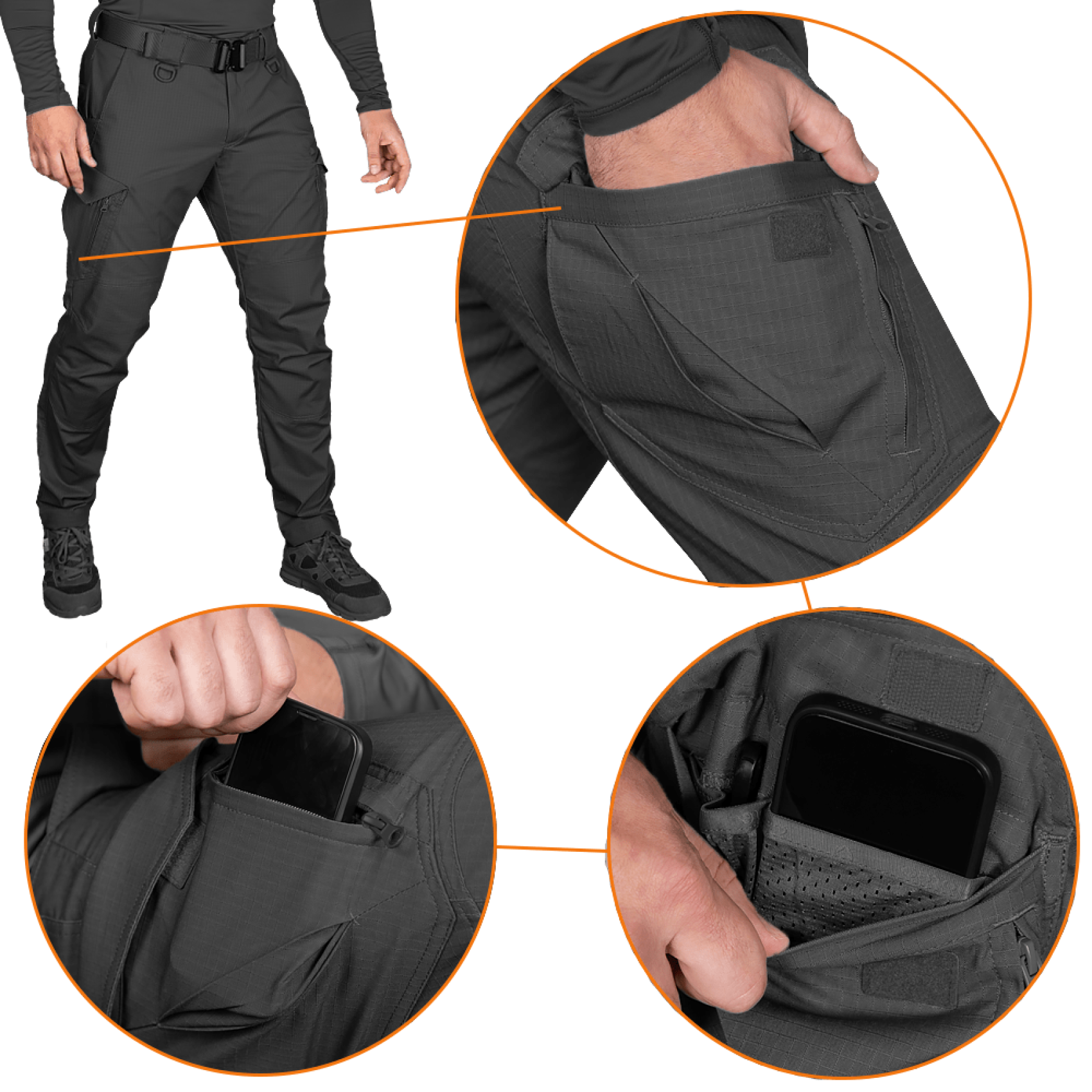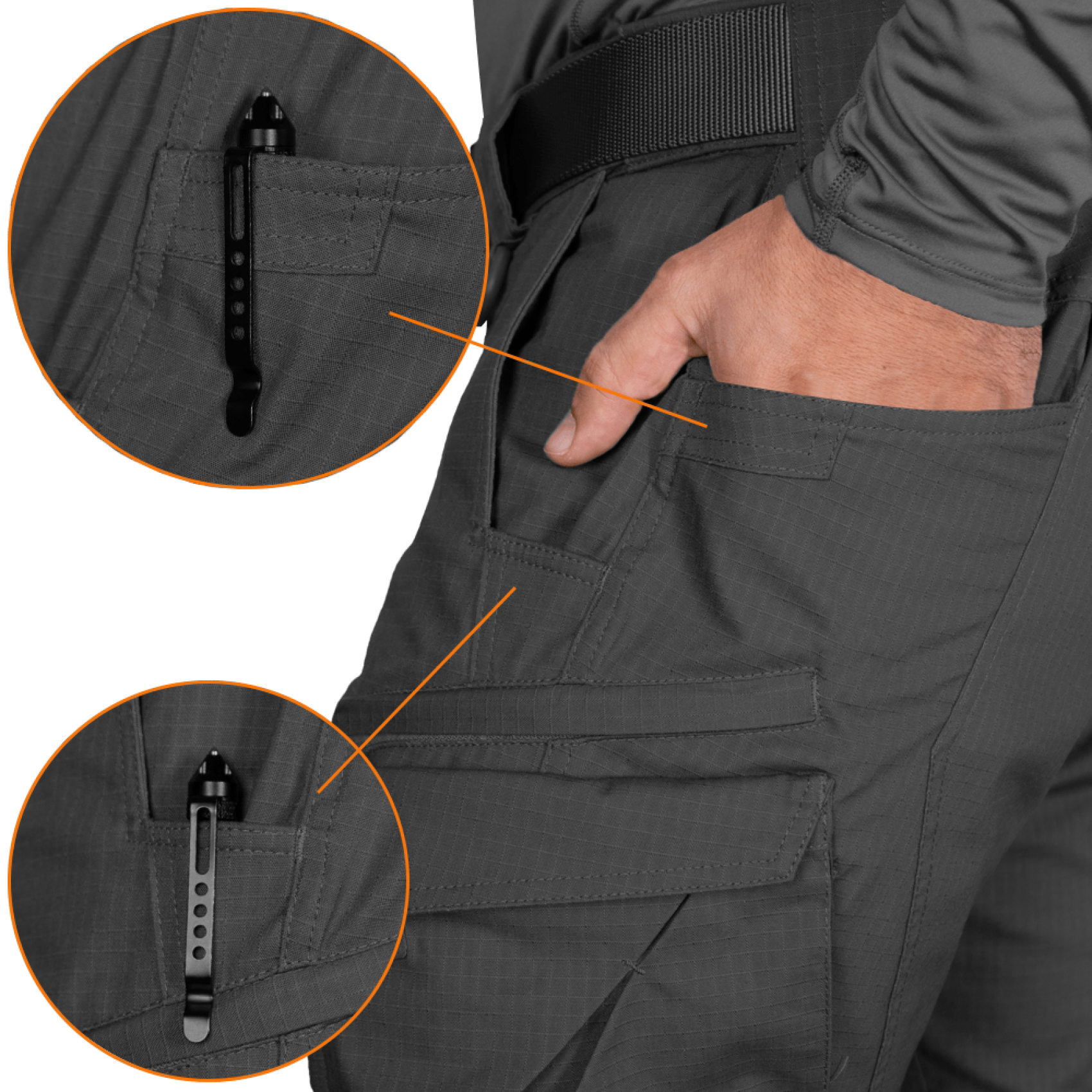 - Кишені на стегнах мають подвійний доступ: верхній та боковий, для доступу до речей з будь-якого положення.