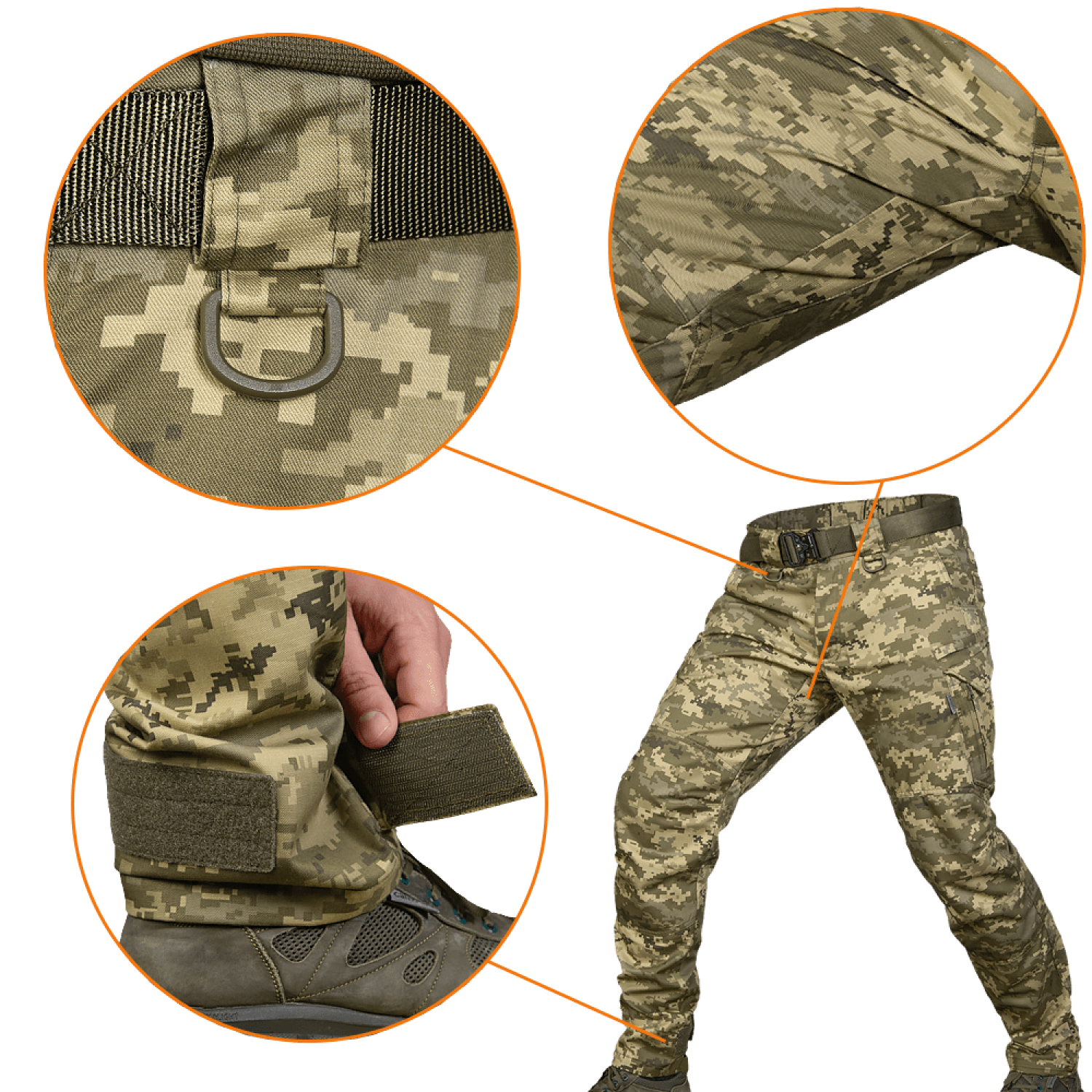 - Міцні широкі петлі, які витримають тактичний пояс з кобурою чи підсумками на ньому.