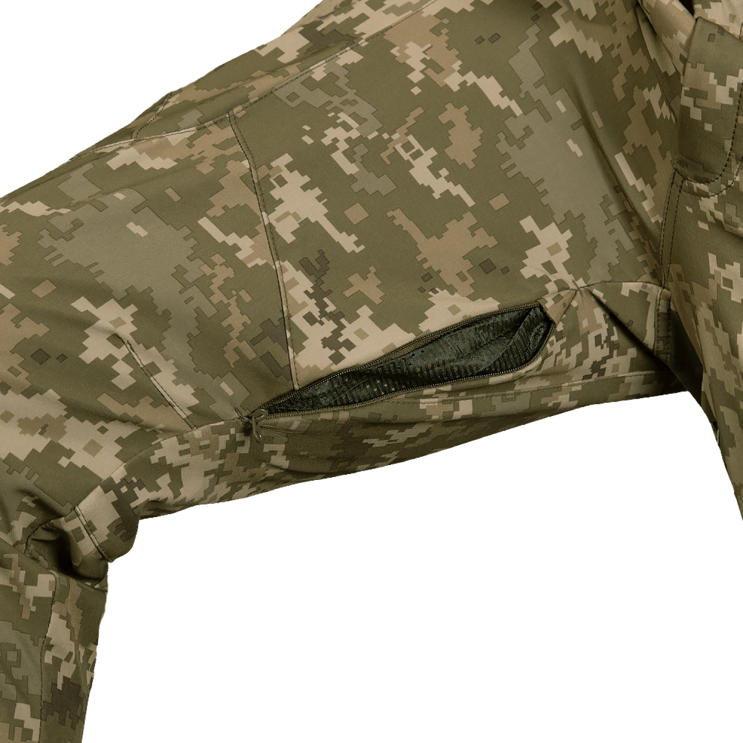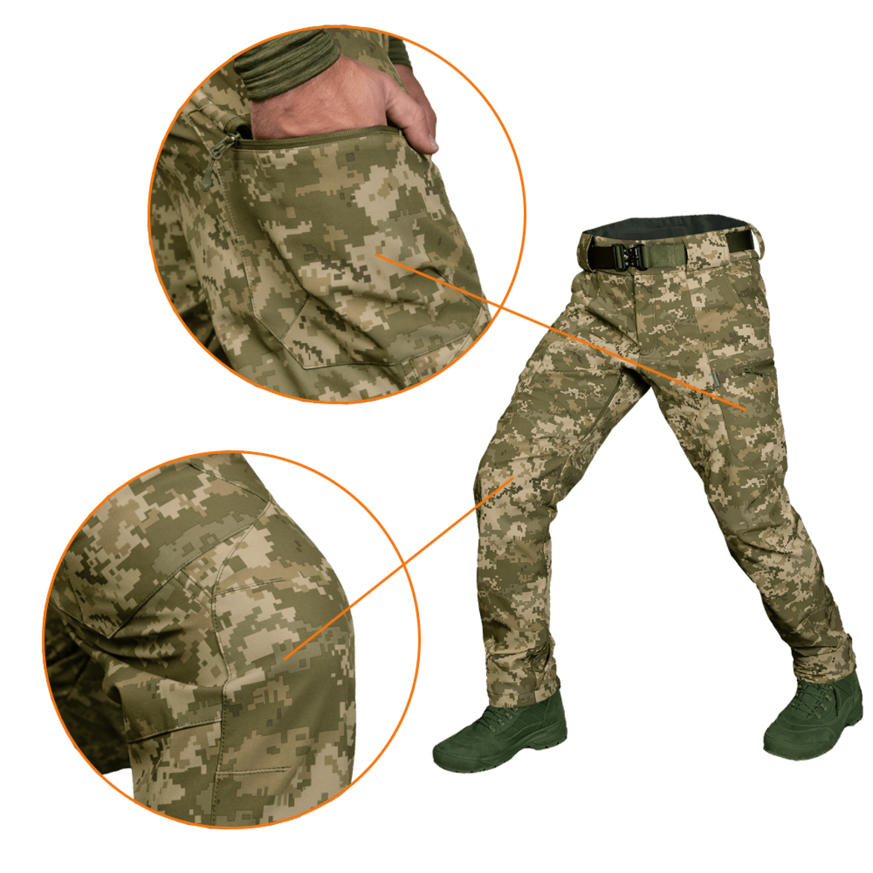 Вони також мають унікальний крій від компанії Camotec. Ергономічні виточки в ділянці колін і спеціальні вставки в промежині додають комфорту і запобігають натиранню під час тривалого використання. Однією з ключових особливостей цих штанів є вентиляційні отвори на внутрішньому боці стегон, обладнані сітчастим матеріалом Cool Mesh для оптимальної вентиляції та охолодження під час носіння. Регульовані застібки-блискавки на цих вирізах дають змогу регулювати рівень вентиляції залежно від погодних умов і вподобань користувача.