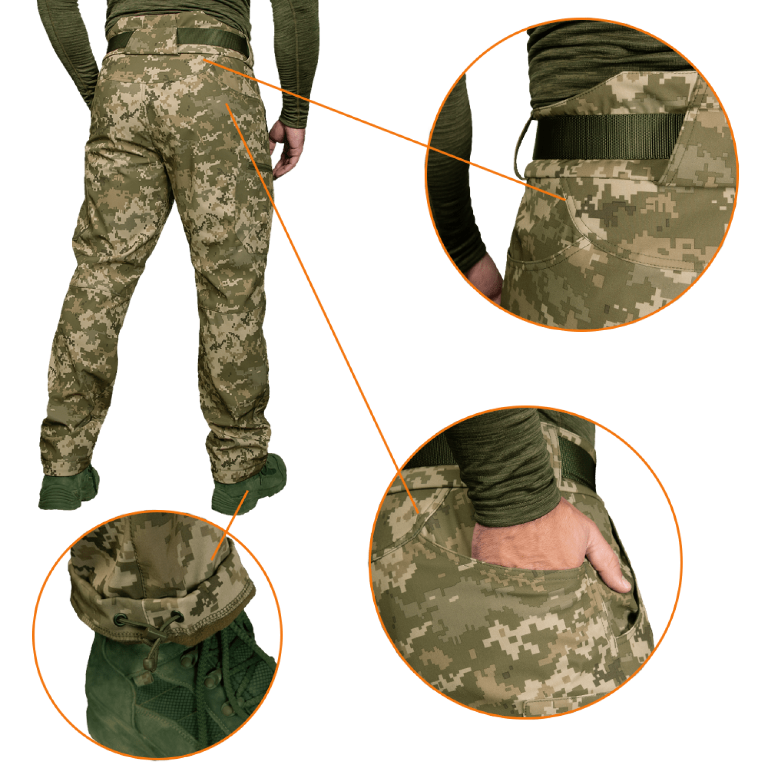 Пояс цих штанів завищений для кращої фіксації та захисту від холоду, і закріплюється двома вертикально розташованими металевими кнопками. Штани також обладнані двома врізними кишенями спереду, двома врізними кишенями ззаду і двома врізними кишенями з боків. Це ідеальний вибір як для служби у воєнізованих та охоронних структурах, так і для повсякденного носіння.