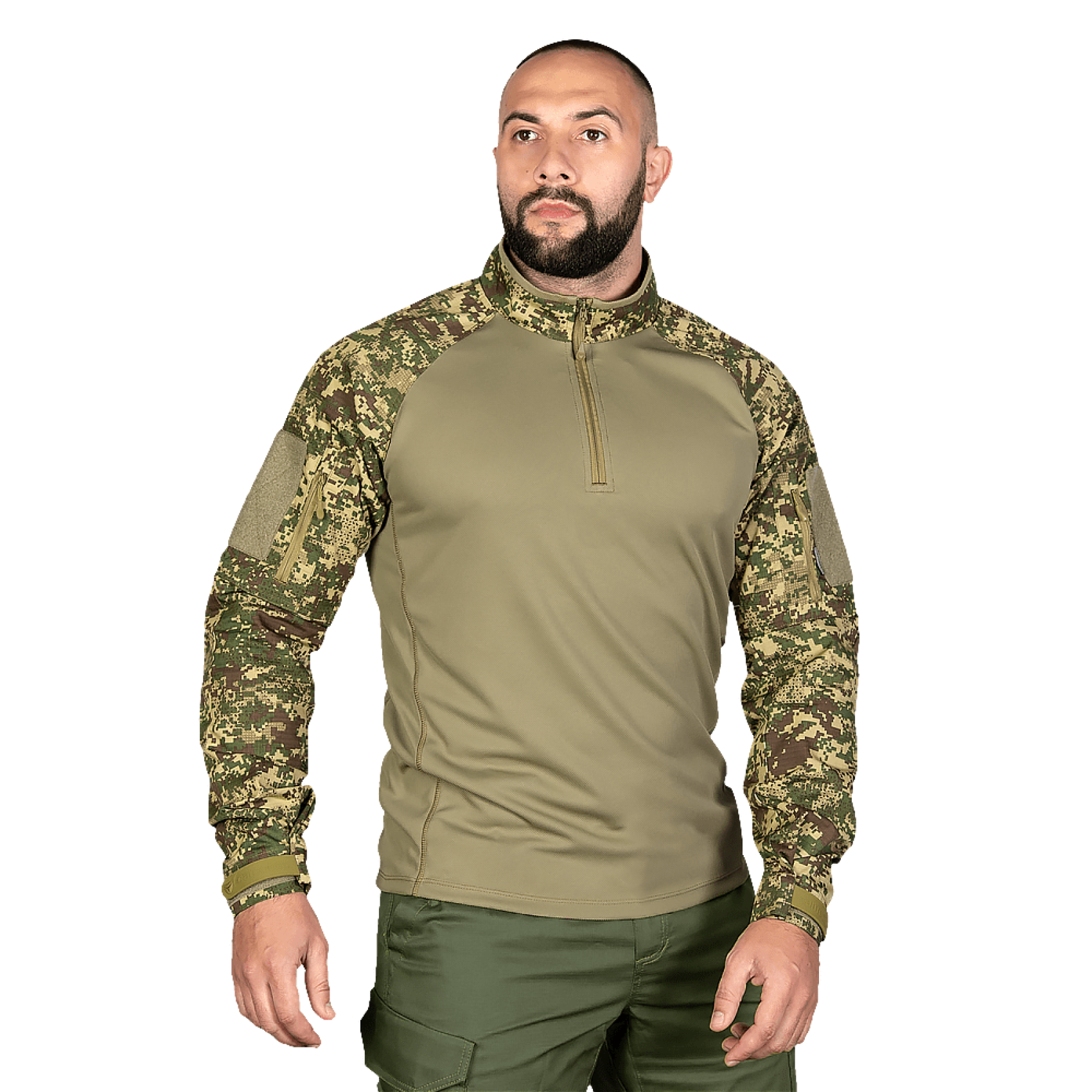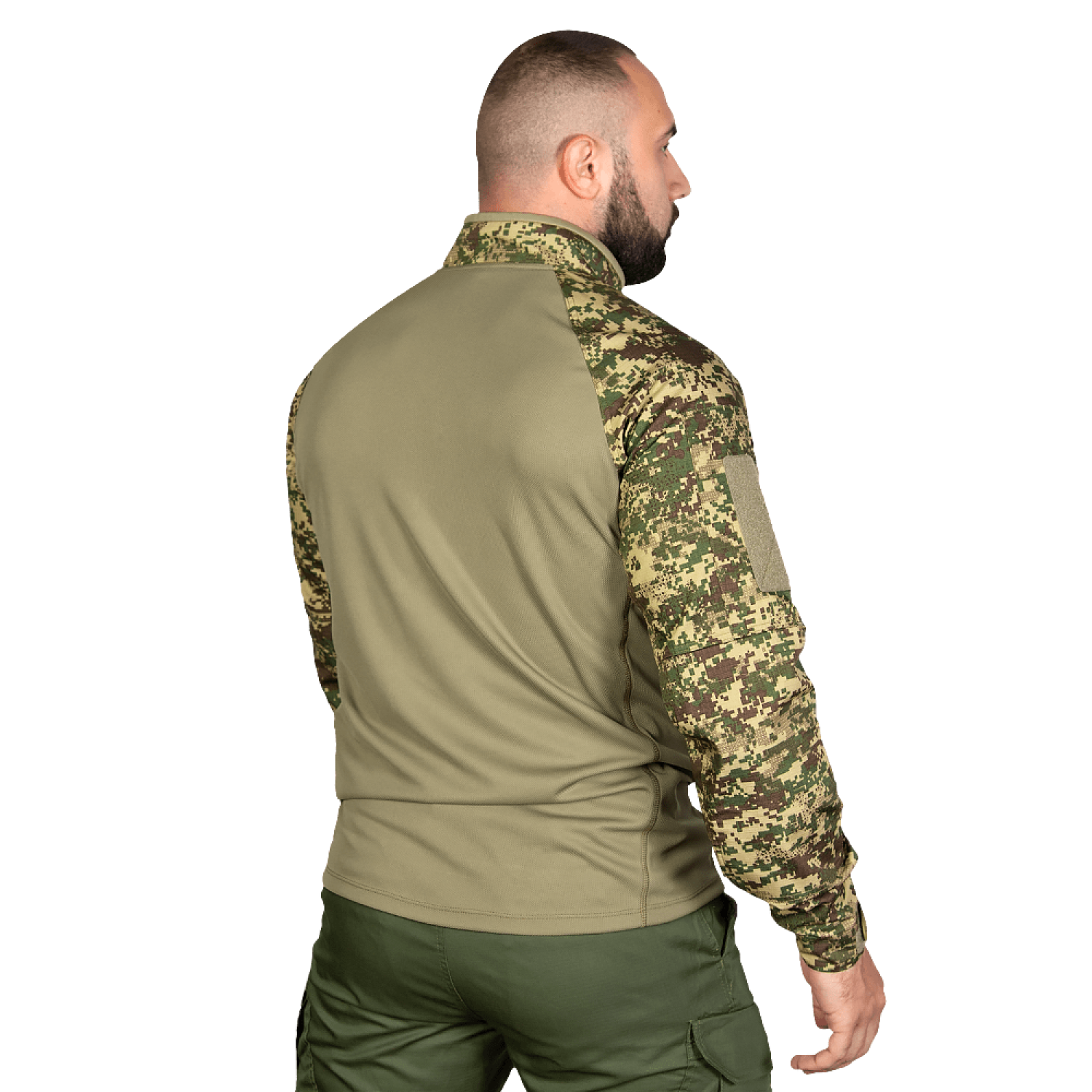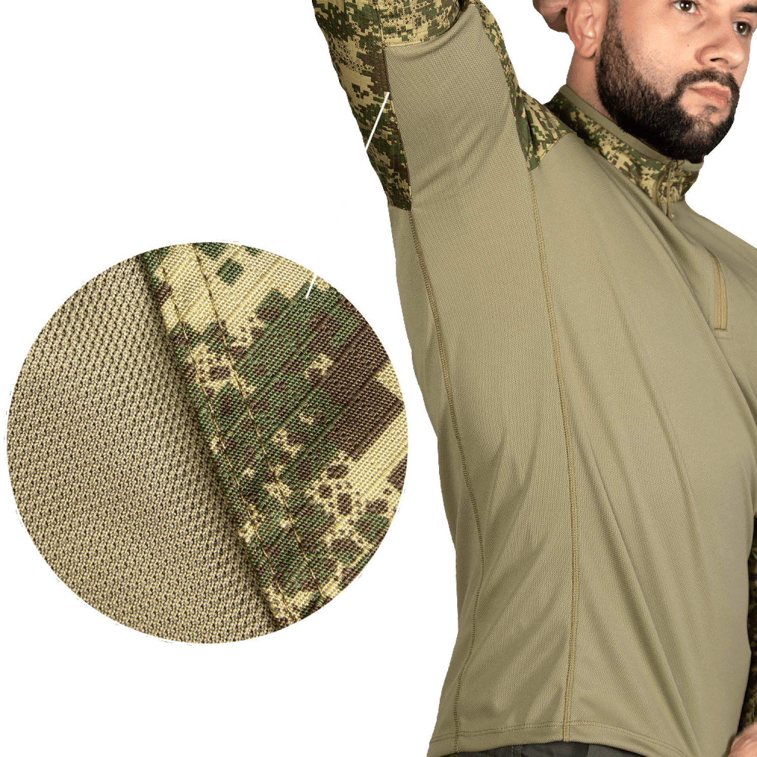 Рукава, плечі та комір виготовлені зі змішаної тканини Twill, що має міцні "дихаючі" властивості. Сорочка має ергономічний дизайн, що дає змогу носити її комфортно і вільно навіть за активних рухів і носіння плітоноски. Плоскі шви та атлетичний крій тулуба забезпечують мінімальний дискомфорт та ефективне виведення вологи.