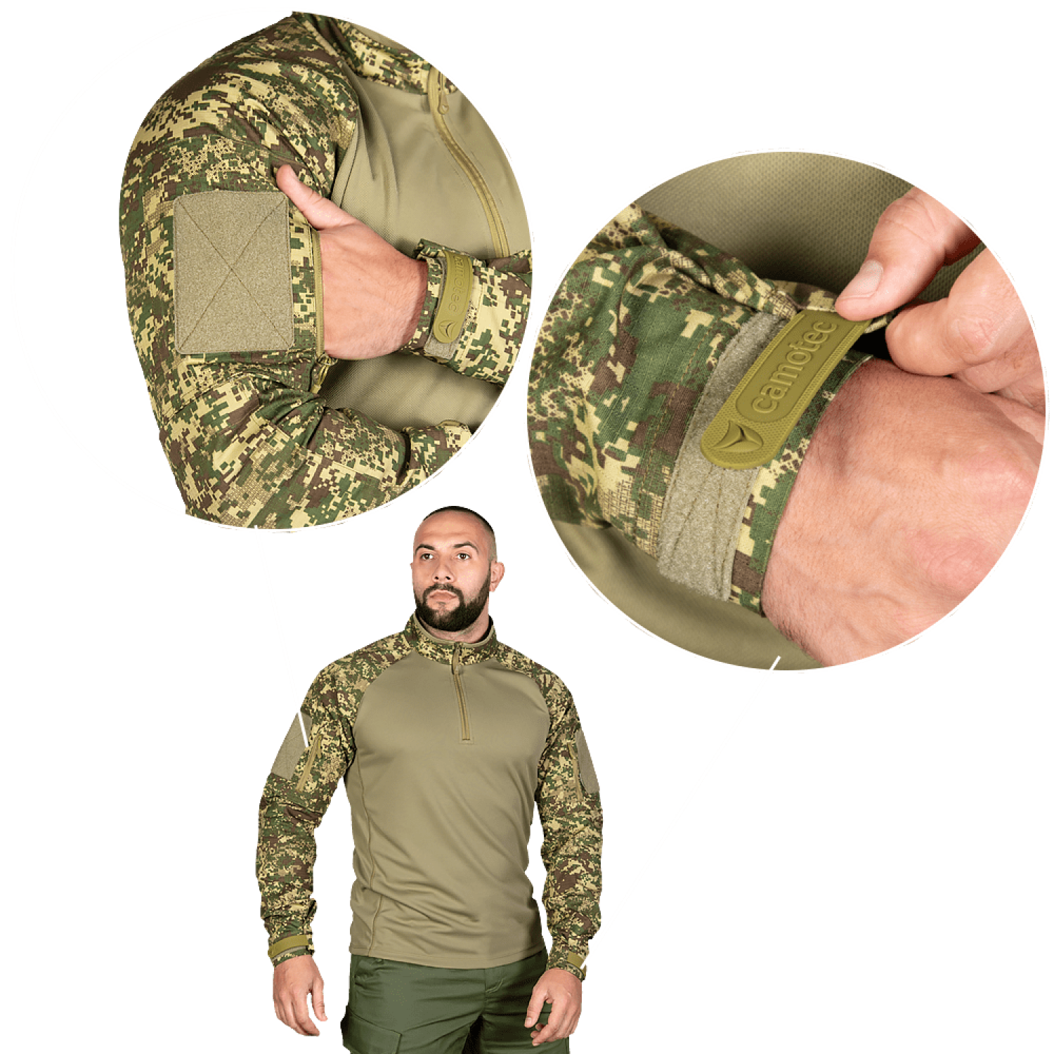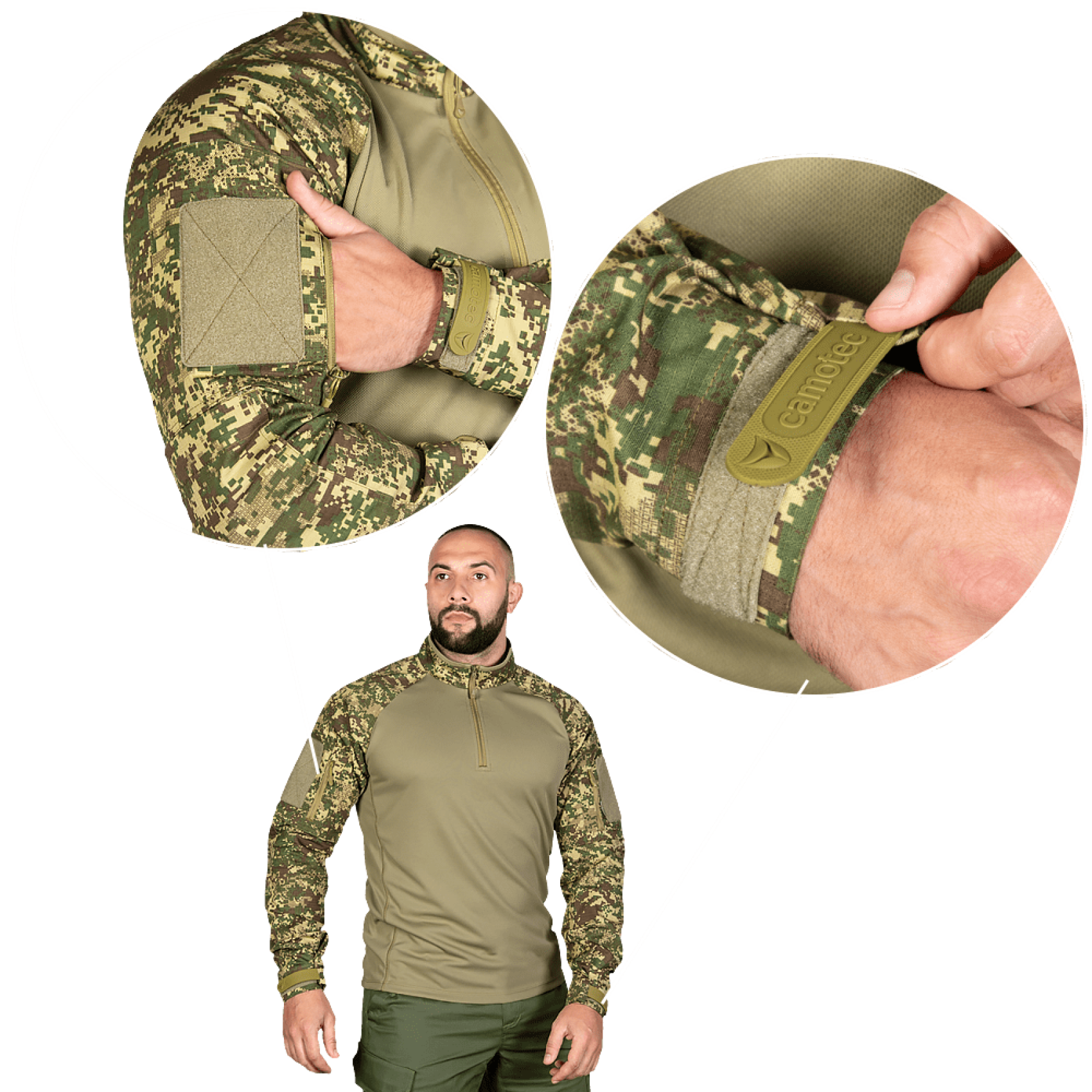 Бойова сорочка Camotec Raid Хижак Піксель - Пісочний призначена для армійських і воєнізованих підрозділів, ідеально підходить для сезону весна/літо. В основі її конструкції - тканина CoolPass Air 2.0, застосована для тулуба, пахв і грудей, що забезпечує чудову вентиляцію. Цей матеріал ефективно вбирає вологу і швидко виводить її назовні завдяки антибактеріальному просоченню.