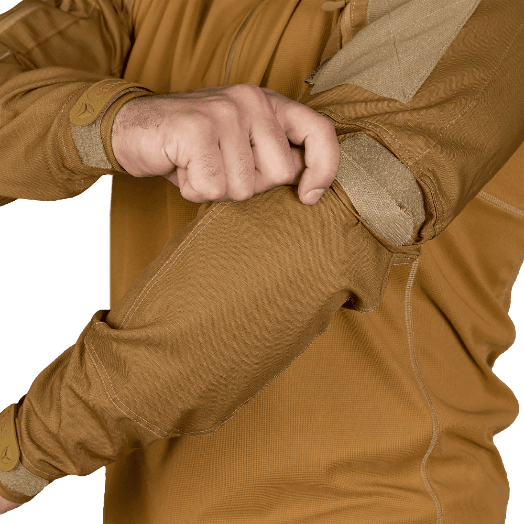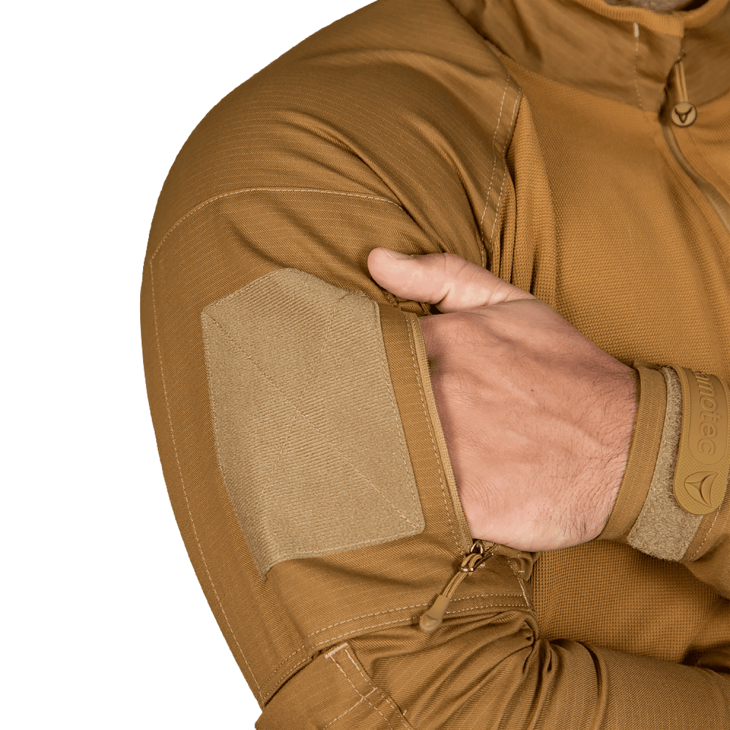 На рукавах в зоні ліктів є місце під налокітники. Вони вставляються зверху, таким чином, щоб при пересуванні повзком, в отвори не забивався бруд. Манжети регулюються та фіксуються на липучки. По боках є кишені з застібками-блискавками, без клапанів (щоб уникнути зачеплення за гілки та кущі). На всіх застібках є пулери, для роботи з ними в рукавичках. Над кишенями є липучки під патчі або шеврони.