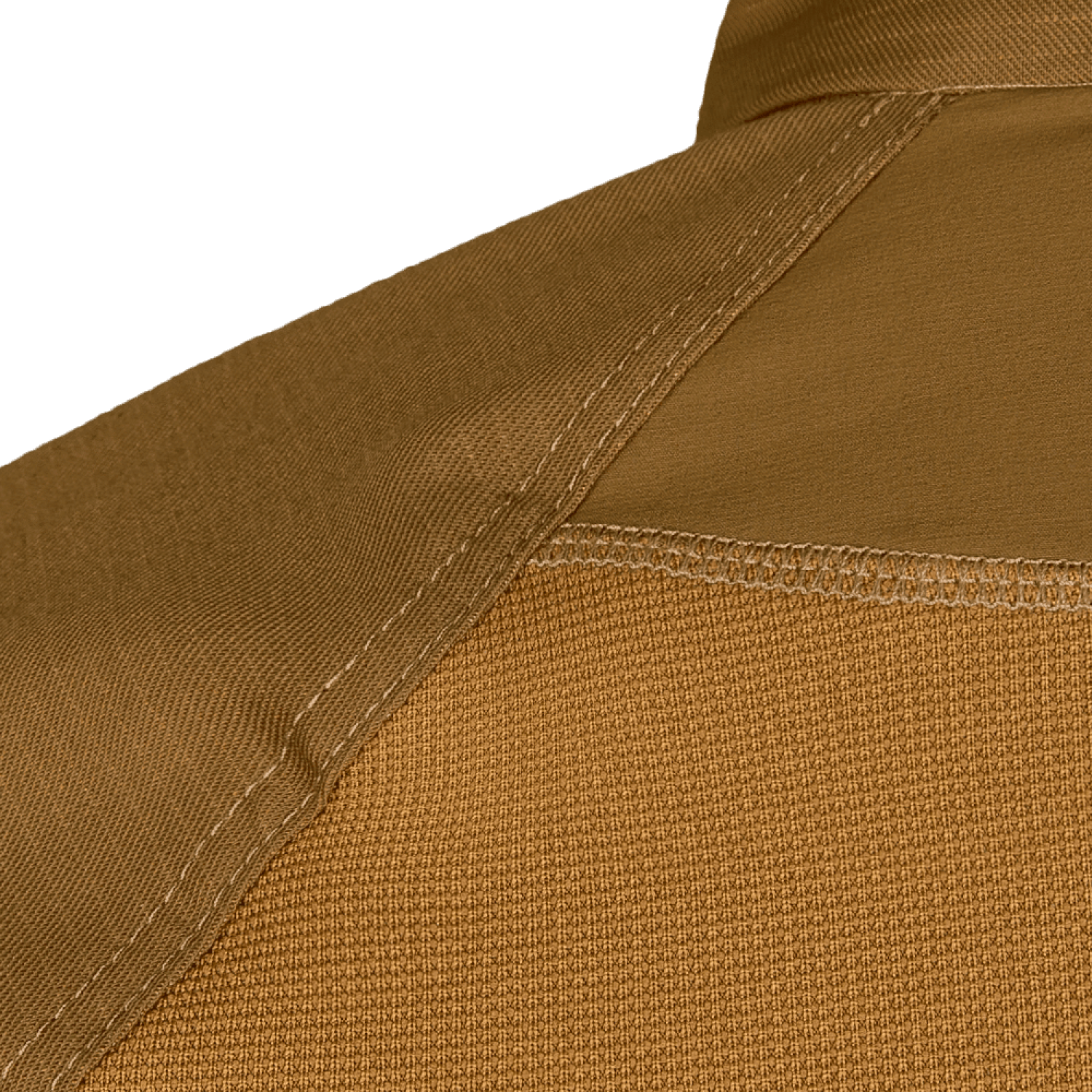 Бойова сорочка Camotec Raid 2.0 Twill/Coolpass Air 2.0 Койот вироблена з декількох дихаючих та зносостійких тканин. Комір з рукавами вироблені з тканини Twill. Це суміш поліестеру та бавовни. Це армована, зносостійка та гіпоалергенна тканина. Має вражаючі "дихаючі" властивості.