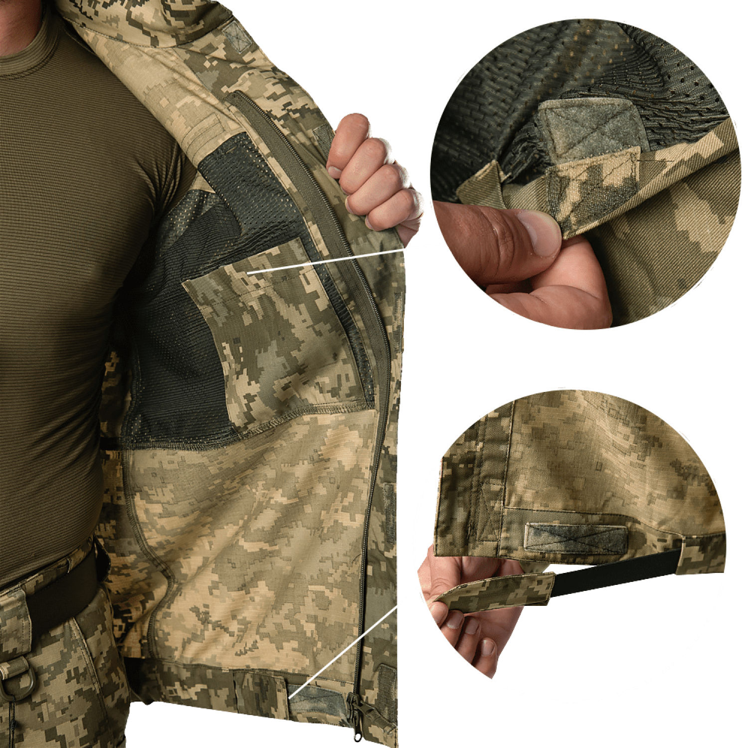 - З боків на рукавах присутні кишені з липучками під патчі та шеврони зверху.