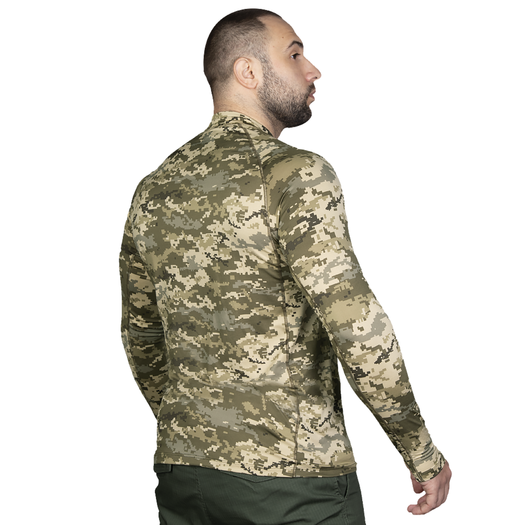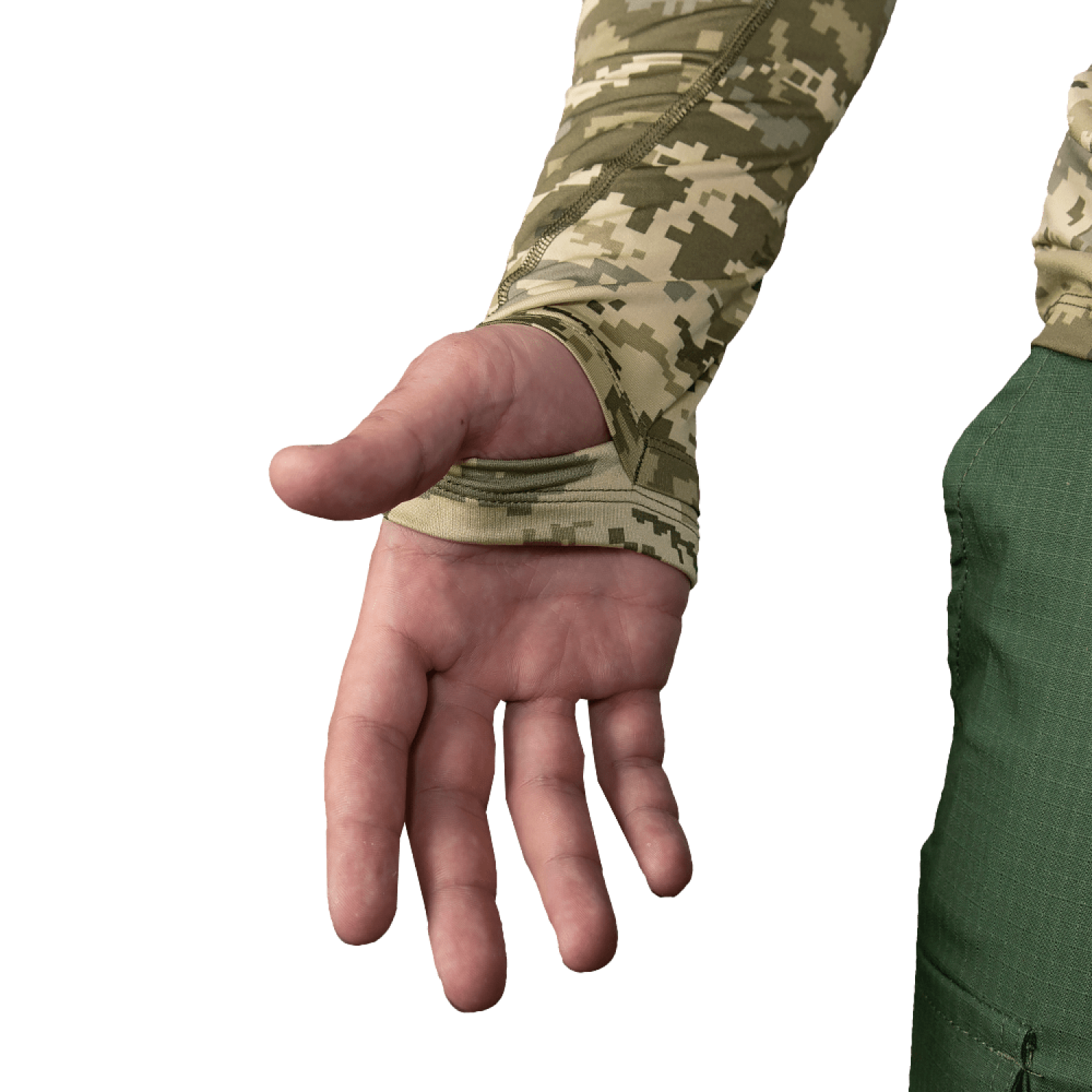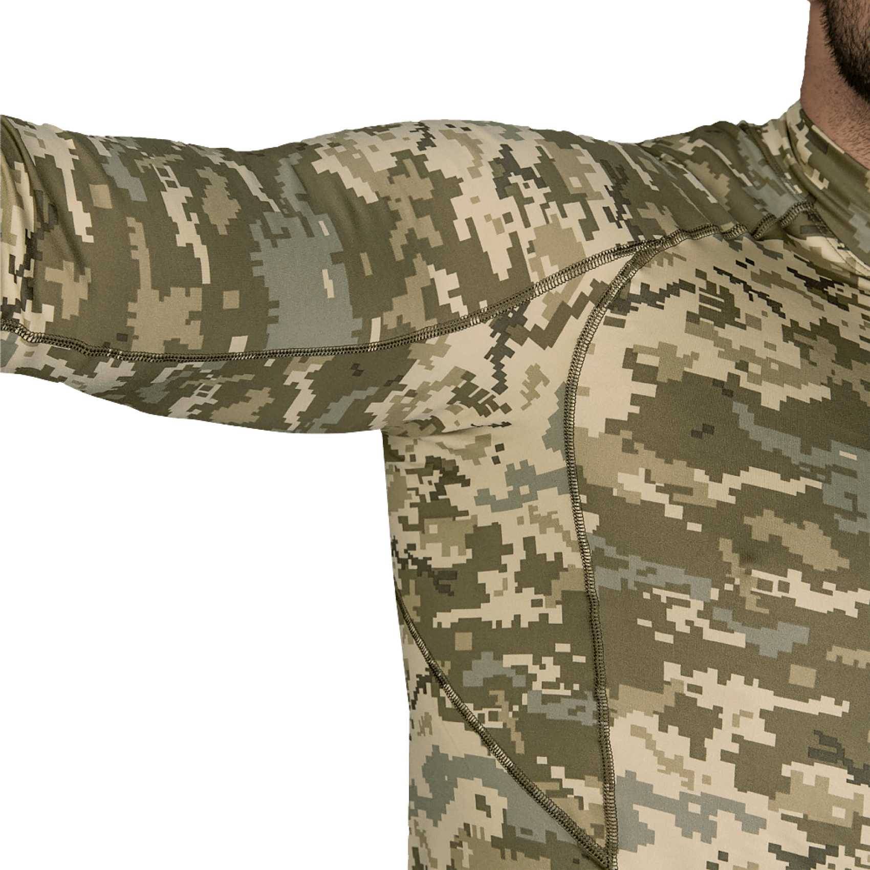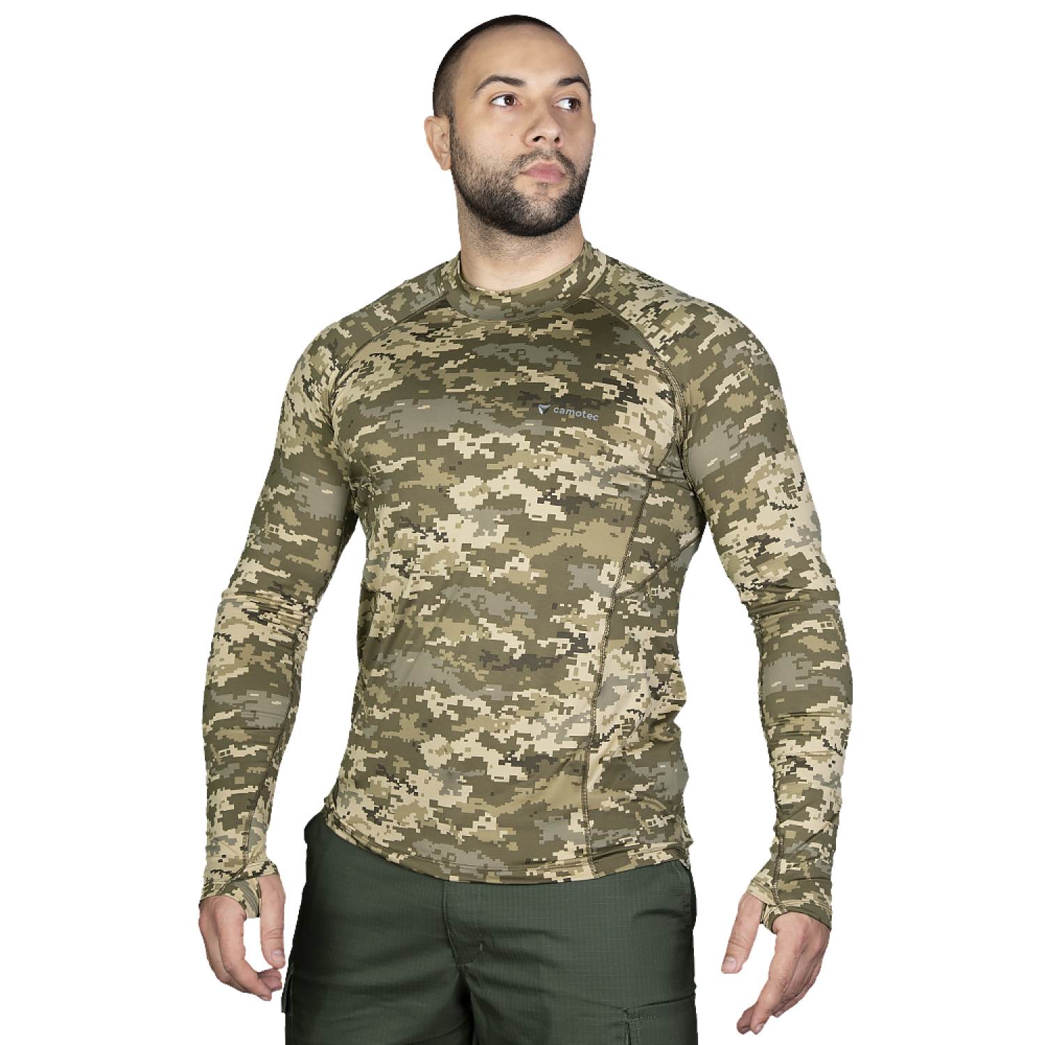 Дизайн лонгсліва Camotec Thorax Pro Піксель вирізняється сучасністю та функціональністю. Він спроектований для забезпечення максимальної свободи рухів і запобігання натиранню та подразненню шкіри. Висока горловина та спеціальні виточки під пахвами збільшують комфорт, а наявність отворів під пальці на манжетах запобігає скочуванню рукавів під час активних дій.
