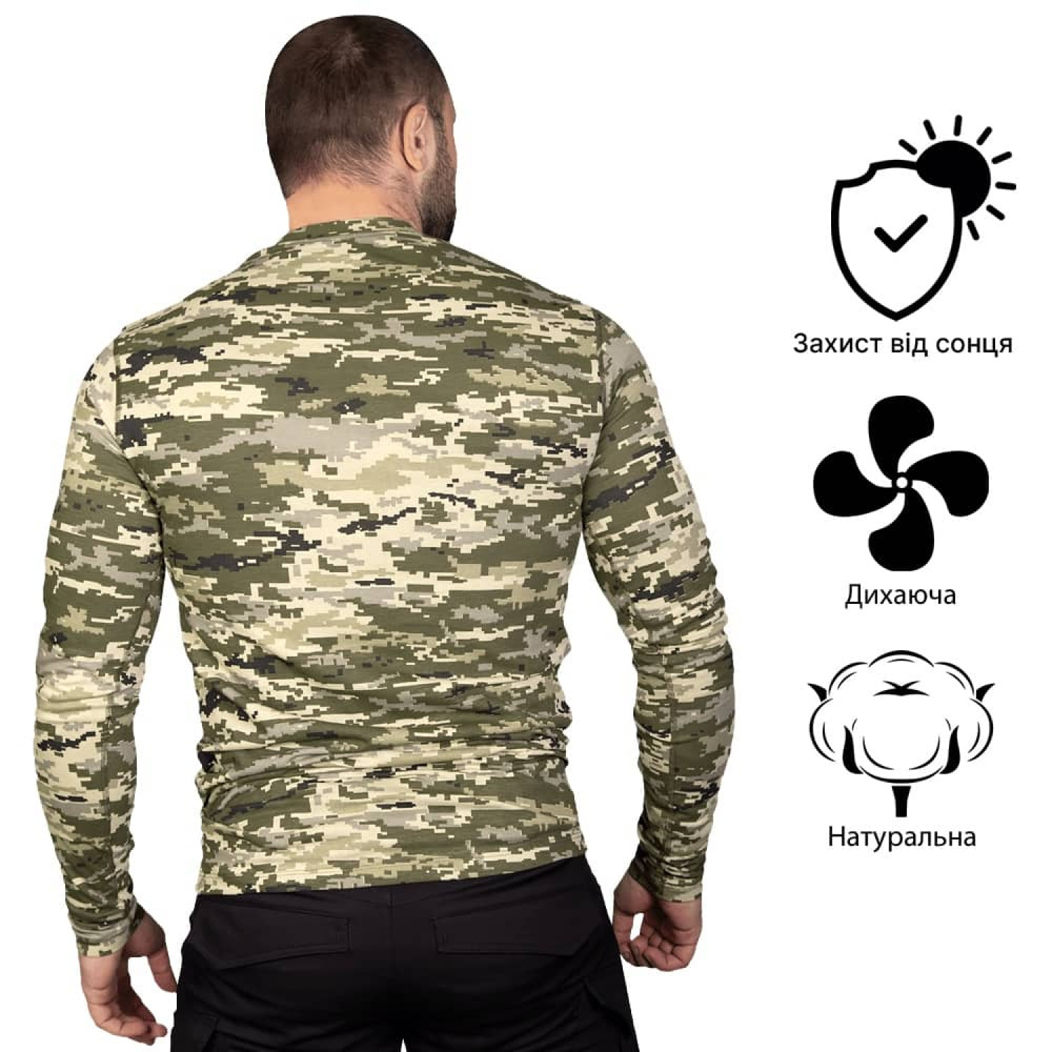 Лонгслів має ергономічний дизайн, з урахуванням анатомії людини, завдяки чому зручно лягає по тілу, та не сковує рухів. Виріб зшито міцною, ниткою, та має посилену плечову зону, що додає зносостійкості виробу.