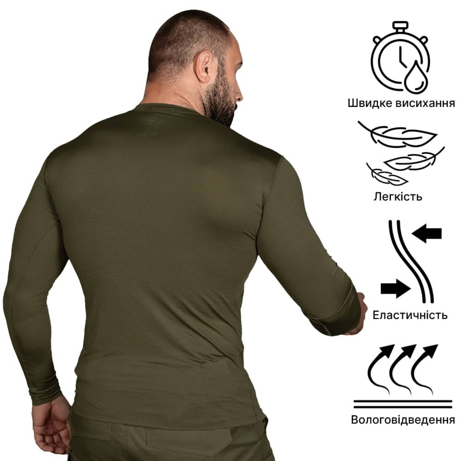 Лонгслів має, ергономічний дизайн, з урахуванням анатомії людини. Легкий та комфортний, не сковує рухів, не натирає при тривалій експлуатації.
