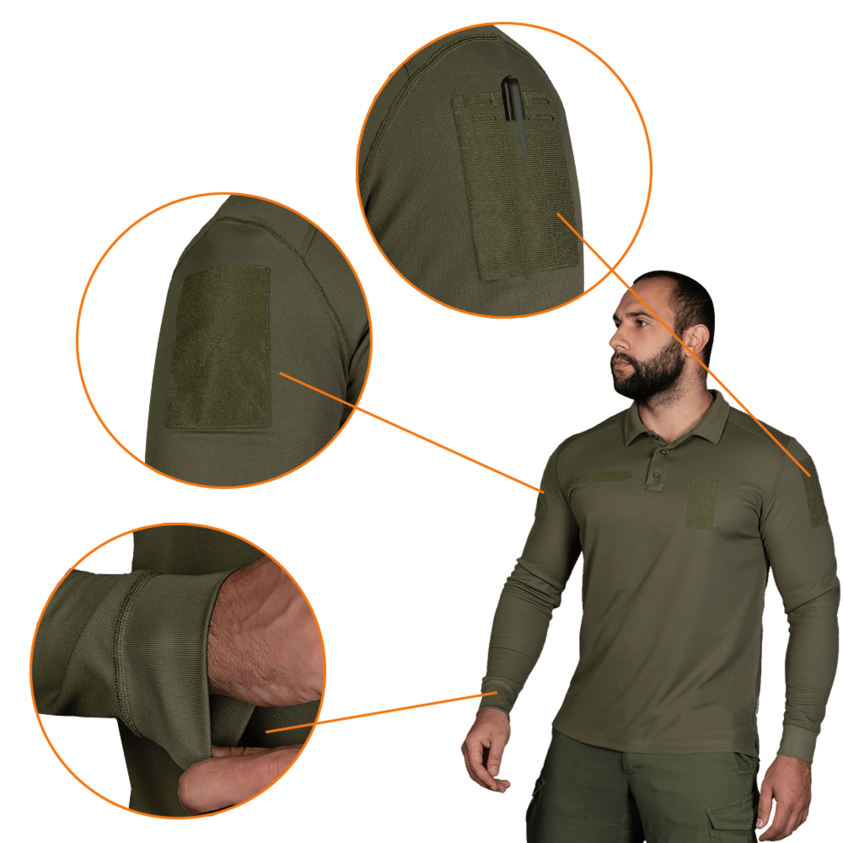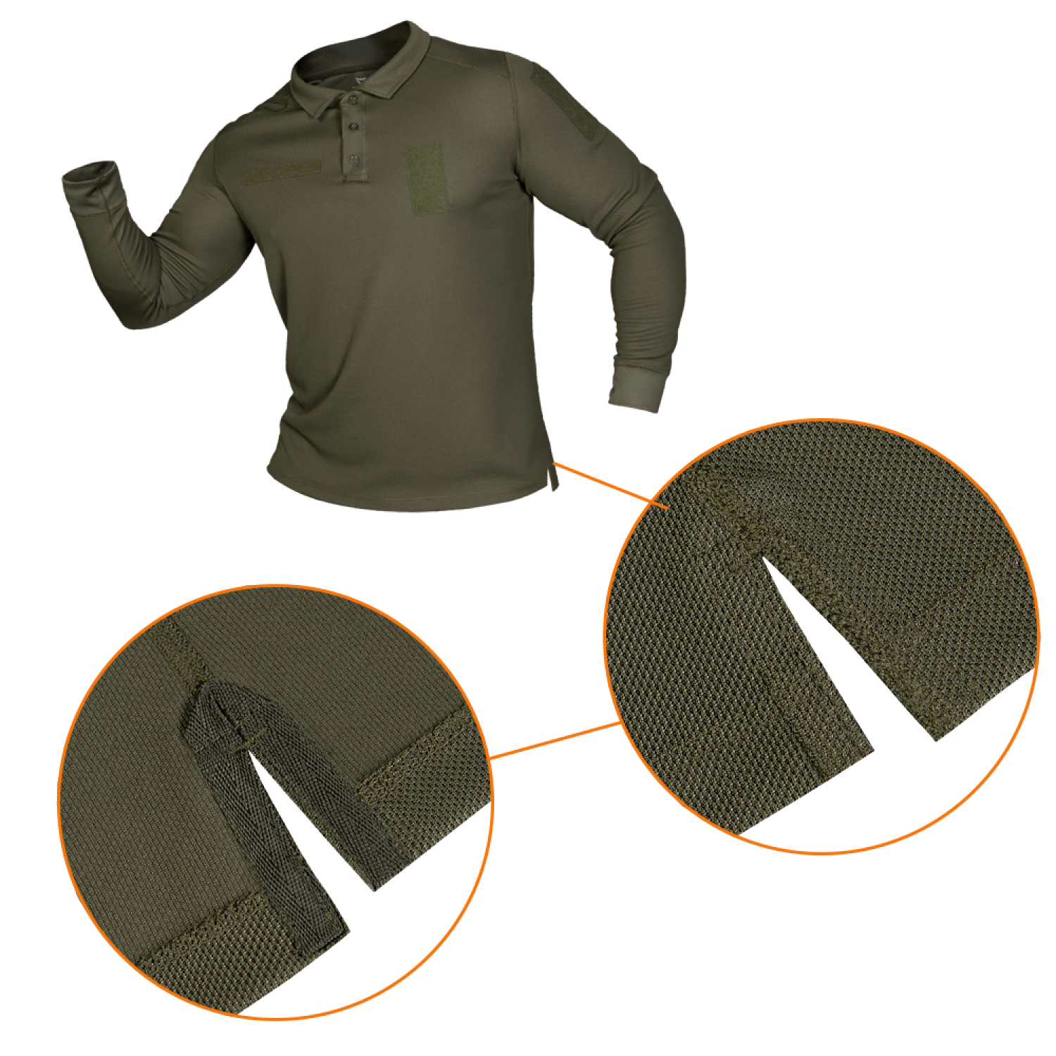 На рукавах і грудях передбачені спеціальні липучки для кріплення патчів і шевронів. Комір поло регулюється двома пластиковими ґудзиками.