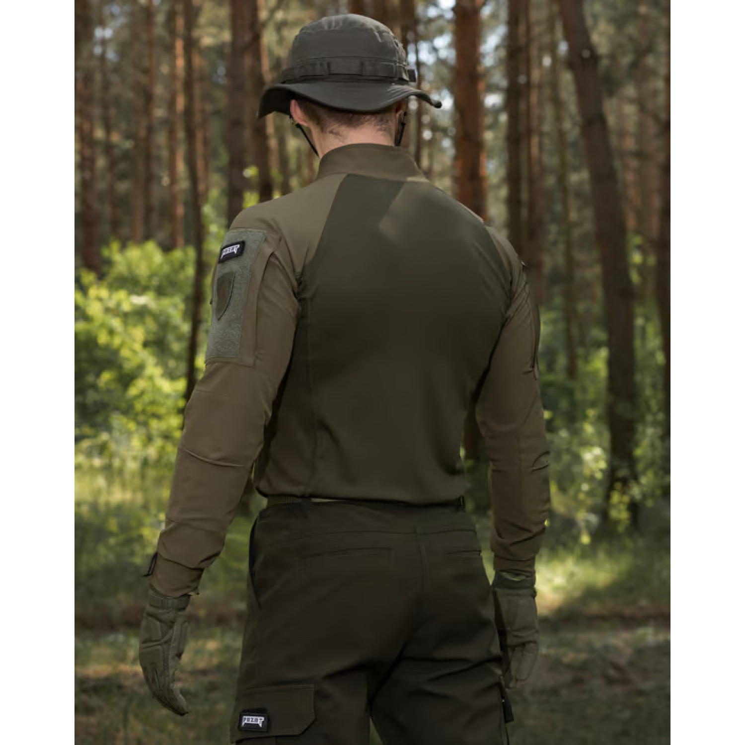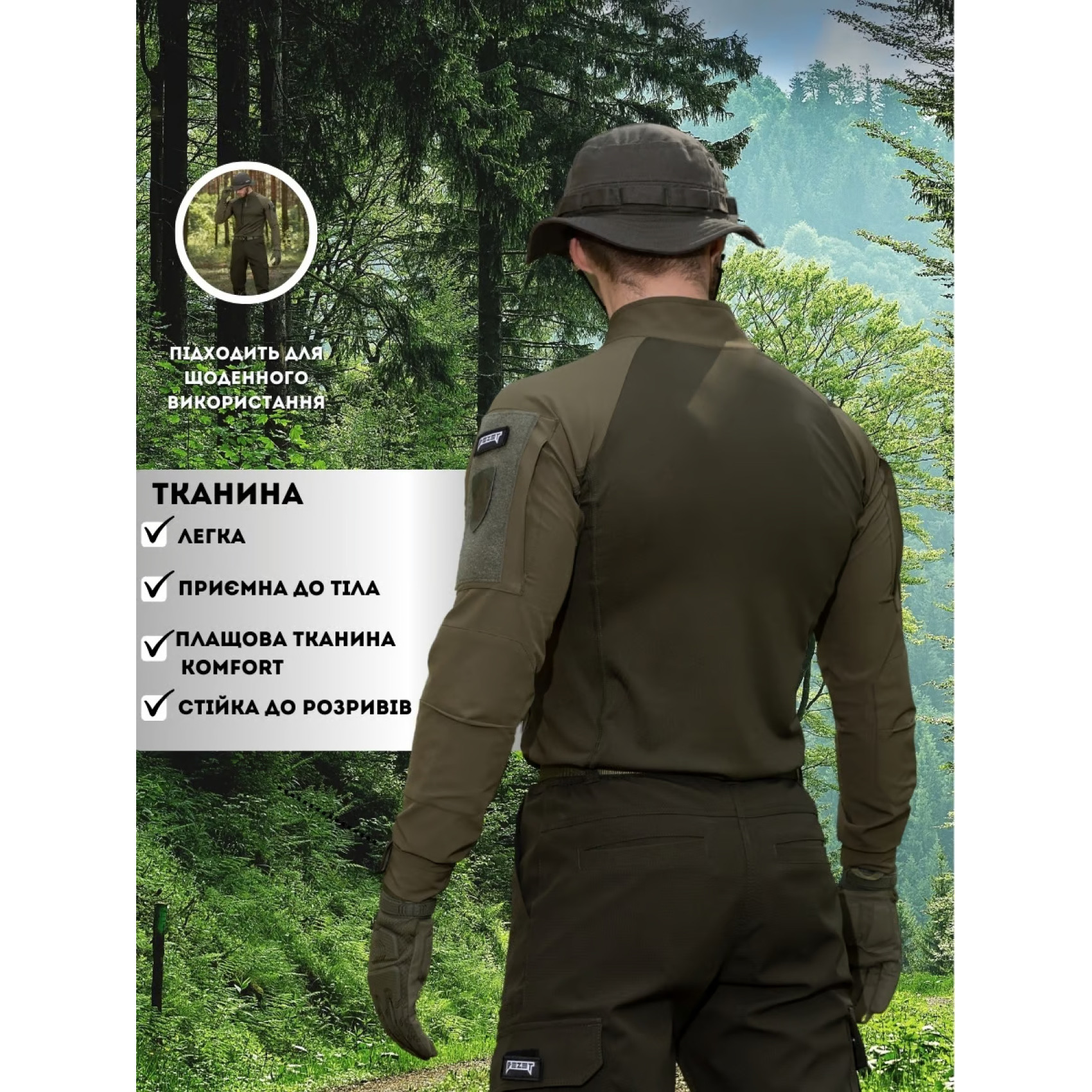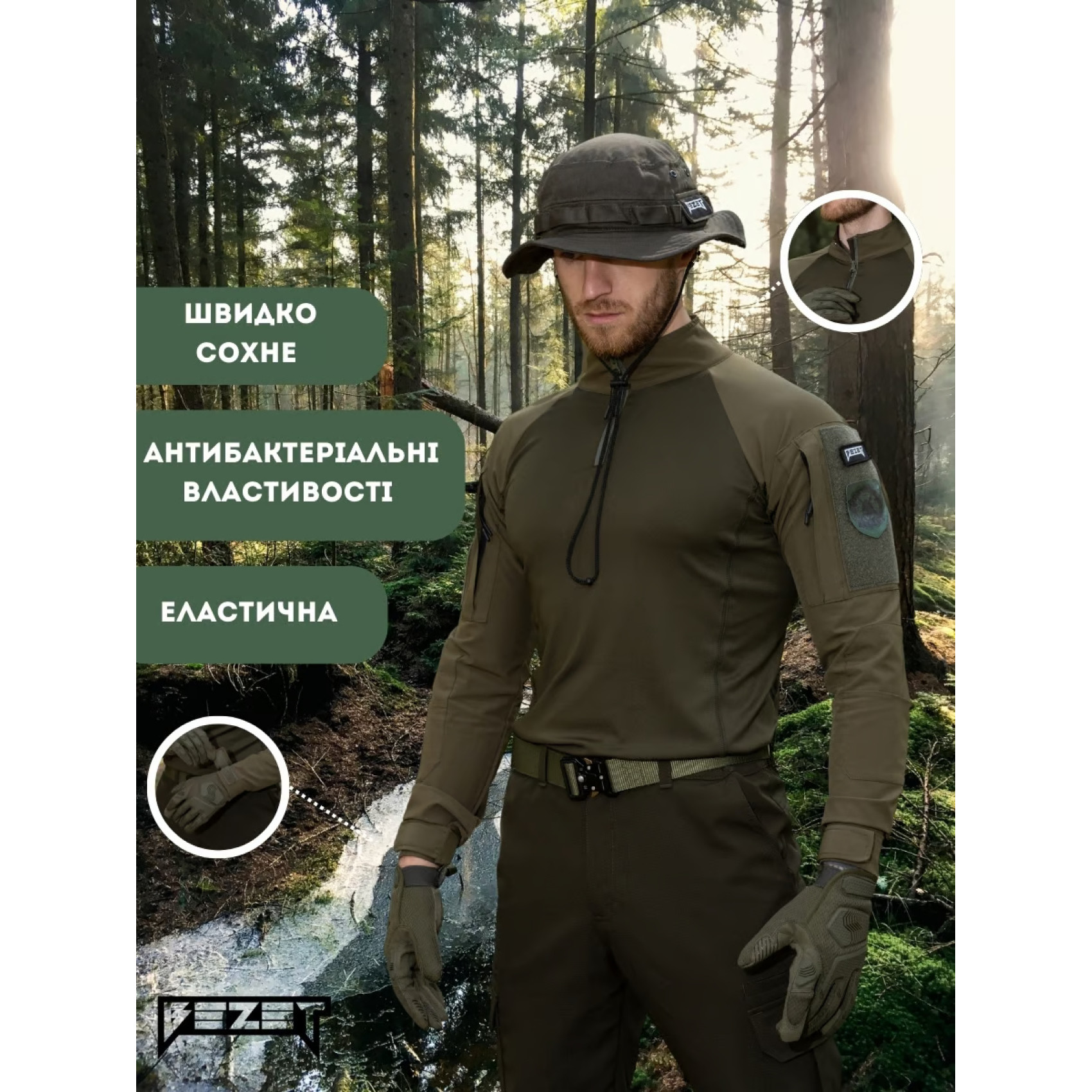 Сорочка тактична Bezet Combat Хакі прямого крою з довгим рукавом та високим коміром-стійкою. Основна частина сорочки виготовлена з лайкри, рукави та горловина - з плащової тканини Komfort. Особливістю лайкри є те, що вона швидко сохне, легко витирається, має антибактеріальні властивості, легка та приємна до тіла. В свою чергу Komfort має особливе подвійне плетіння "Double Weav" з ефектом механічного стрейчу в 4 сторони, що забезпечує свободу рухів. Також ця тканина стійка до розривів та зношення, присутнє водовідштовхуюче просочування, яке чудово захищає від вітру, піску, води і швидко сохне. Обидві тканини використовуються в пошитті одягу для людей що займаються спортом, туризмом, чи військовою справою.