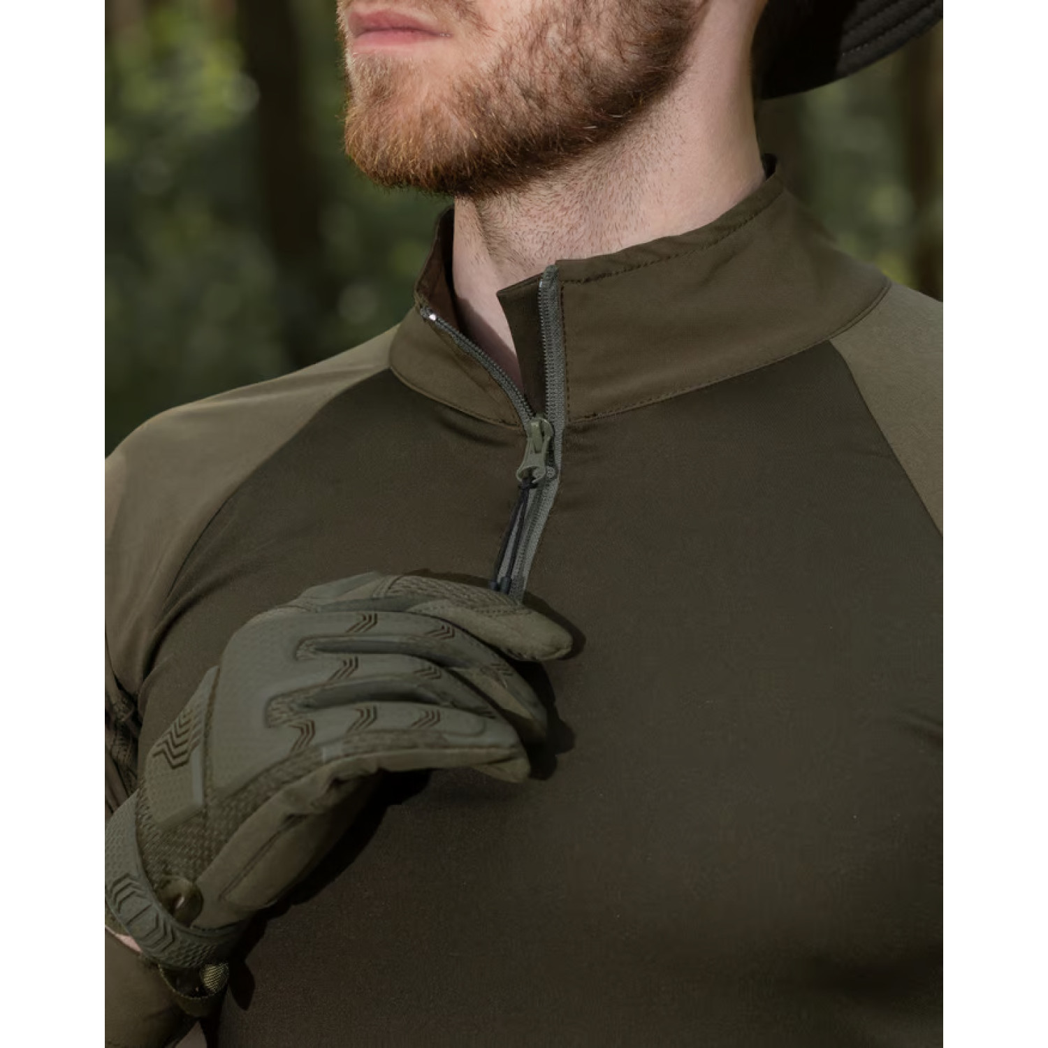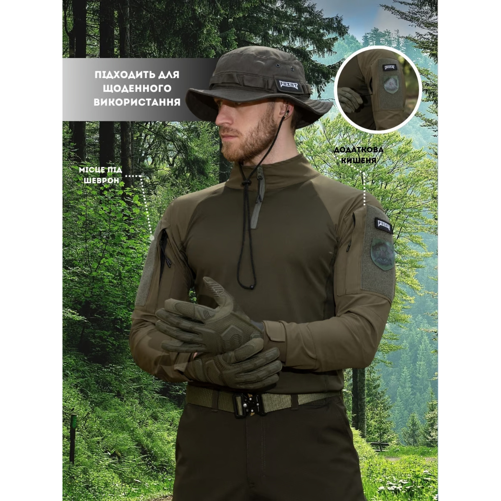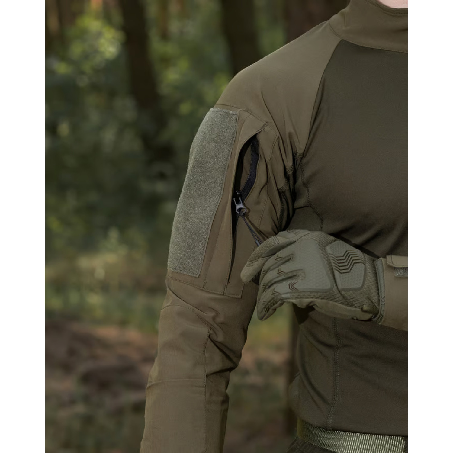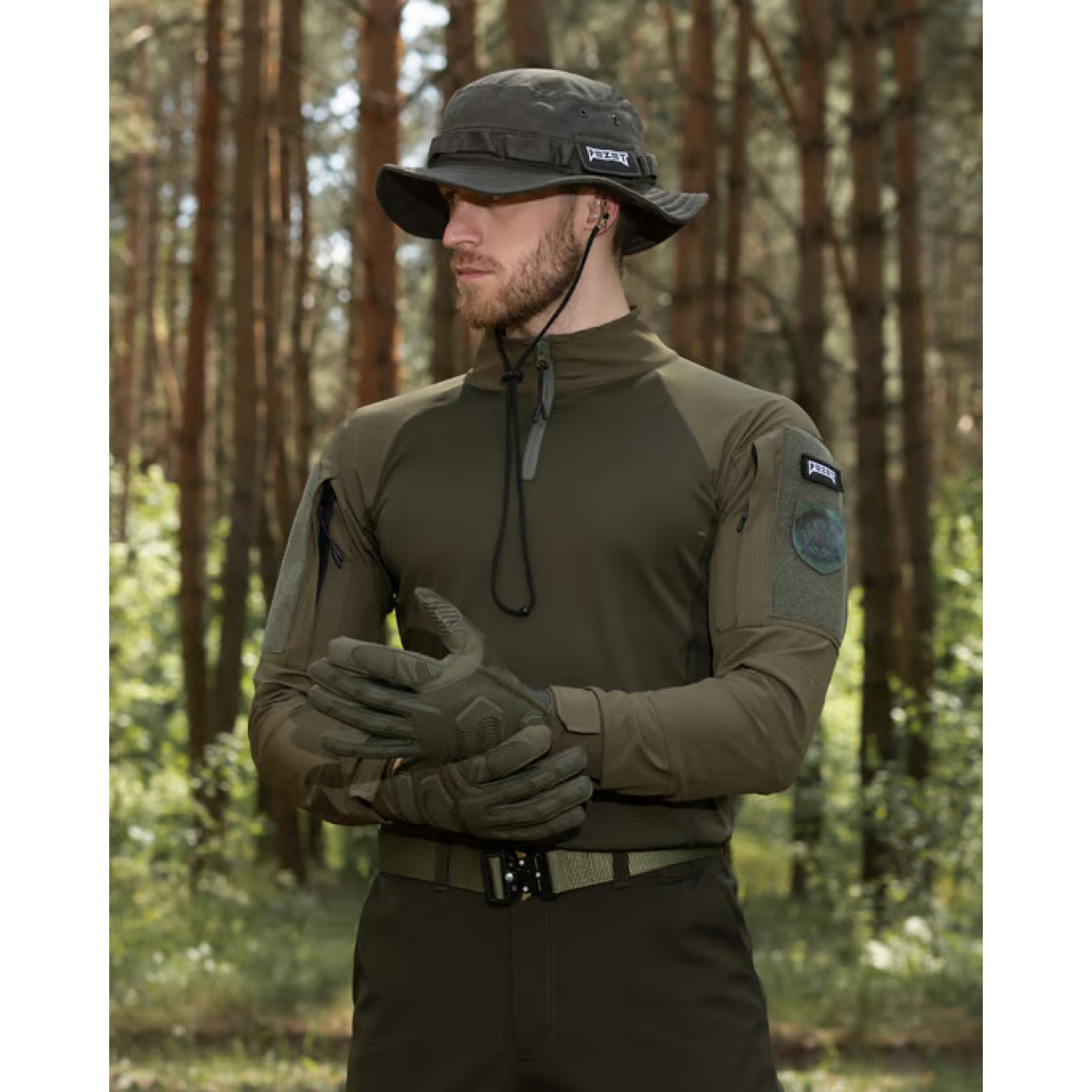 Сорочка тактична Bezet Combat Хакі прямого крою з довгим рукавом та високим коміром-стійкою. Основна частина сорочки виготовлена з лайкри, рукави та горловина - з плащової тканини Komfort. Особливістю лайкри є те, що вона швидко сохне, легко витирається, має антибактеріальні властивості, легка та приємна до тіла. В свою чергу Komfort має особливе подвійне плетіння "Double Weav" з ефектом механічного стрейчу в 4 сторони, що забезпечує свободу рухів. Також ця тканина стійка до розривів та зношення, присутнє водовідштовхуюче просочування, яке чудово захищає від вітру, піску, води і швидко сохне. Обидві тканини використовуються в пошитті одягу для людей що займаються спортом, туризмом, чи військовою справою.