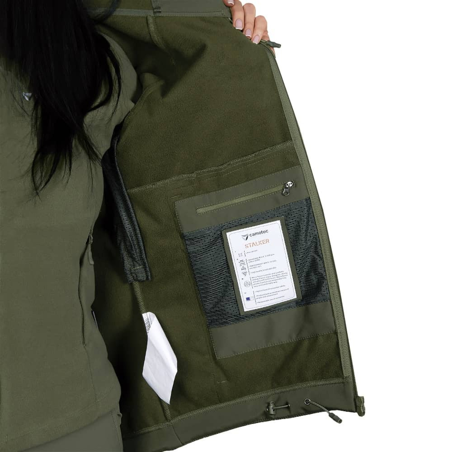 Жіноча куртка Camotec Stalker SoftShell Олива це легка, сучасна тканина зі справжньою безпоровою мембраною, яка складається з трьох шарів: мікрофліс який зберігає тепло; мембрана що захищає від вітру та вологи; еластичний поліестер із вологостійким просоченням, який захищає від пилу, бруду й вологи.