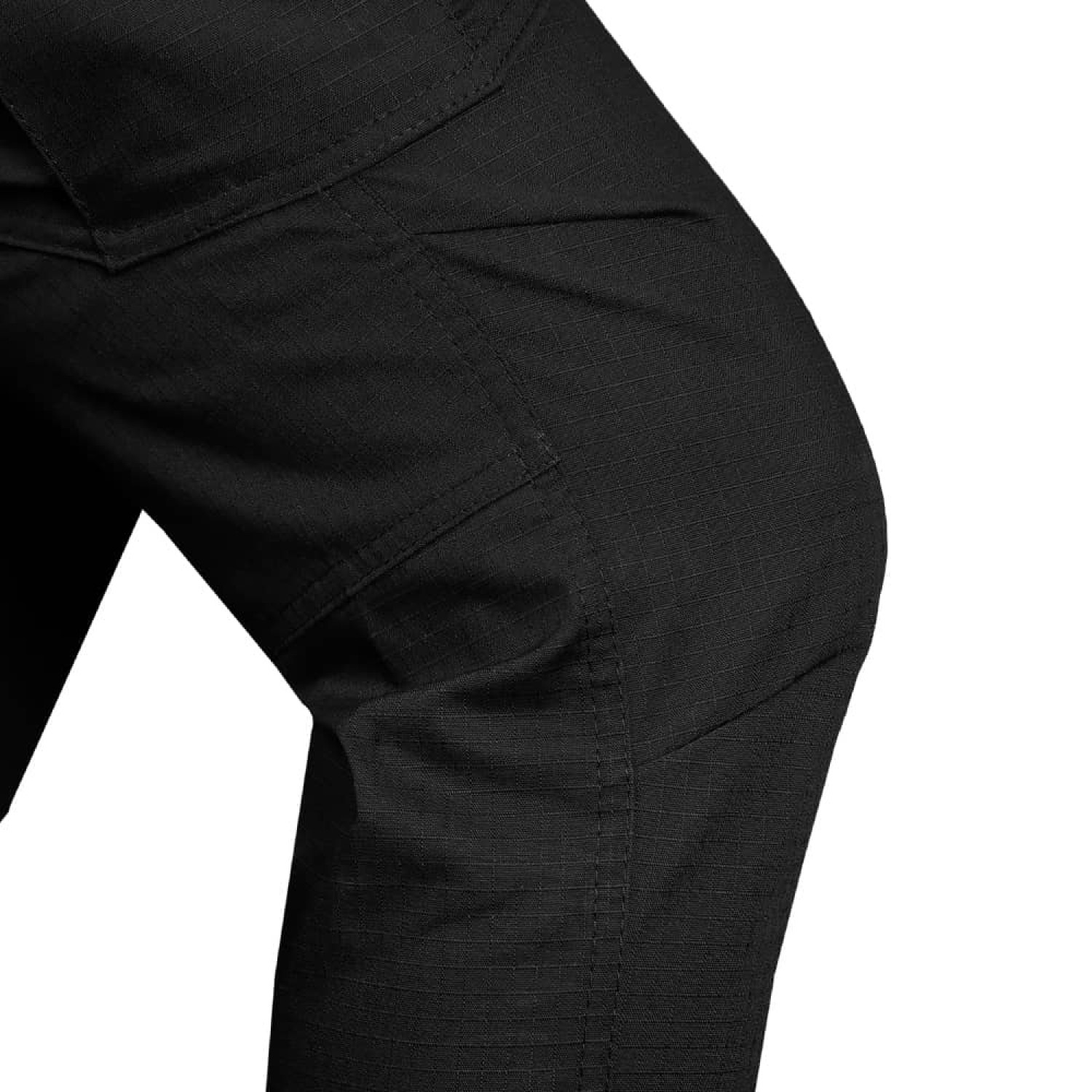 Модель штанів виготовлена з армованої, гіпоалергенної тканини Rip-Stop Flex. Це суміш поліестеру, бавовни та еластану, яка поєднує в собі міцність, еластичність та гіпоалергенні властивості. Ця тканина має спеціальне плетіння, що запобігає поширенню розривів, утворенню дрібних отворів та допомагає зберігати її форму під час експлуатації.