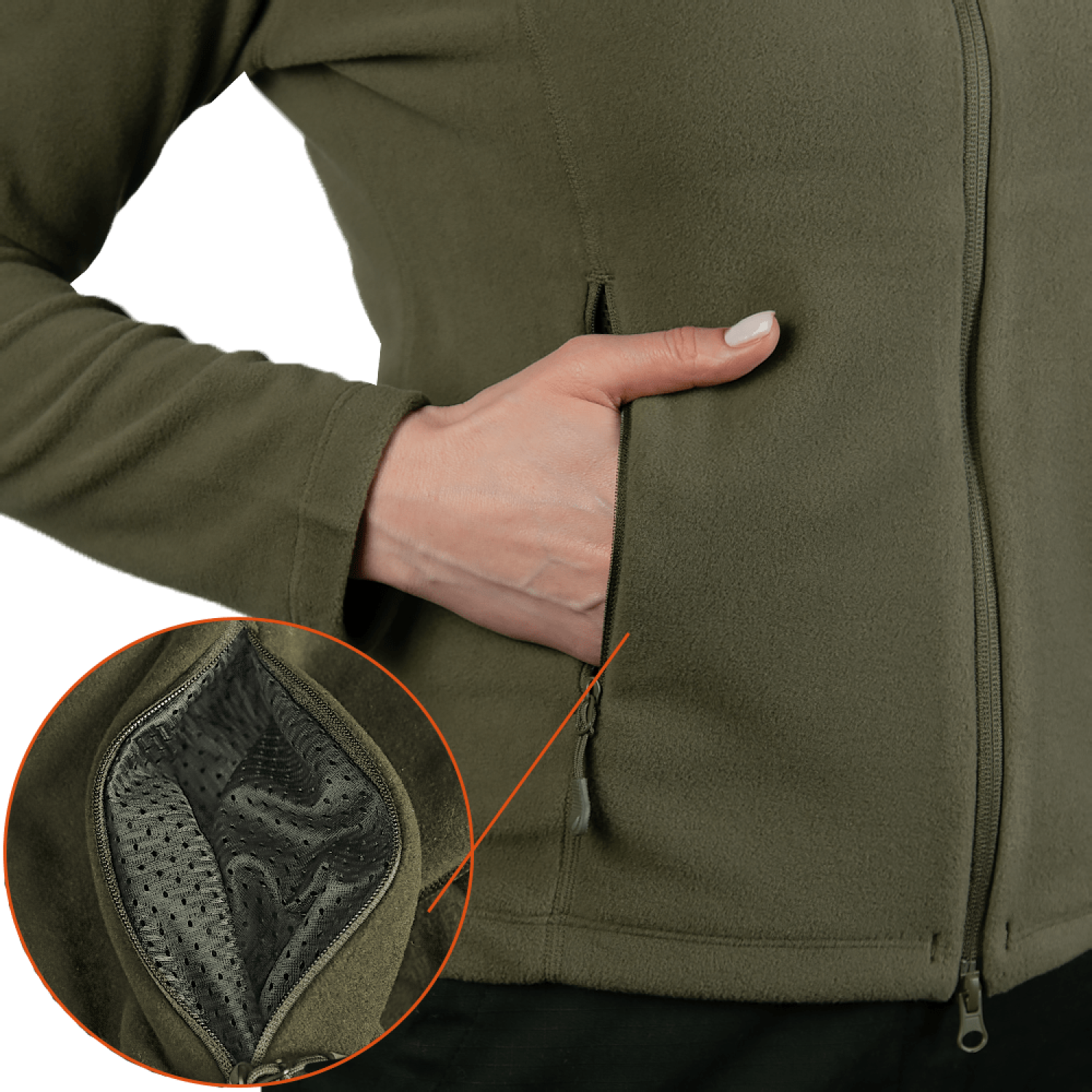 Крій кофти виконаний з урахуванням особливостей жіночої фігури, забезпечуючи комфорт і свободу рухів. Застосування технології плоских швів робить кофту міцнішою та комфортнішою під час тривалого носіння. Дві кишені на блискавках з вентиляційними сітками всередині і два "бігунки" на центральній блискавці забезпечують зручність використання, навіть при носінні рукавичок.