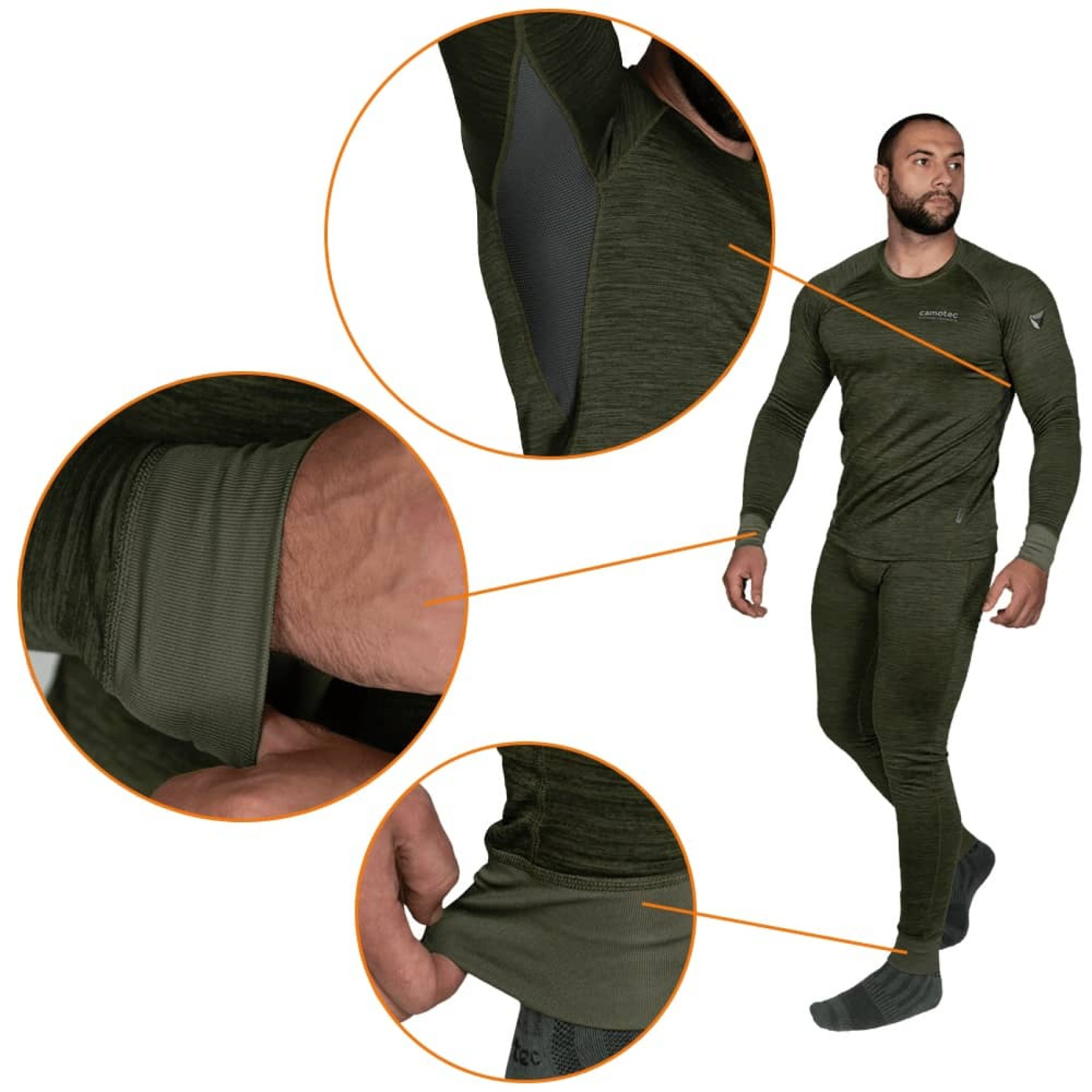 Термобілизна Camotec Polarheat QS Pro 2.0 Олива Меланж має покращений крій, а також додані еластичні манжети з тканини CoolPass Ribana на рукавах та по низу штанів.