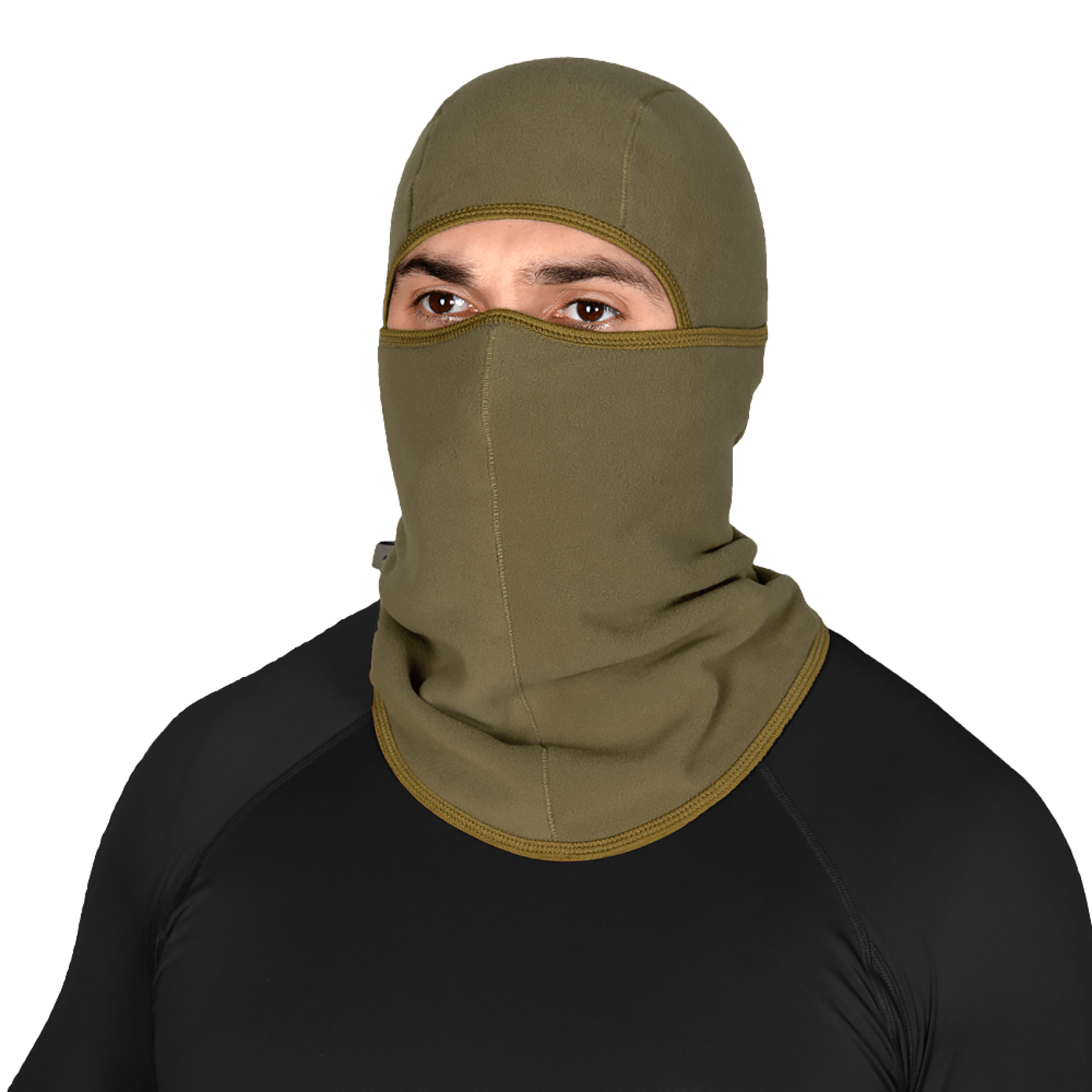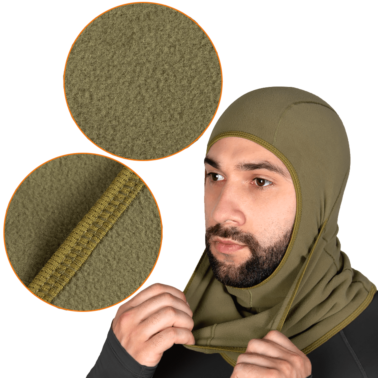 - Загальна частина балаклави вироблена з тканини Himatec (100 series). Це легка тканина яка ефективно утримує тепло та має відмінну вентиляцію. За рахунок фактури тканини утворюються повітряні прошарки, які забезпечують додаткове утримання тепла. Тканина швидко сохне, відводить вологу, а також має антибактеріальне просочення що запобігає утворенню та розповсюдженню бактерій.