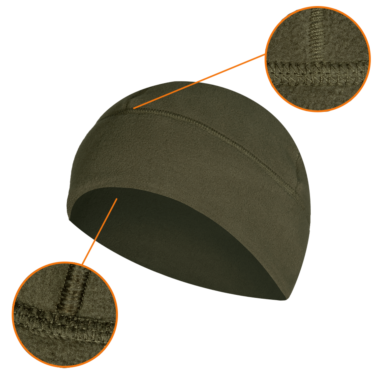 Шапка вироблена з нової серії флісу Himatec Pro (200 series) - пухка та дуже приємна на дотик тканина, яка затримує дуже багато тепла, при малій вазі. За рахунок фактури тканини утворюються повітряні прошарки, які забезпечують ефективне утримання тепла. Тканина добре дихає, відводить вологу, швидко сохне, а також має антибактеріальне просочення що запобігає утворенню та розповсюдженню бактерій.