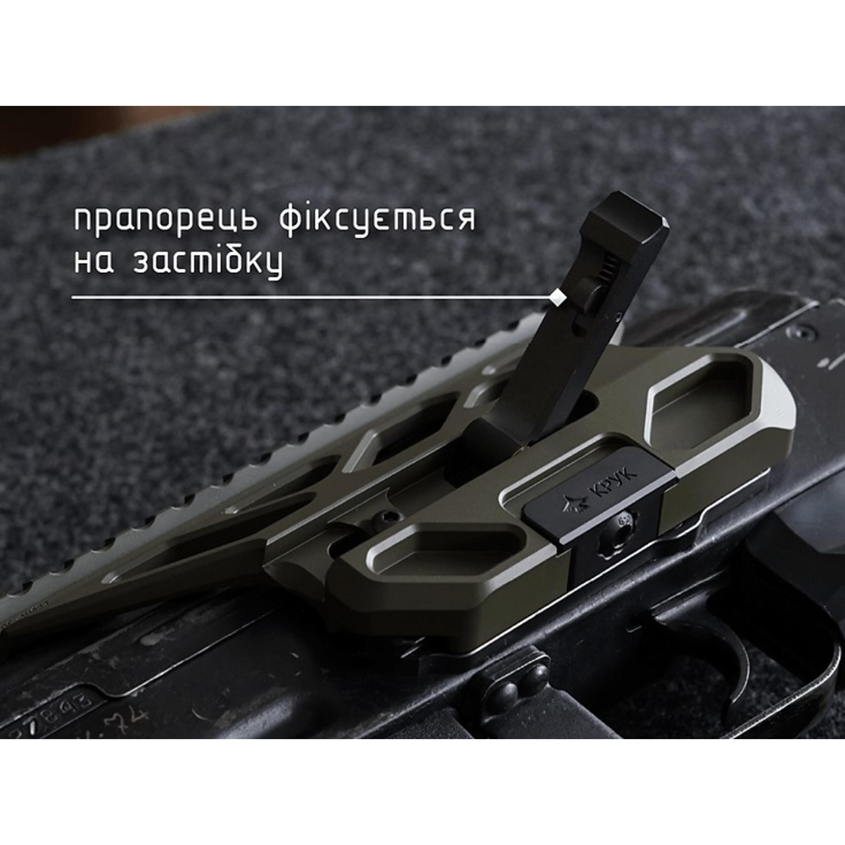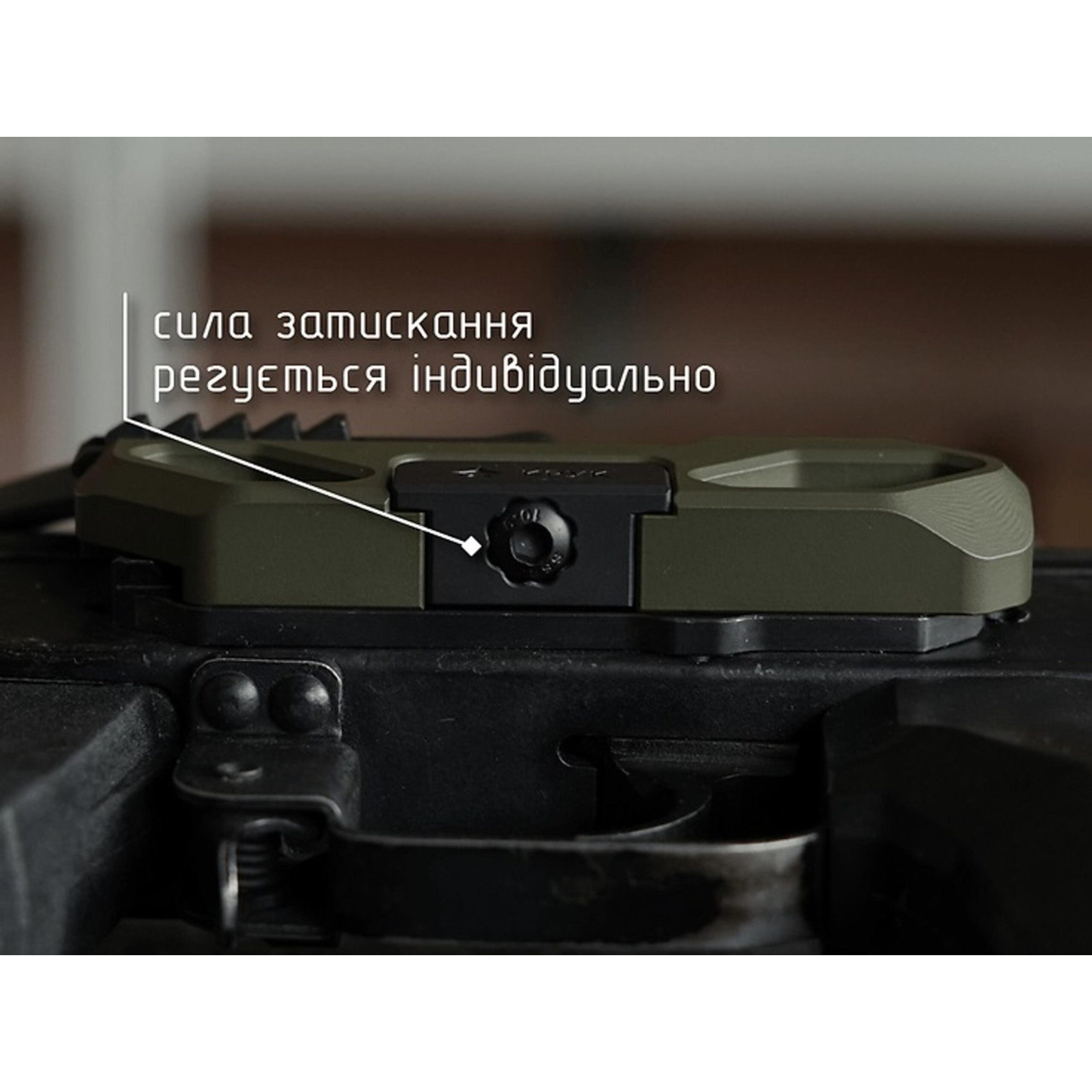 - Швидкий доступ до кришки та механічних прицільних – кронштейн встановлюється та зніміється завдяки замку та зажиму, без додаткового інструменту.