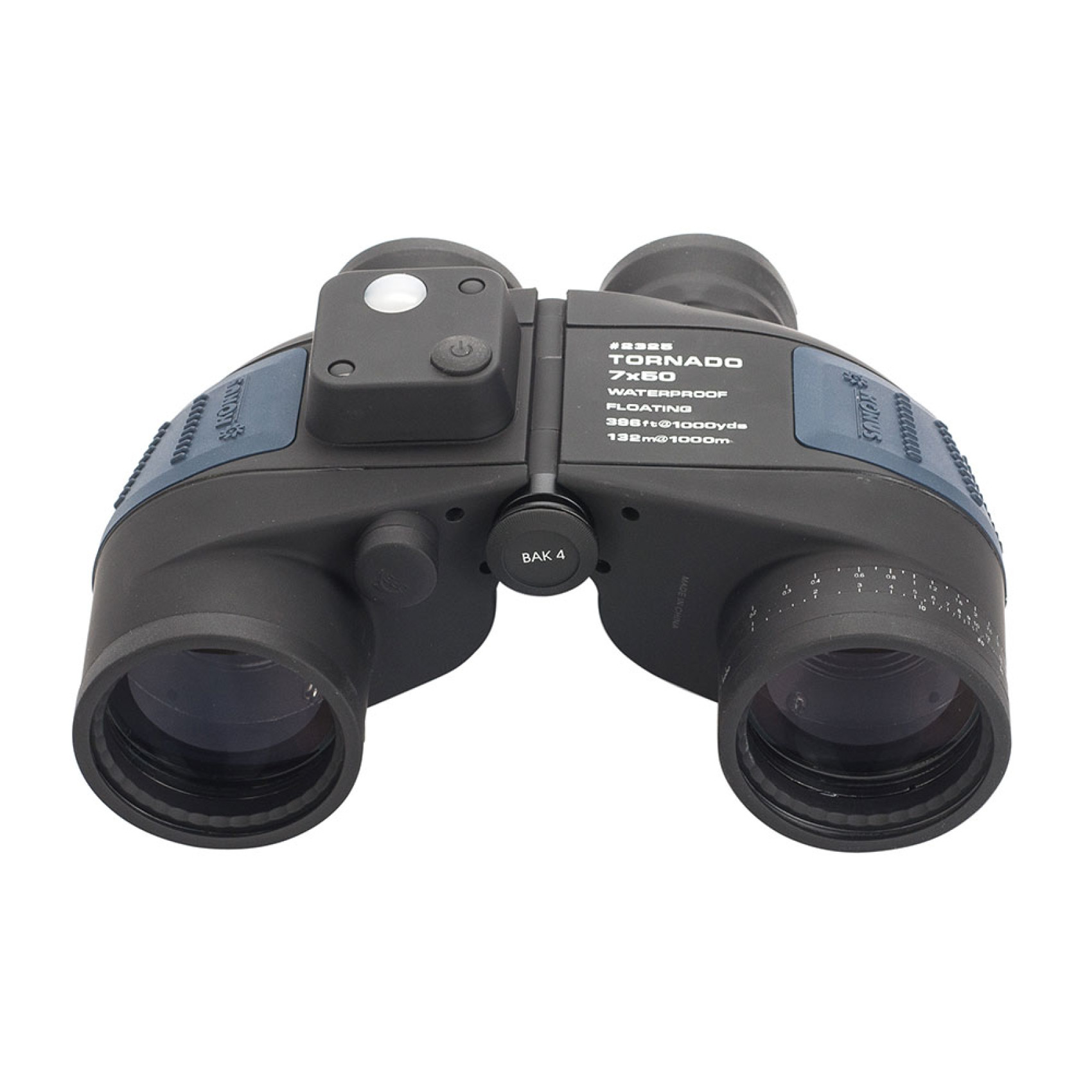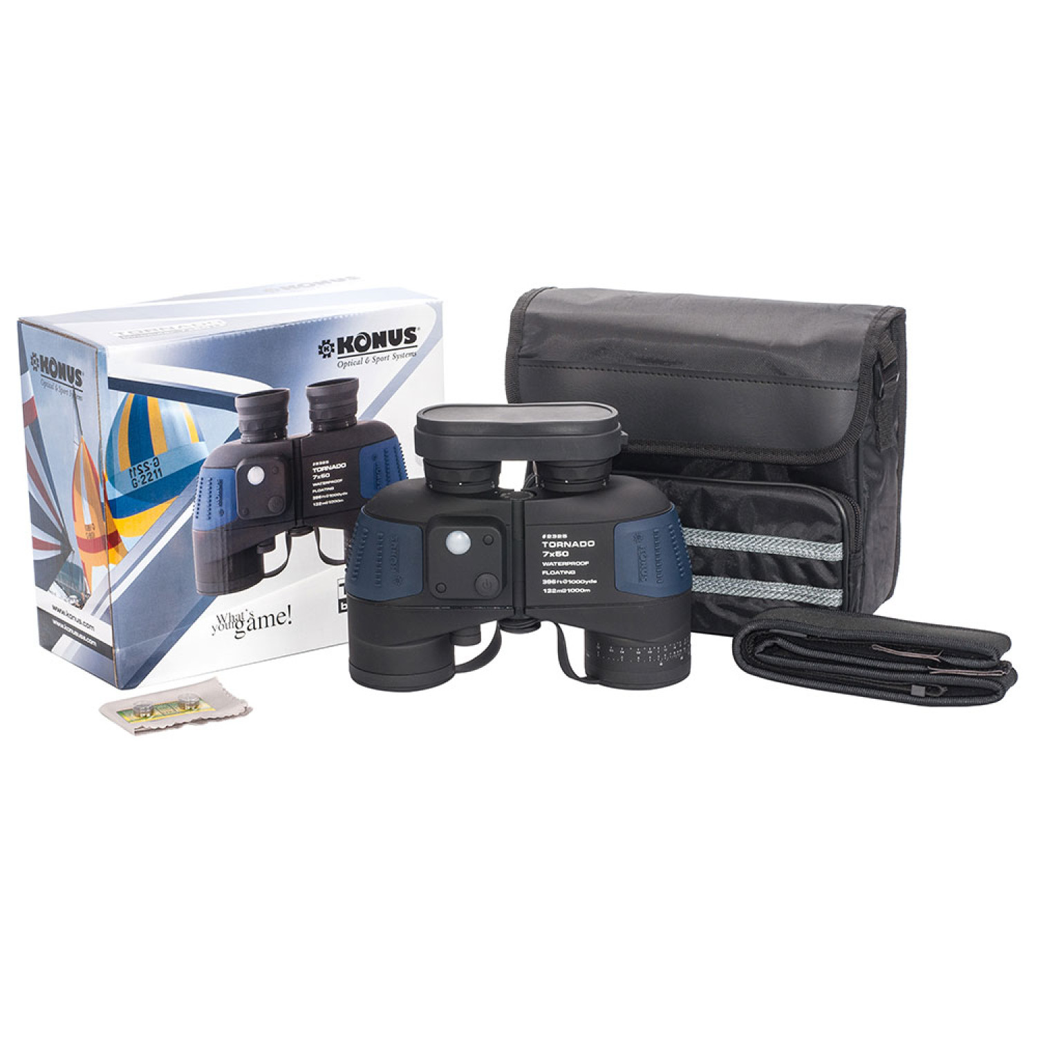 Бінокль KONUS TORNADO 7x50 Чорний - це морський тактичний прилад із кратністю збільшення 7х і об'єктивом діаметром 50 мм. Він призначений для експлуатації в екстремальних умовах і відмінно справляється навіть за слабкого освітлення, забезпечуючи яскраве і контрастне зображення. Вбудований компас із підсвічуванням і далекомірна сітка дають змогу візуально оцінювати відстані та розміри об'єктів. Для роботи підсвічування використовуються стандартні міні-батарейки LR44 («таблетки»).