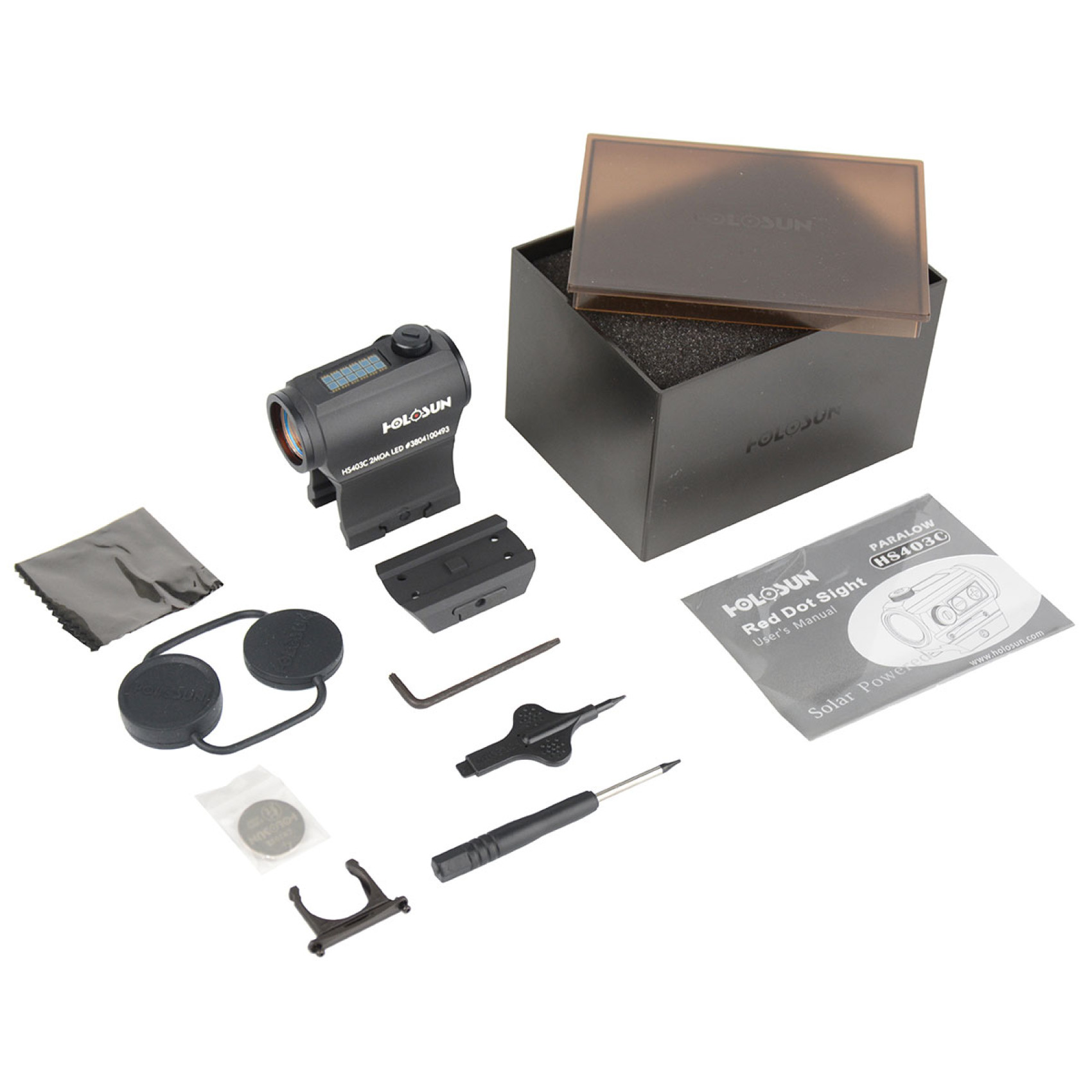 Коліматорний приціл HOLOSUN HS403C - це сучасний приціл, що працює на сонячних панелях і має герметичний корпус з алюмінієвого сплаву 6061. Прицільна точка, що має розмір 2 МОА, пофарбована в червоний колір. Ключовою особливістю цієї моделі є можливість комбінованого живлення як від сонячної панелі, так і від батареї, а також електронне управління яскравістю підсвічування, яке пропонує 12 рівнів (перші два рівні оптимізовано для роботи в нічних умовах або з ПНБ). Освітлення реалізовано на базі фірмового світлодіода, який забезпечує енергоефективність і можливість роботи до 50 000 годин на одній батареї (CR2032). Корпус прицілу захищений за стандартом IP67, а внутрішній простір заповнений інертним газом, що запобігає запотіванню. Стійкість до віддачі підтверджена тестами на ударостійкість із навантаженням до 1000 G. У комплекті з коліматором йдуть як високе, так і низьке кріплення на планку Вівер/Пікатінні, що робить його сумісним з більшістю видів зброї.