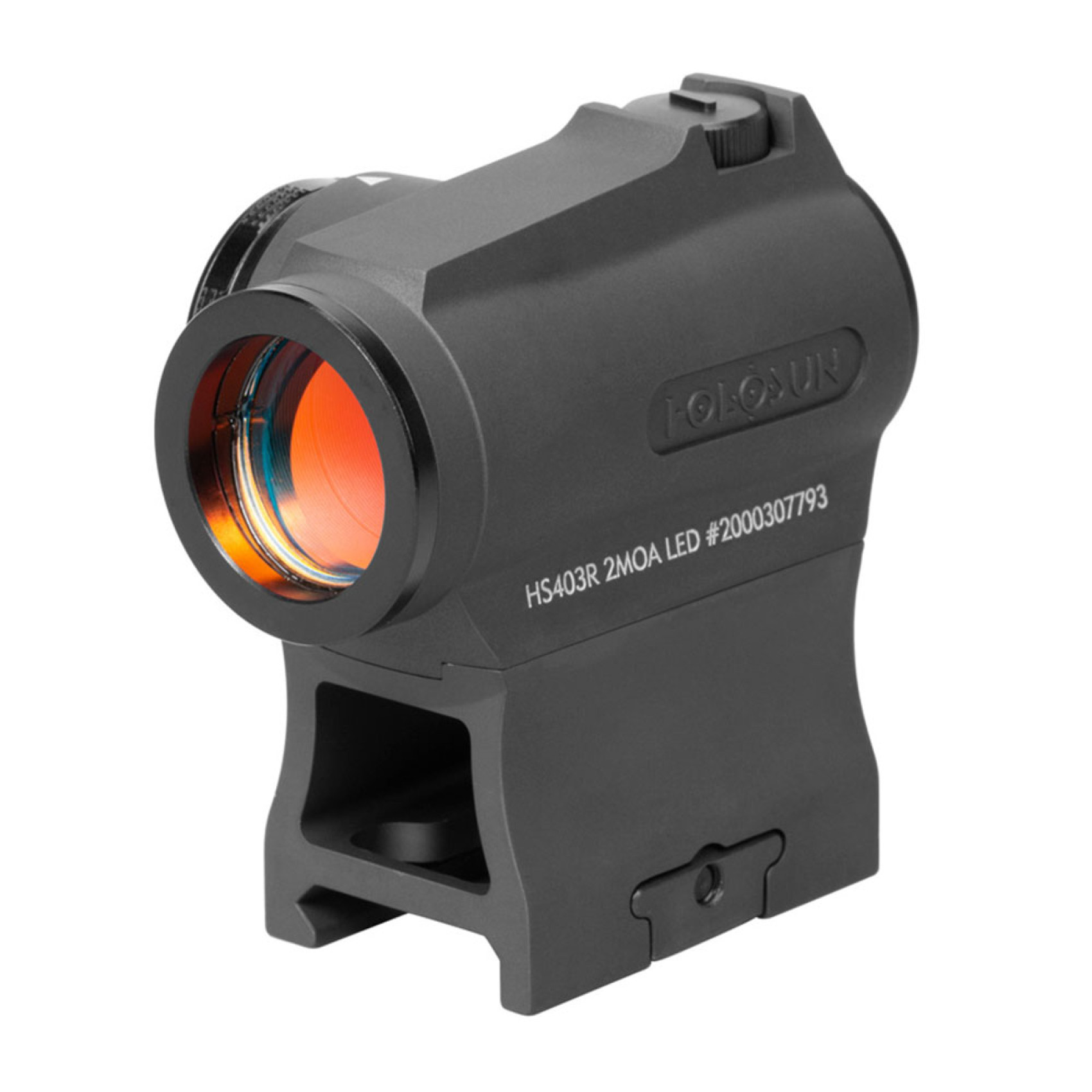 Коліматорний приціл HOLOSUN HS403R є пристроєм закритого типу з червоною прицільною точкою 2 МОА і зручним поворотним диском для регулювання яскравості підсвічування. Цей приціл виготовлений у герметичному корпусі з алюмінієвого сплаву 6061, заповненого газом, і відповідає стандарту захисту IP67. Освітлення реалізовано з використанням спеціального світлодіода, що забезпечує його енергоефективність і дає змогу працювати до 100 000 годин на одній батареї (CR2032). Модель пропонує 12 рівнів яскравості, з яких перші два призначені для використання в темний час доби або з нічними прицілами. Коліматор йде в комплекті з високими і низькими кріпленнями на планку Вівер/Пікатінні, що дає можливість встановлення на більшість типів зброї. Стійкість до віддачі підтверджена тестами на ударостійкість із навантаженням до 1000 G.