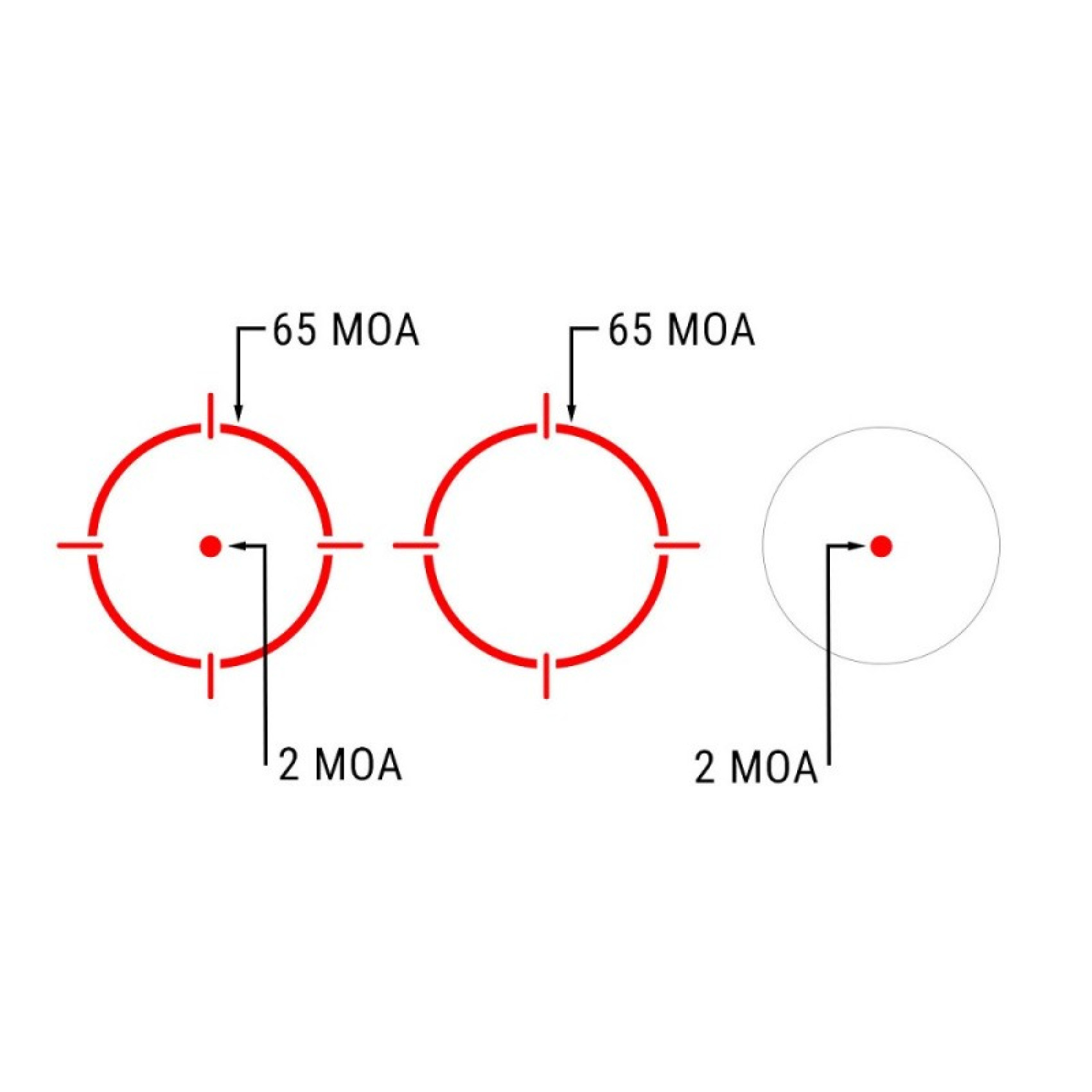 - Прицільна марка змінна: коло 65 МОА з точкою 2 МОА / коло 65 МОА / точка 2 МОА