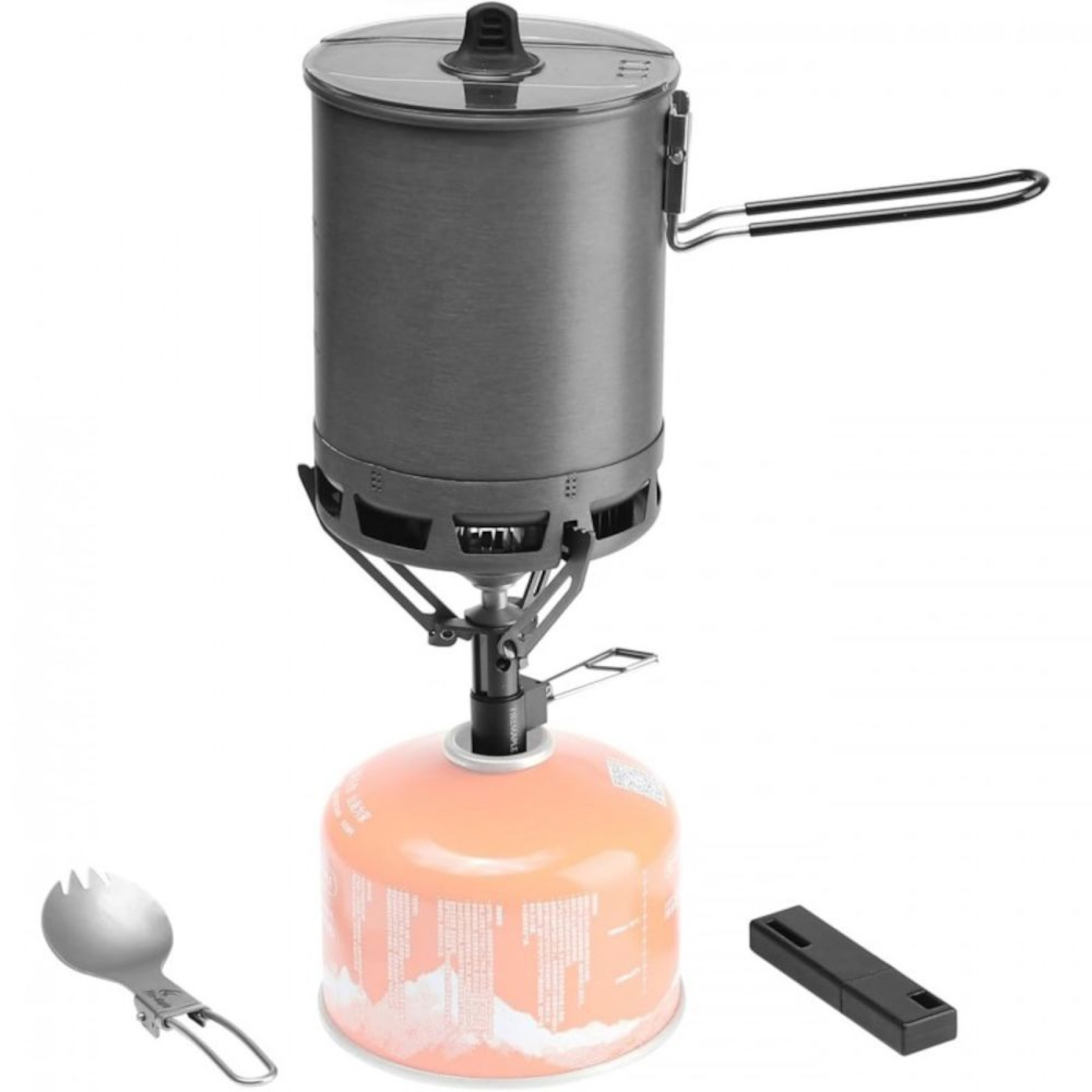 Цей набір стане чудовим вибором для туристів, які цінують легкість спорядження і при цьому шукають універсальний пальник для роботи з різним похідним посудом. Казанок, що входить до комплекту, має три прорізи в теплообміннику, що дає змогу надійно встановлювати його на більшість туристичних пальників із трьома підпорами, забезпечуючи високу стійкість. Така конструкція мінімізує ризик перекидання казанка при випадковому русі. Під час кип'ятіння води на нерівній поверхні казанок потребує меншої уваги.